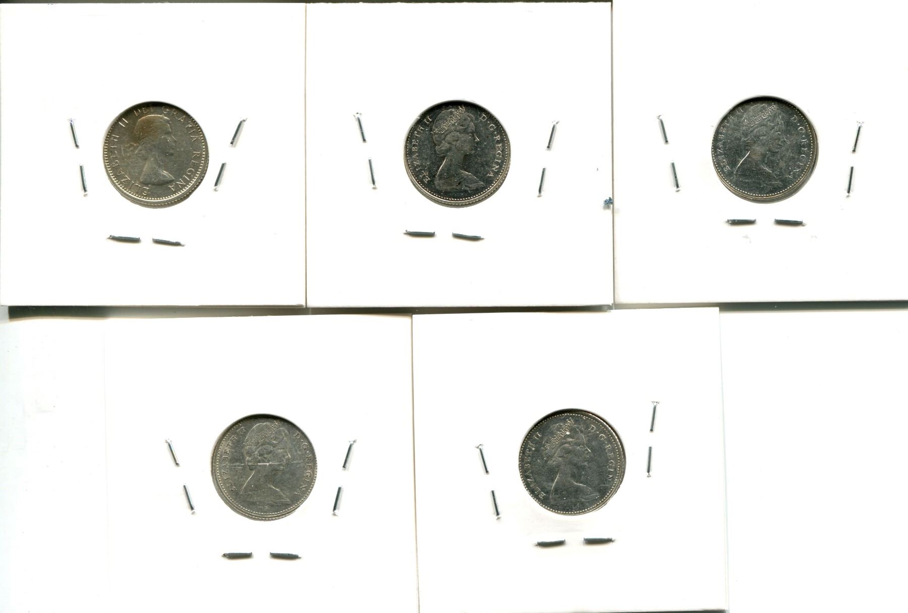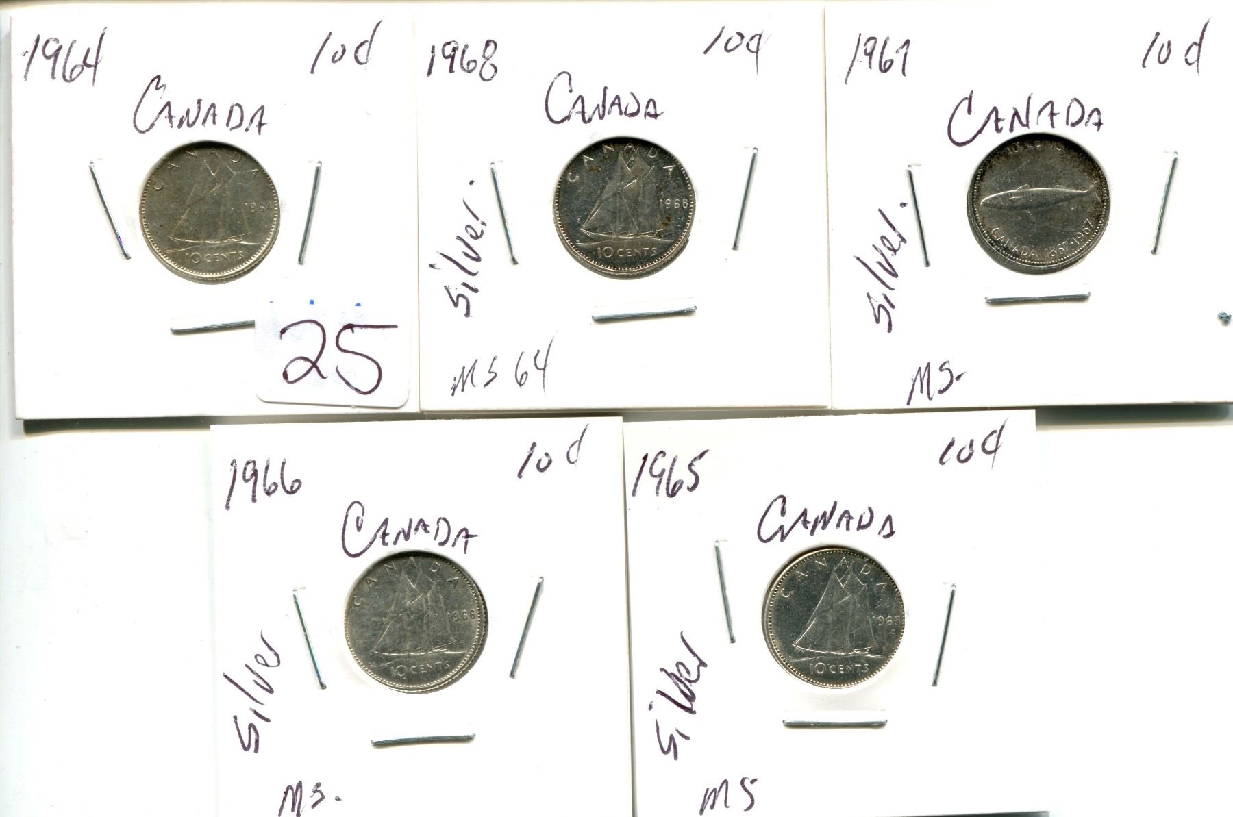 Canadian silver 10¢ ten cent 1964, 1965, 1966, 1967, 1968 lot of 5