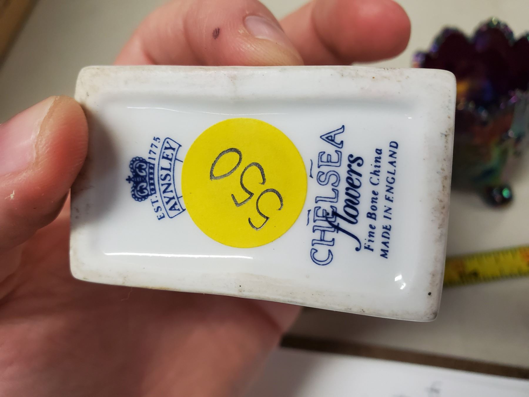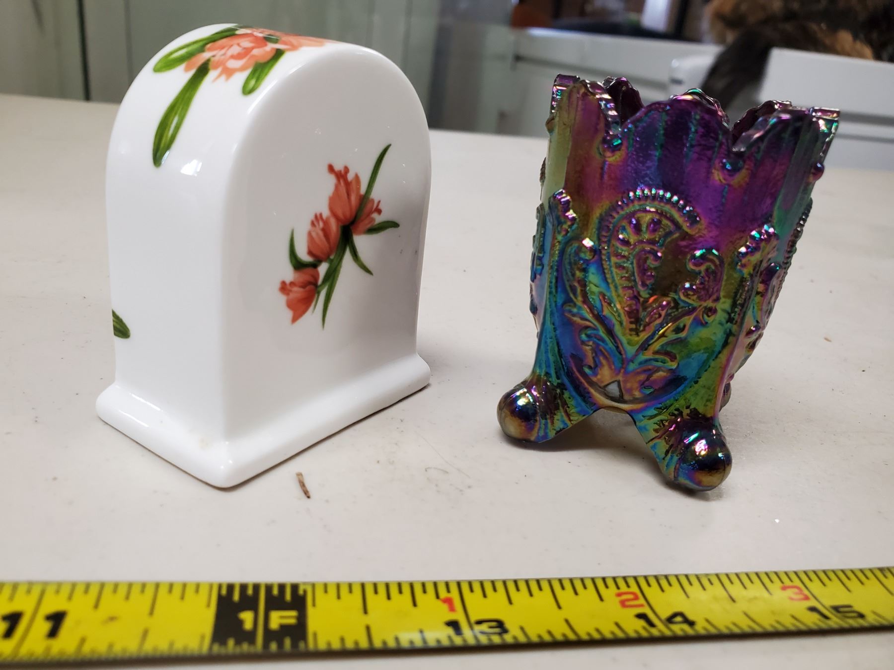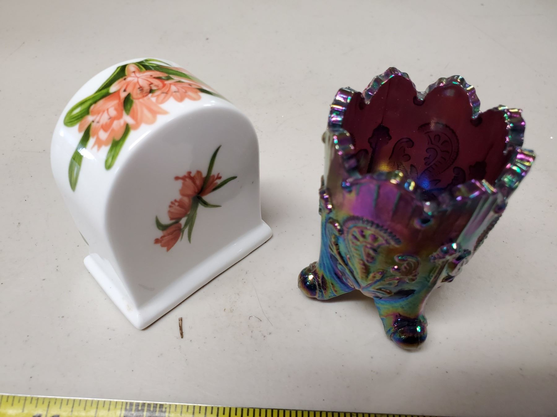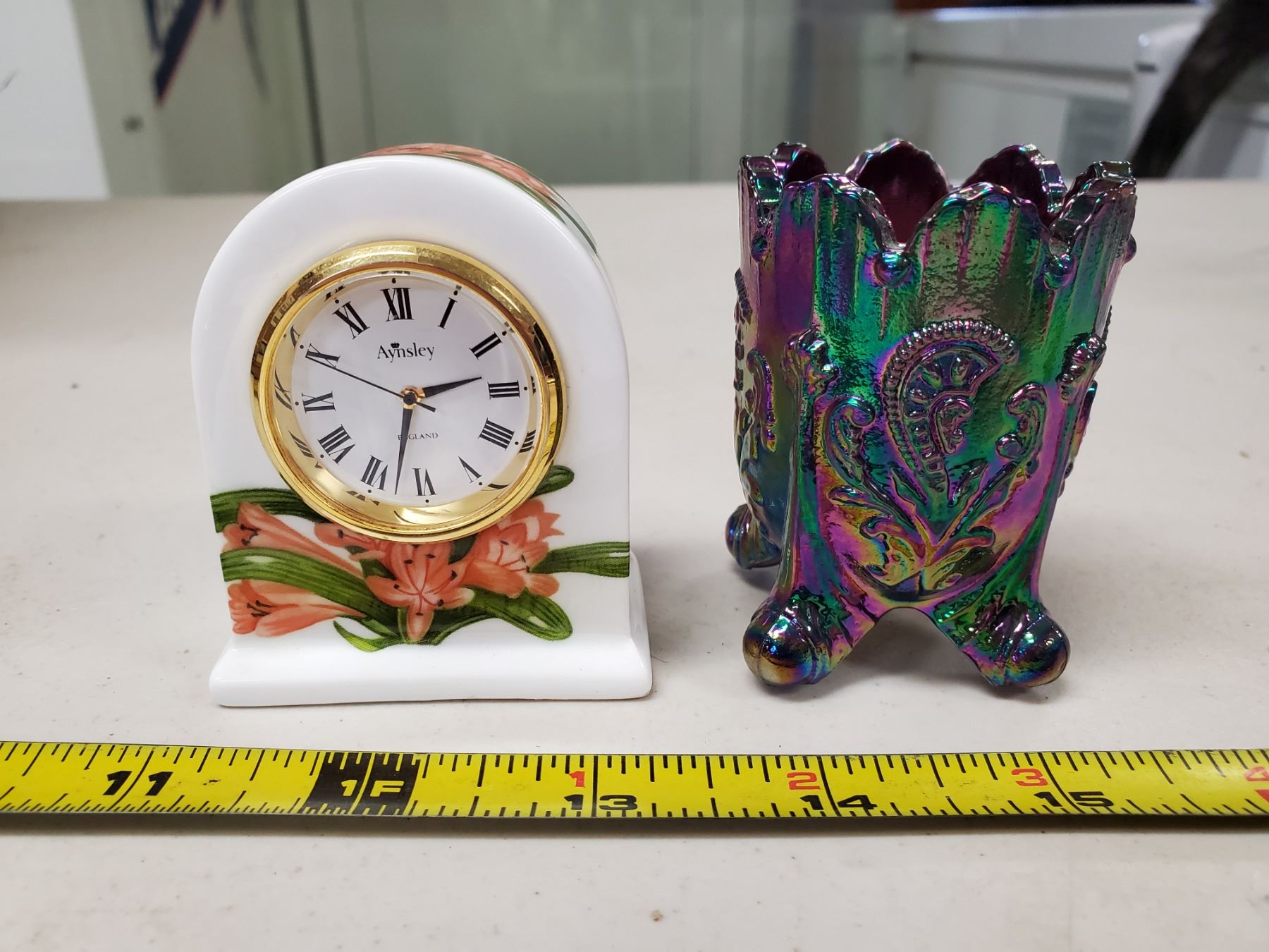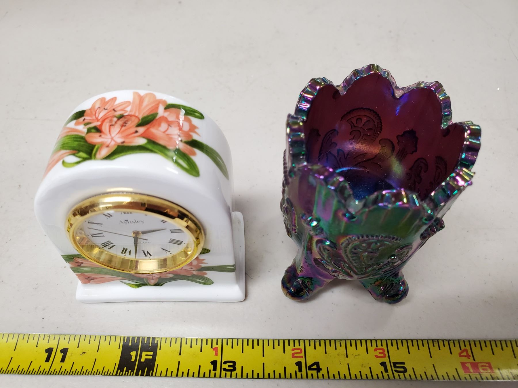 Carnival glass toothpick holder, small porcelain clock with lily pattern