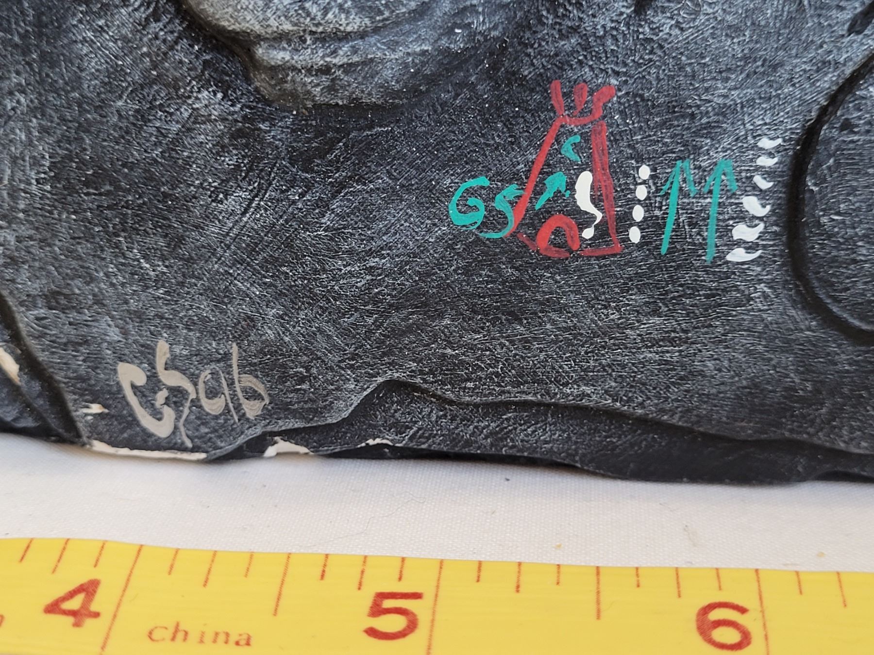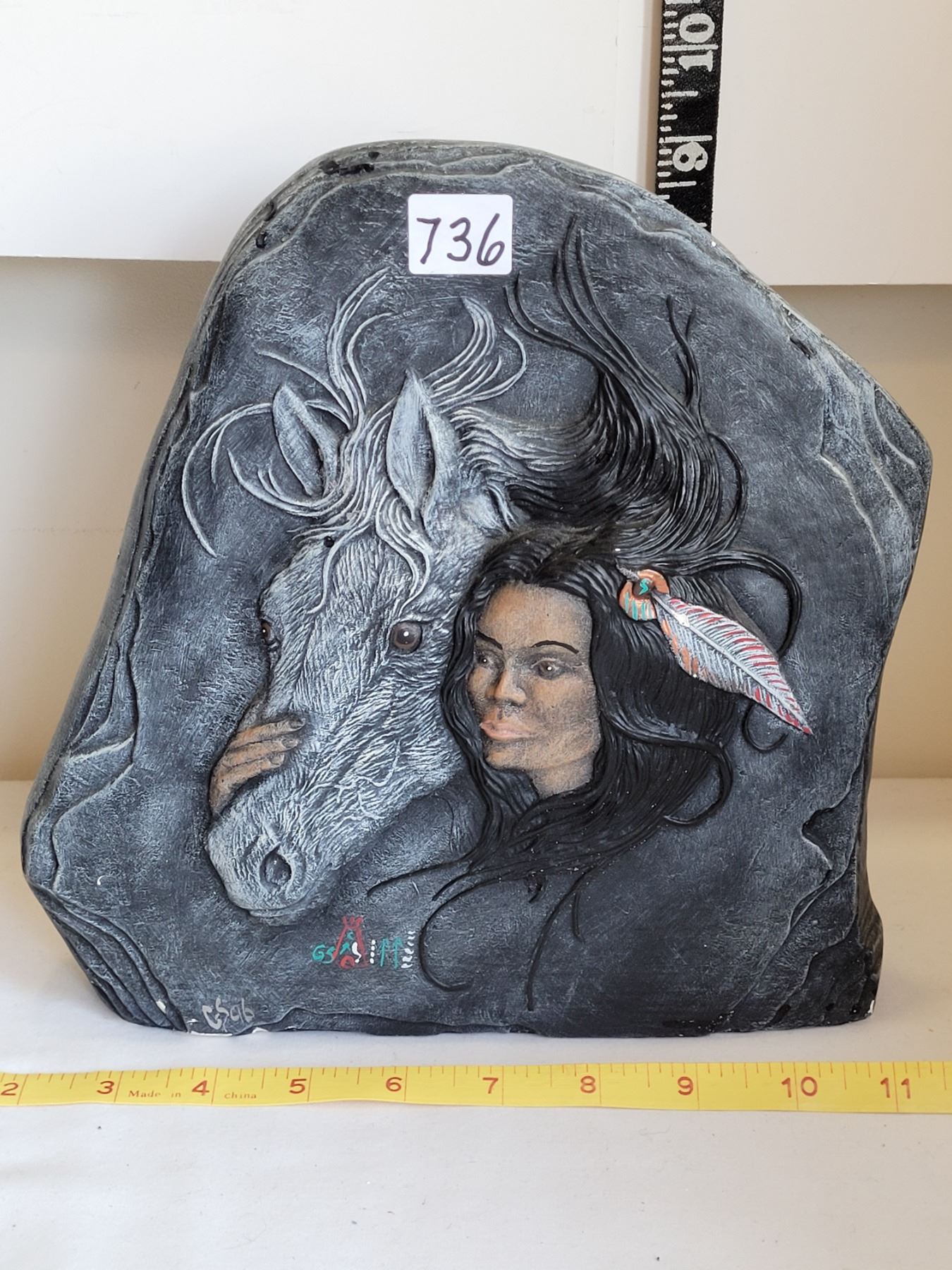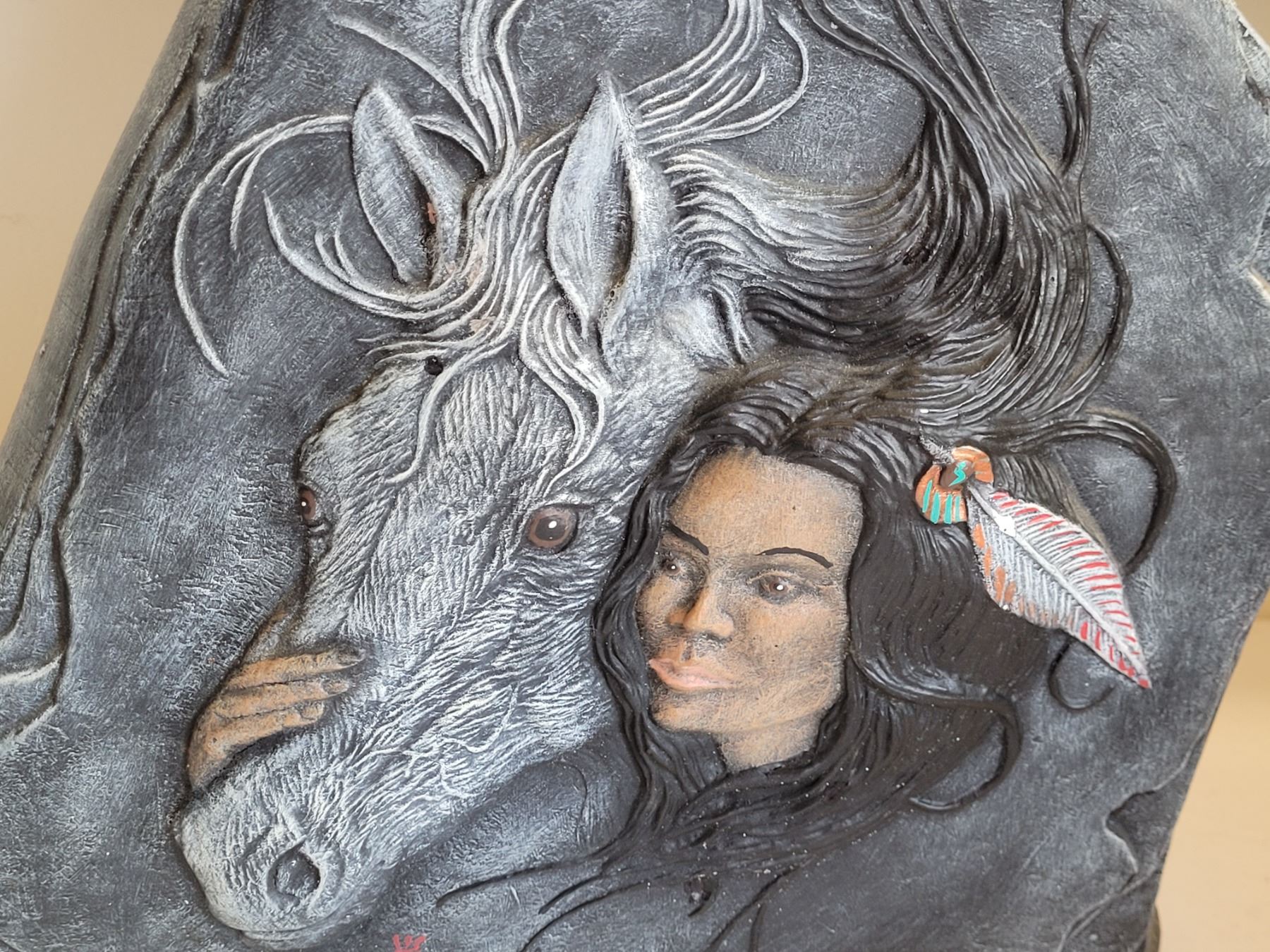 Carved & signed chalkware stone depicting a beautiful Native woman & her horse.