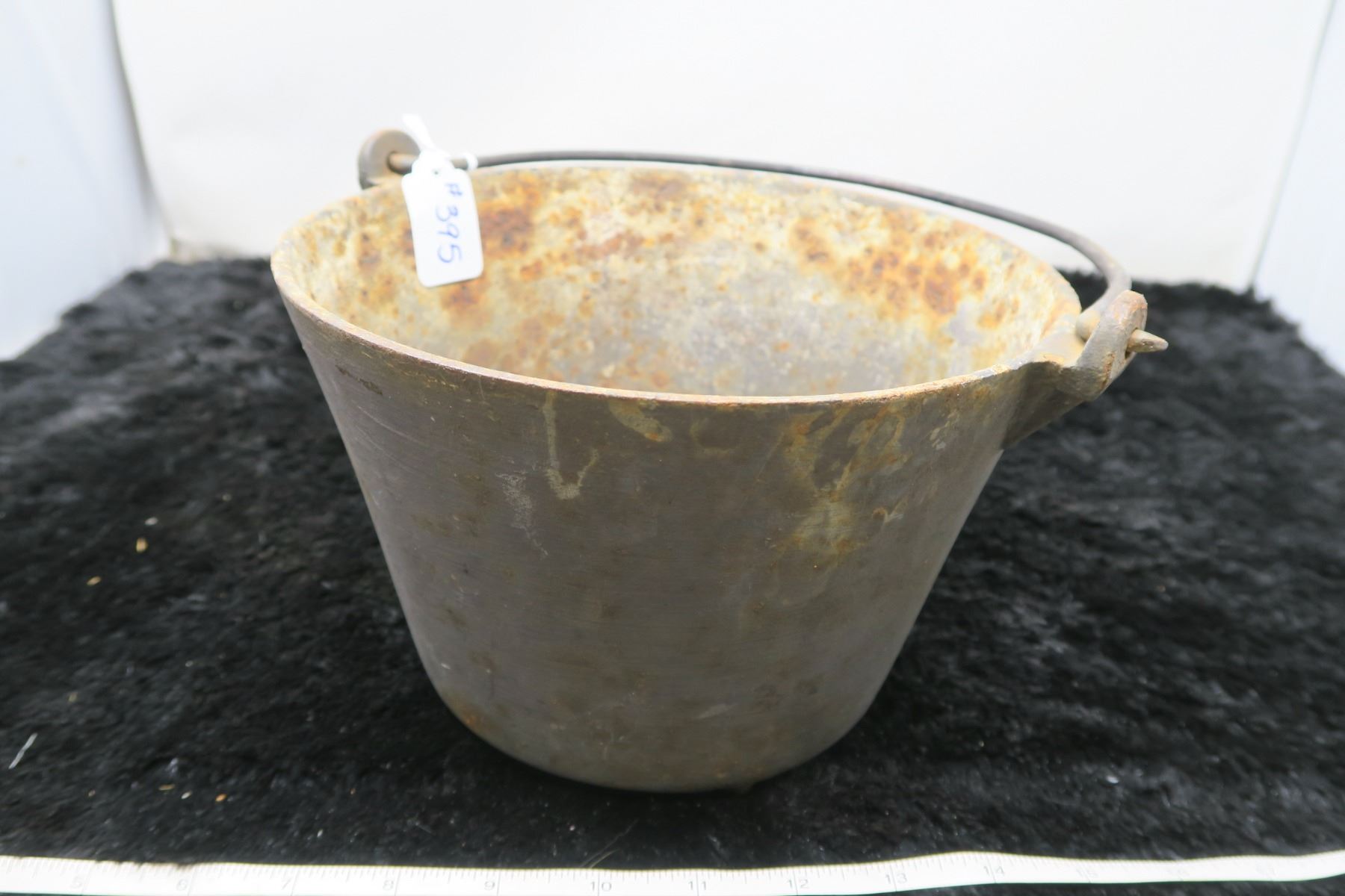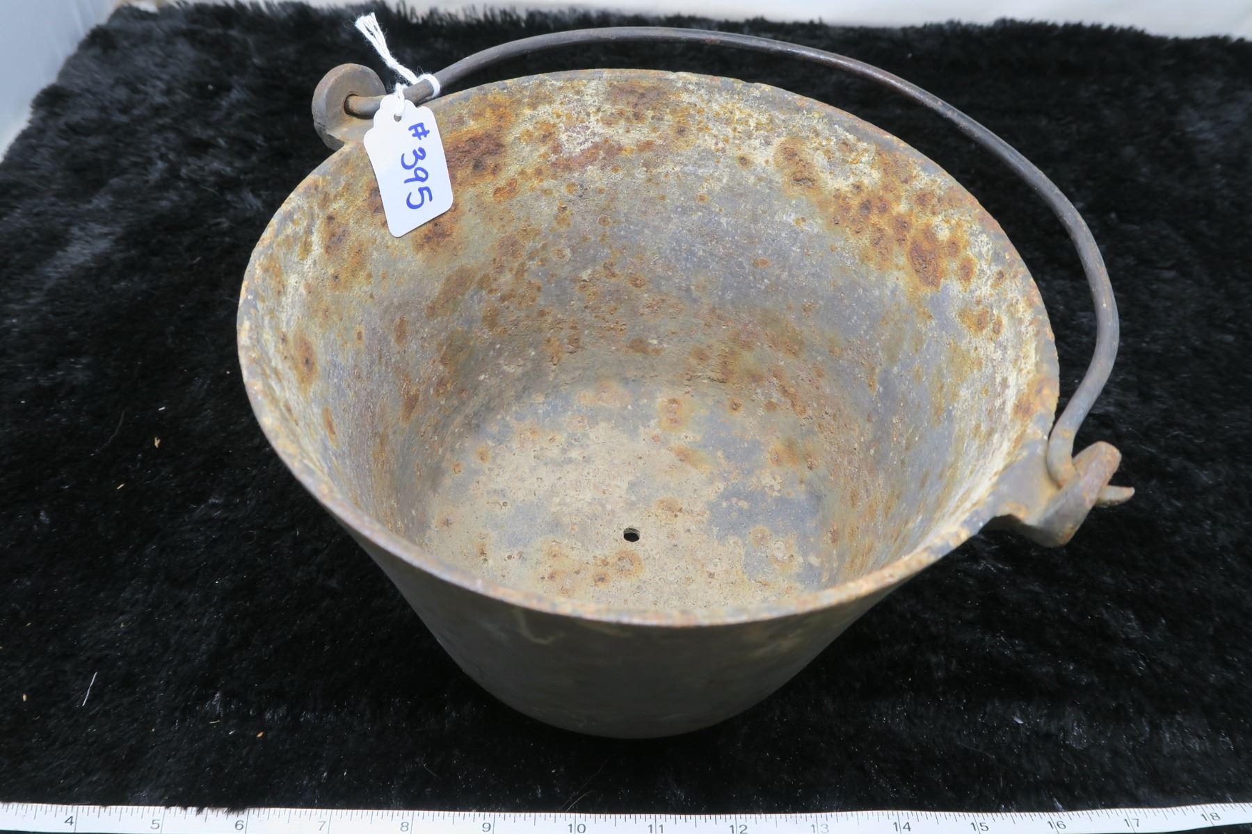 Cast iron pot, 8 ½” across, very small hole in bottom center, 3 legs