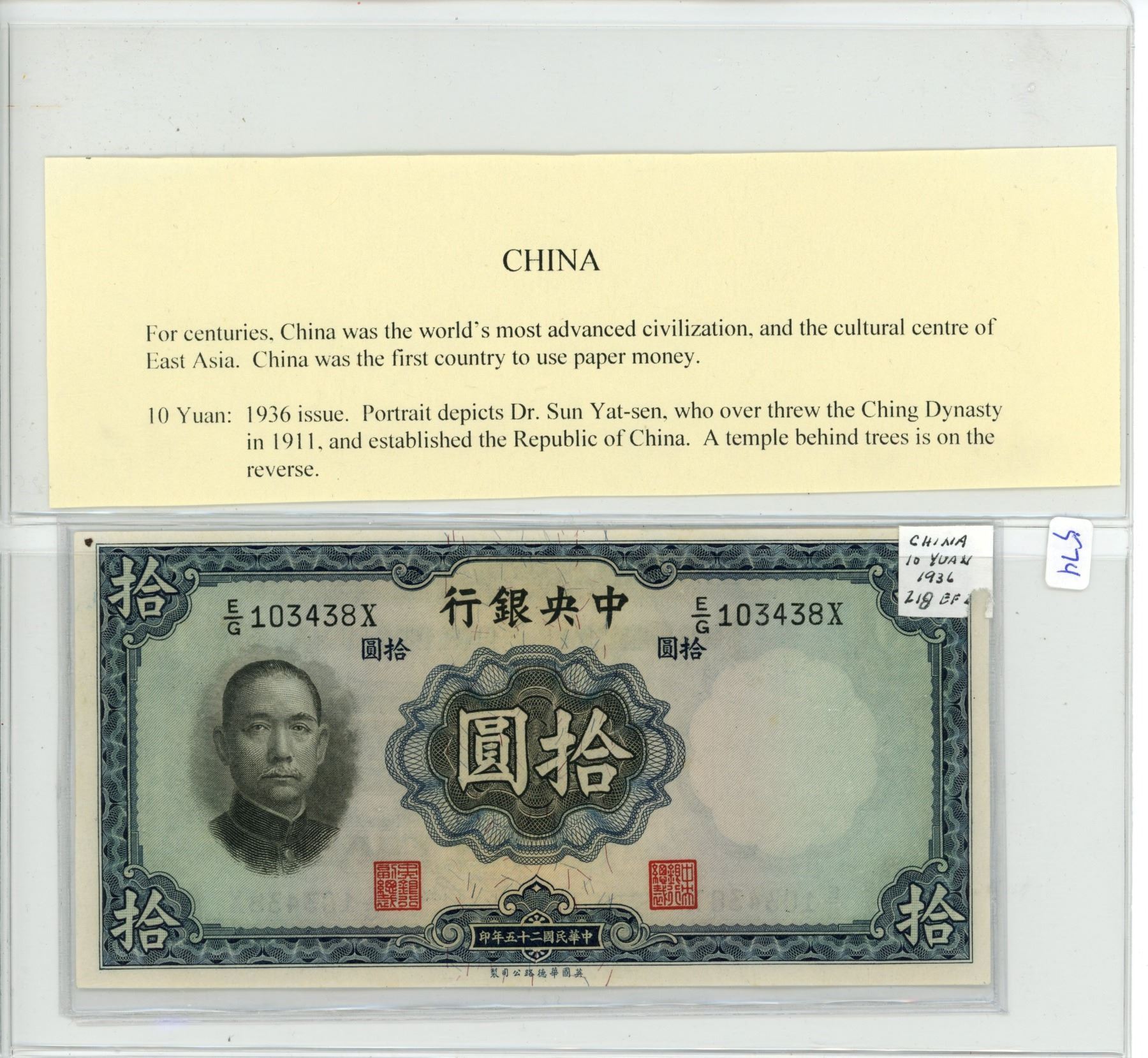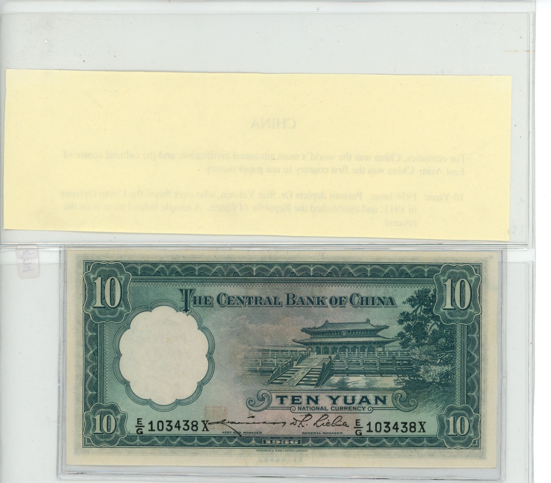 Central Bank of China. 1936 10 Yuan. Dr. Sun Yat-sen/temple. EF.