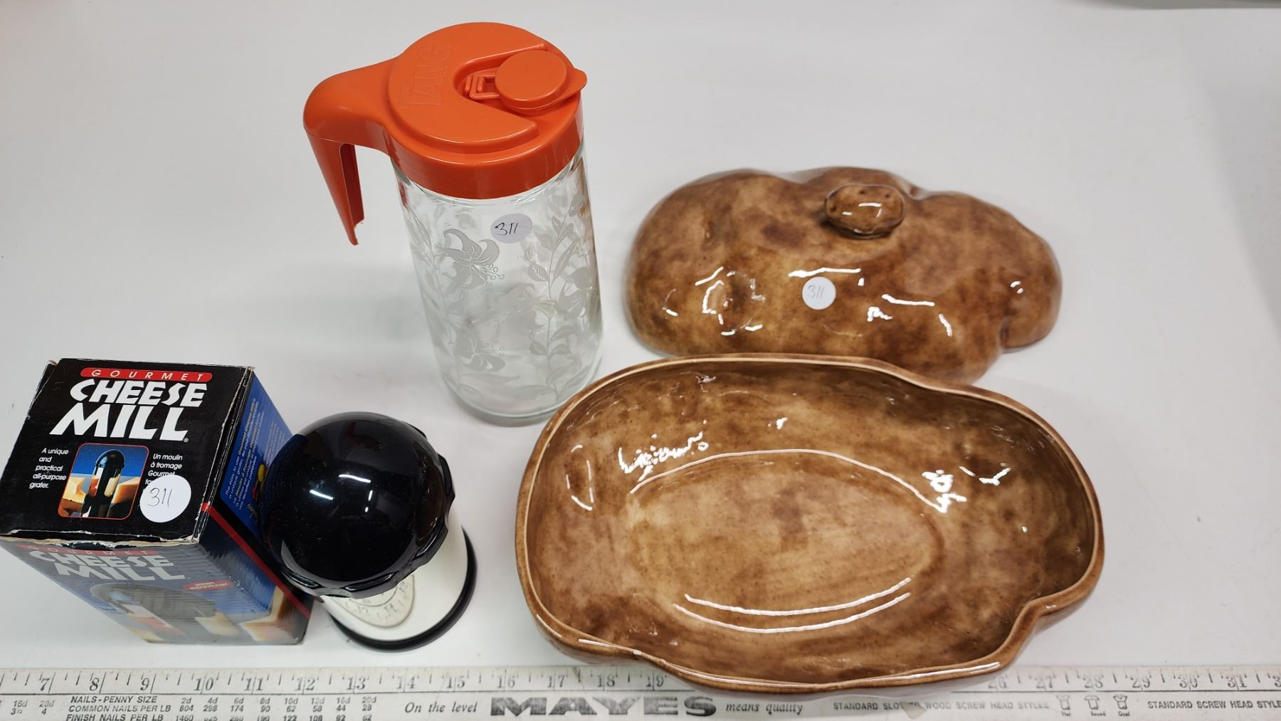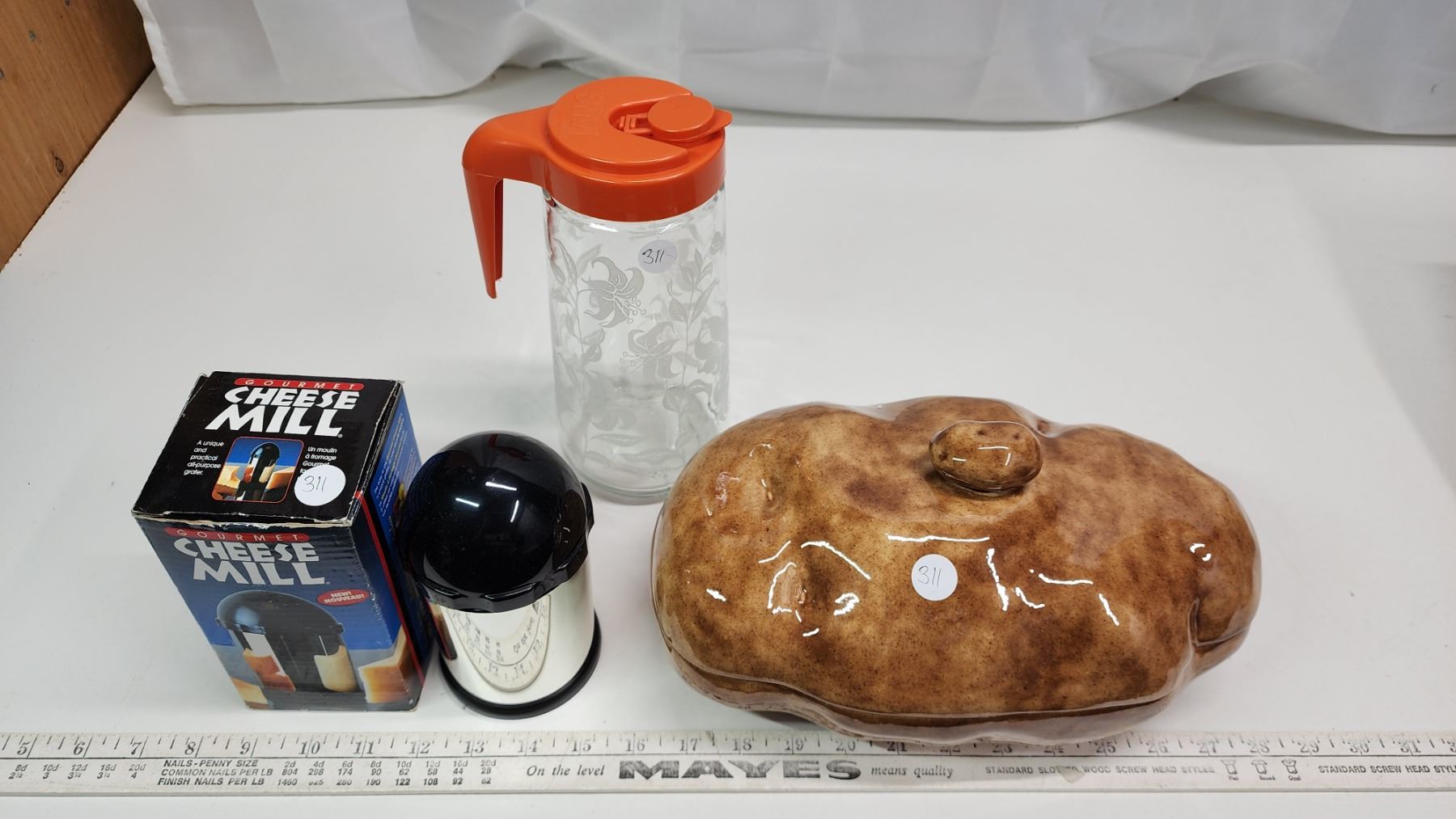 Ceramic Potato casserole dish, Tang glass pitcher & Cheese mill