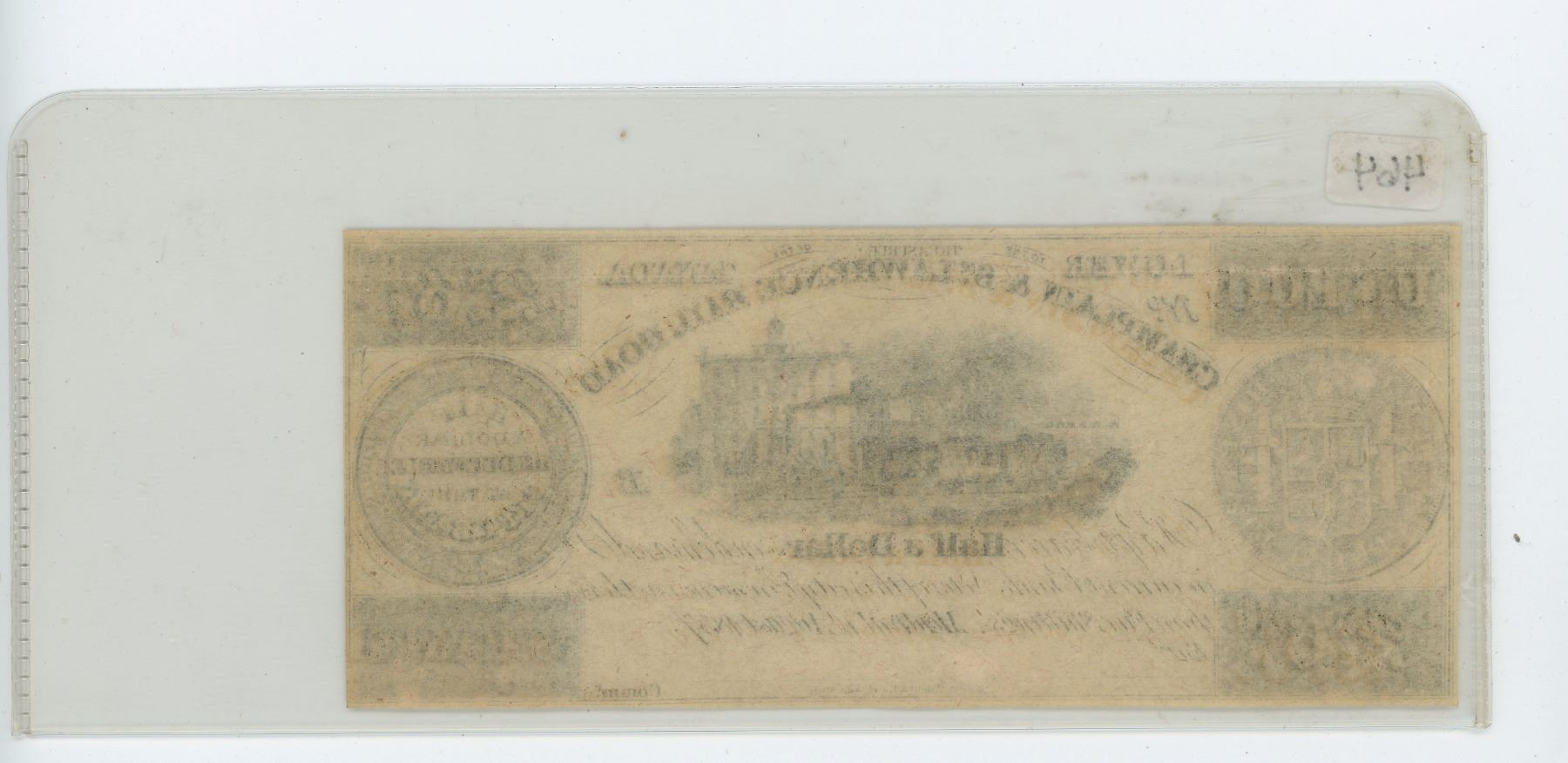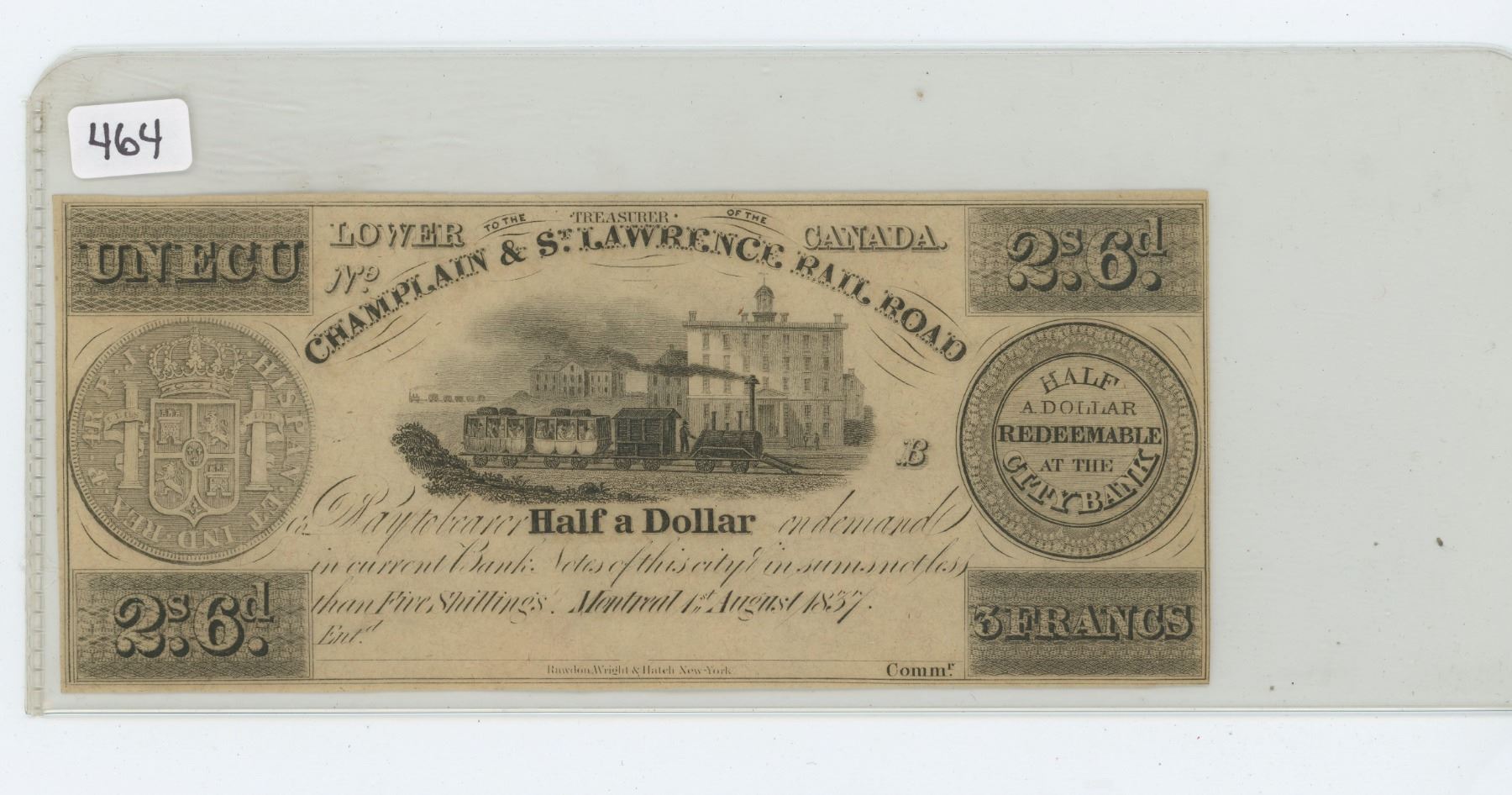 Champlain & St. Lawrence Rail Road half dollar note dated 1857. Redeemable at the City Bank in Montreal. Remainder. AU-50 condition. Scarce.