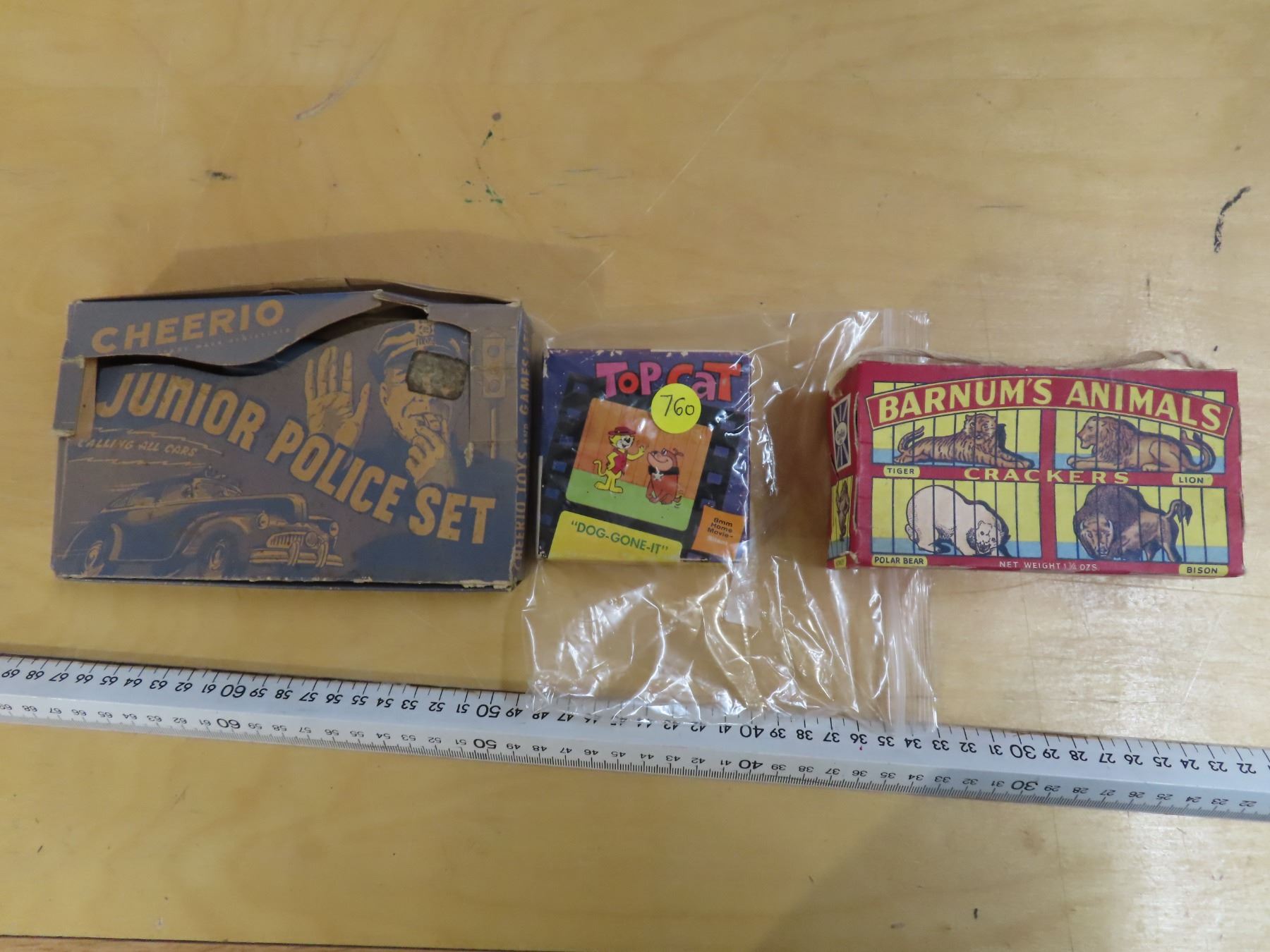 Cheerio junior police set, top- cat film and Barnum's animals crackers box