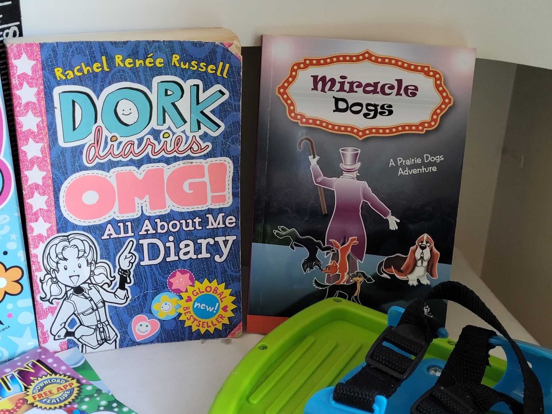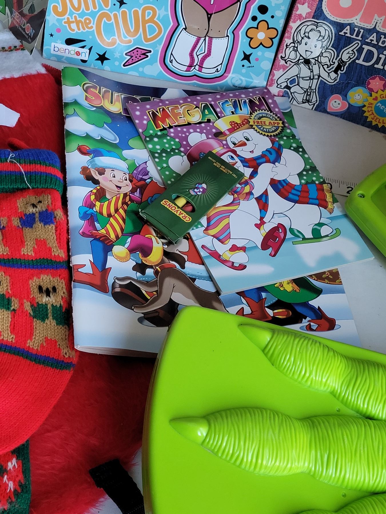 Children's Christmas lot. Stockings, colouring & reading books. Strap on dinosaur foot track maker.