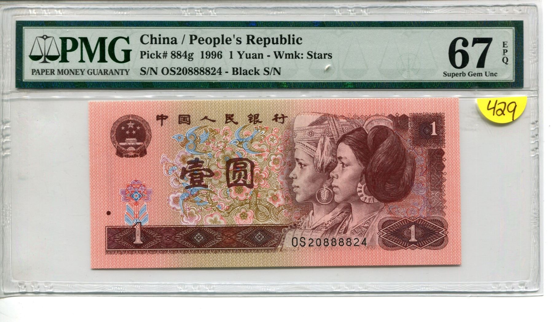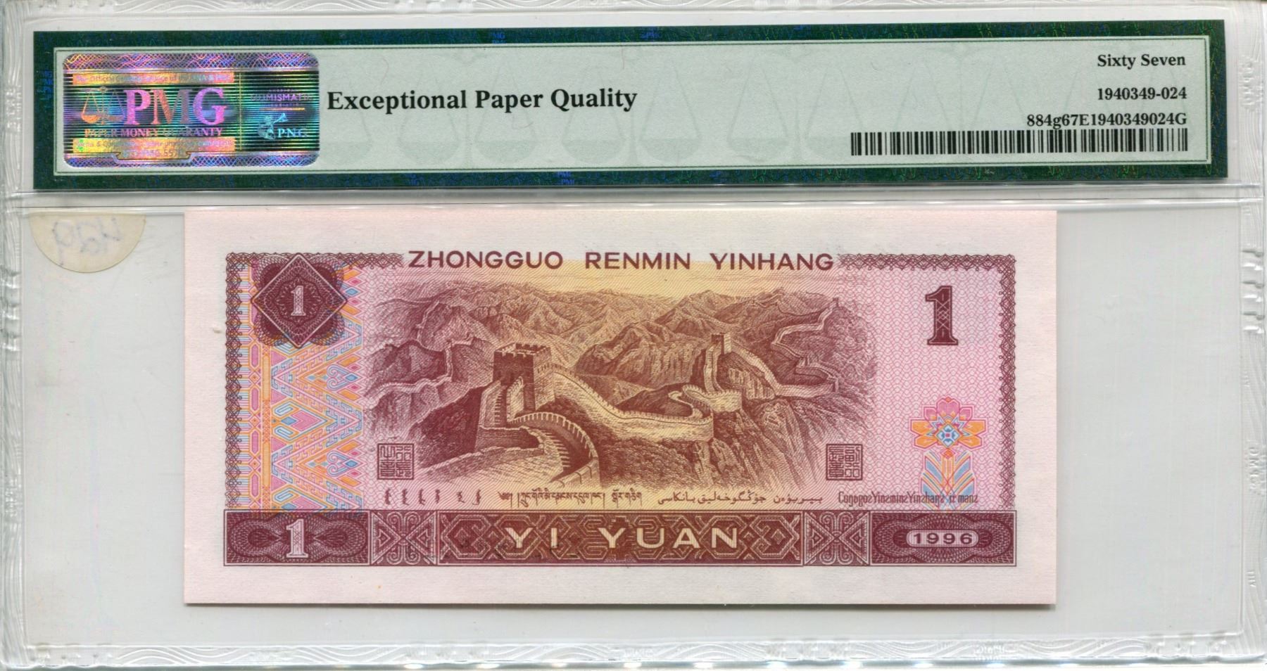 China 1 YUAN 1996 P 884 UNC S/N 208888XX SUPERB GEM UNC PMG 67 EPQ