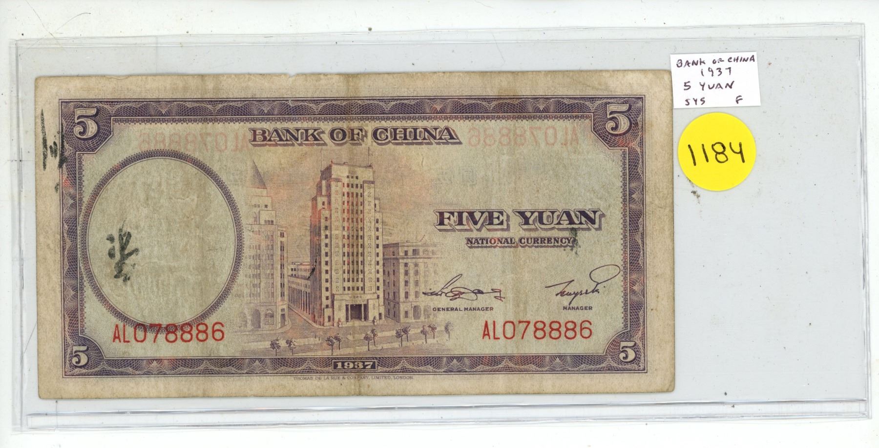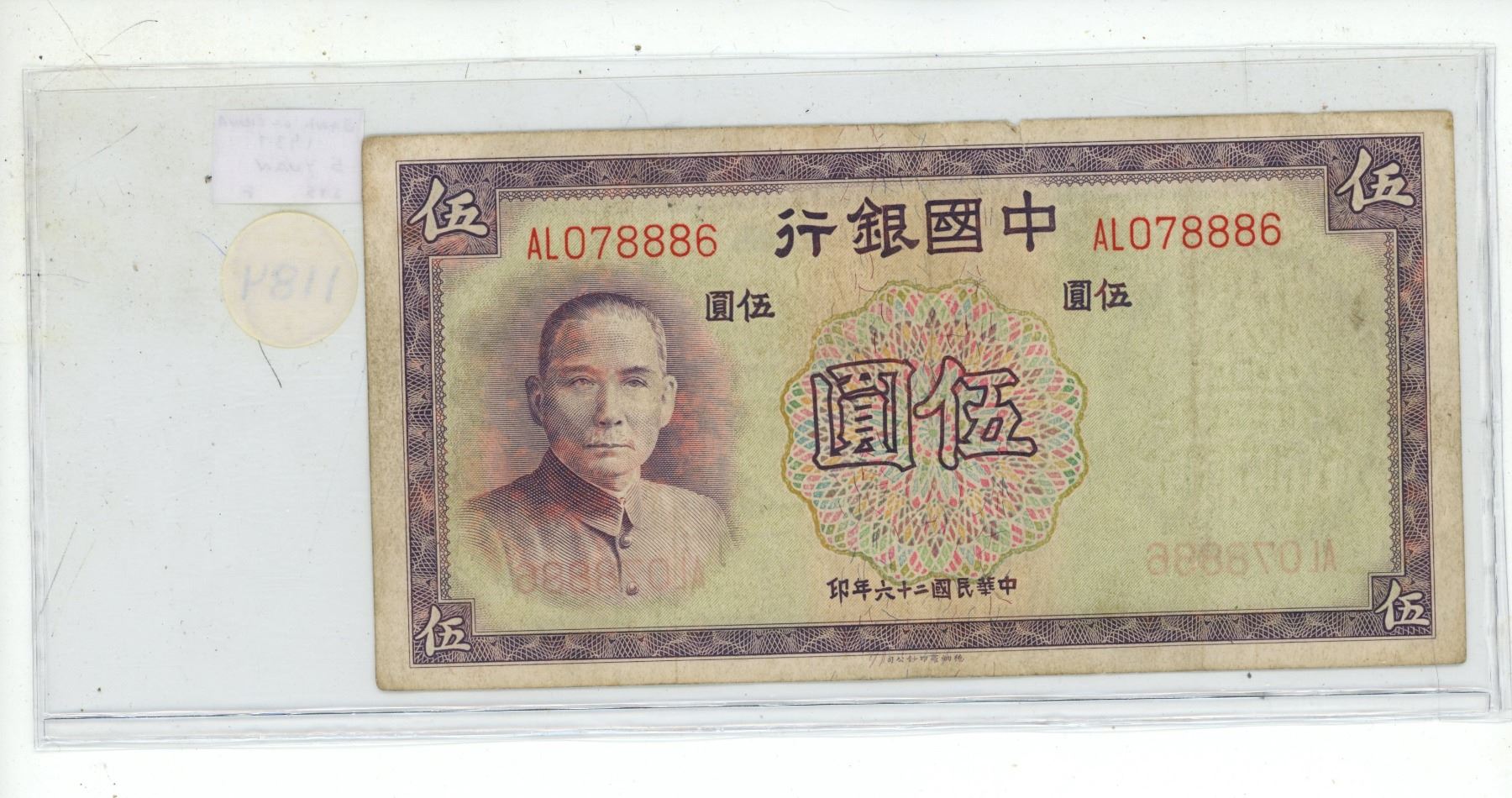 China. Bank of China. 1937 5 Yuan. Sun Yat-Sen. Fine.