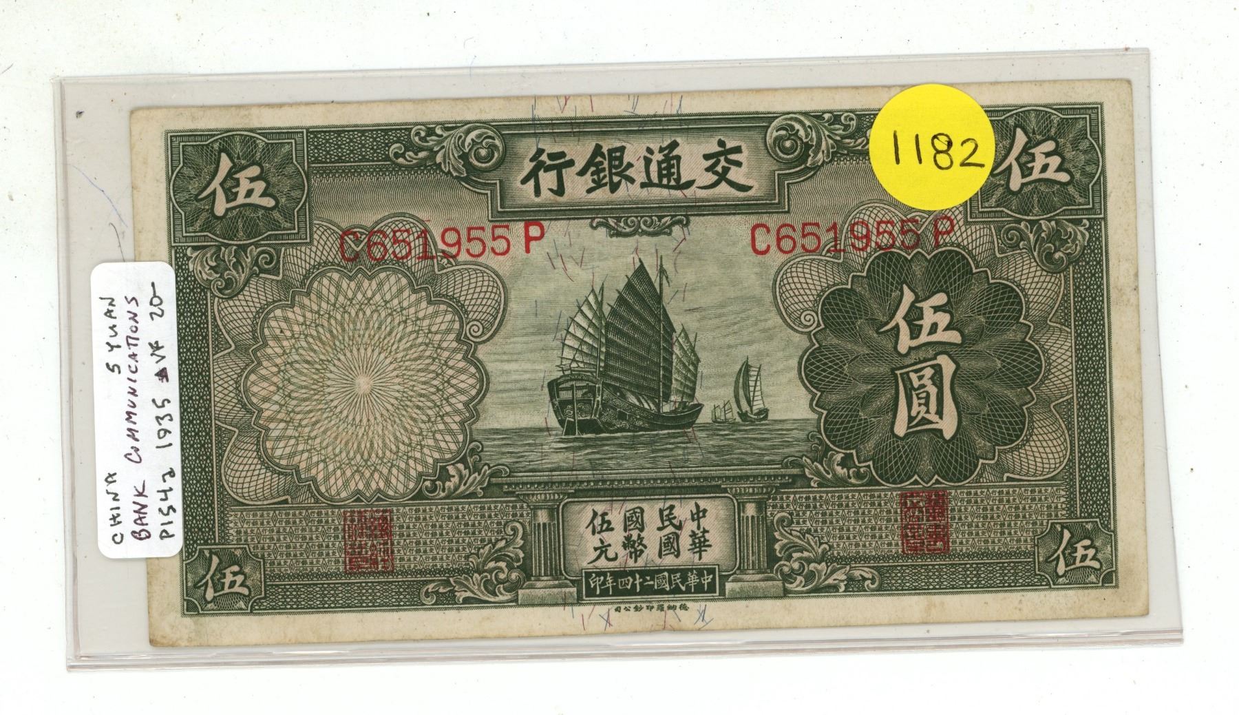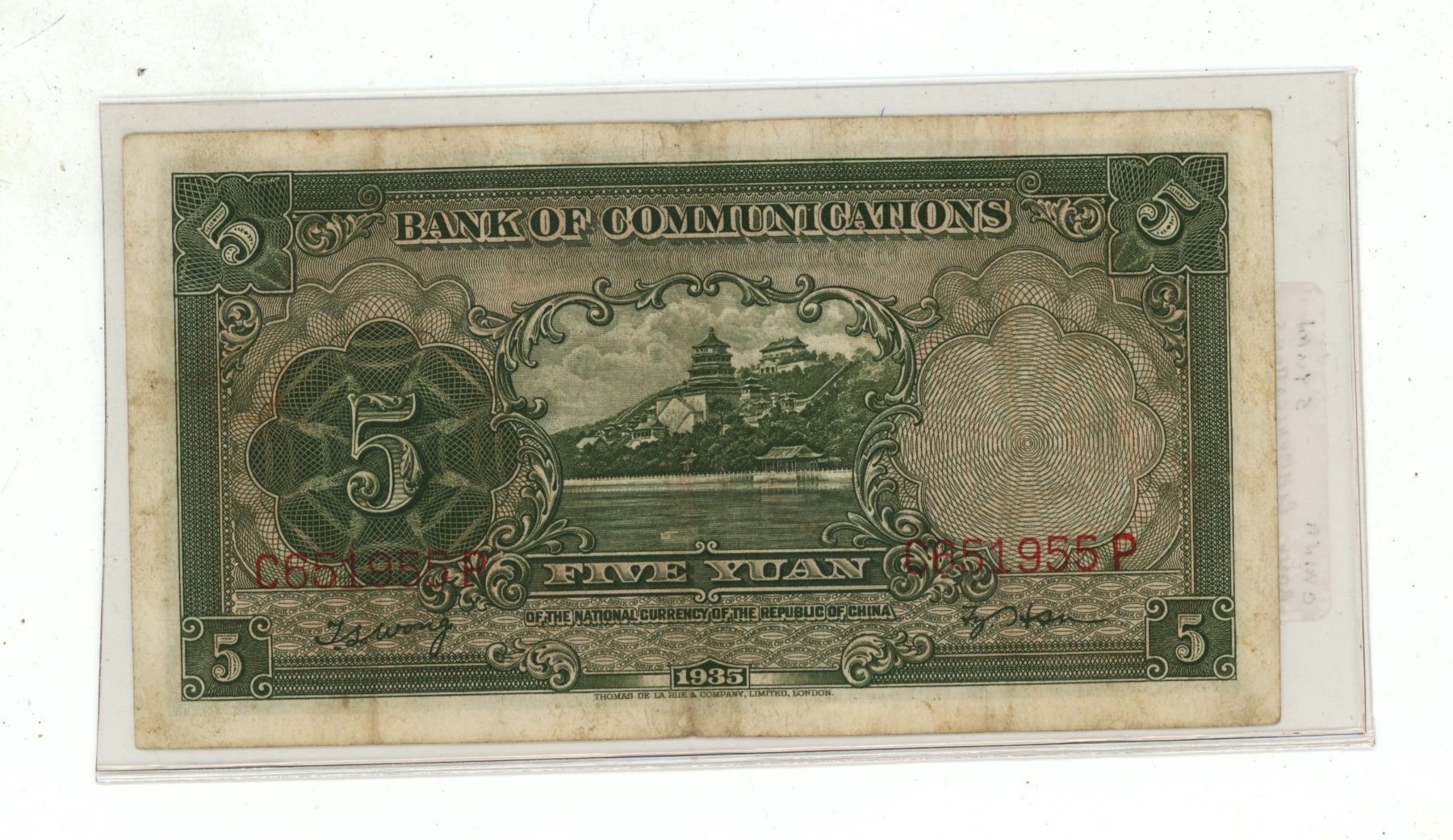 China. Bank of Communications. 1935 5 Yuan. Junks/Pagoda. VF.