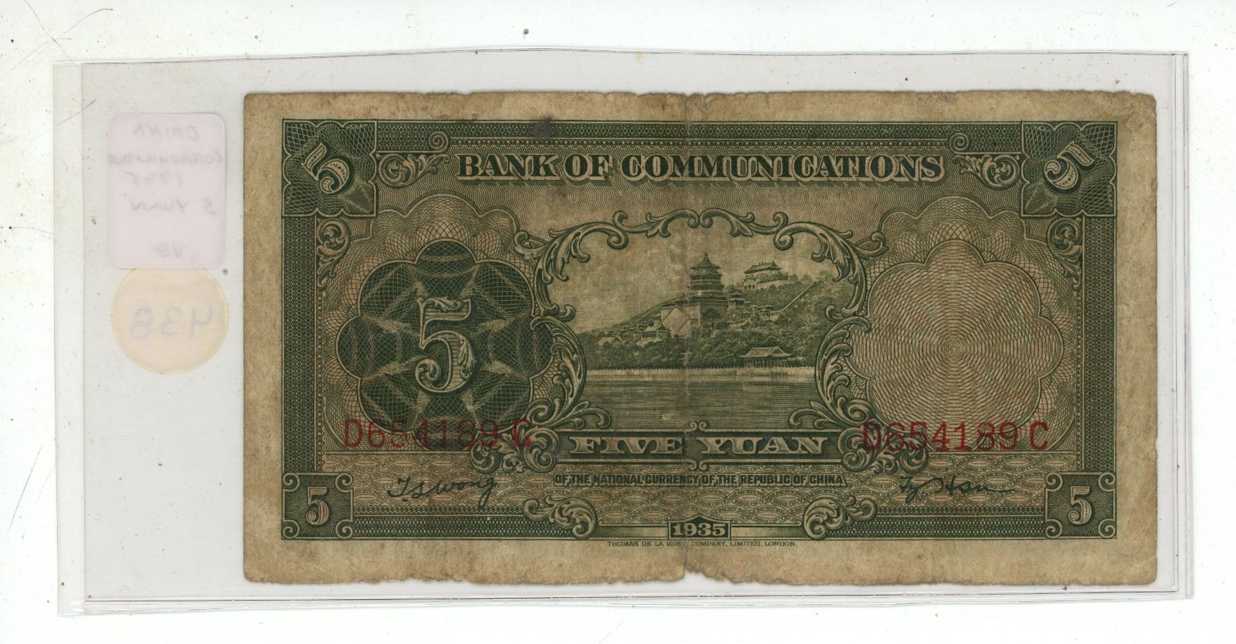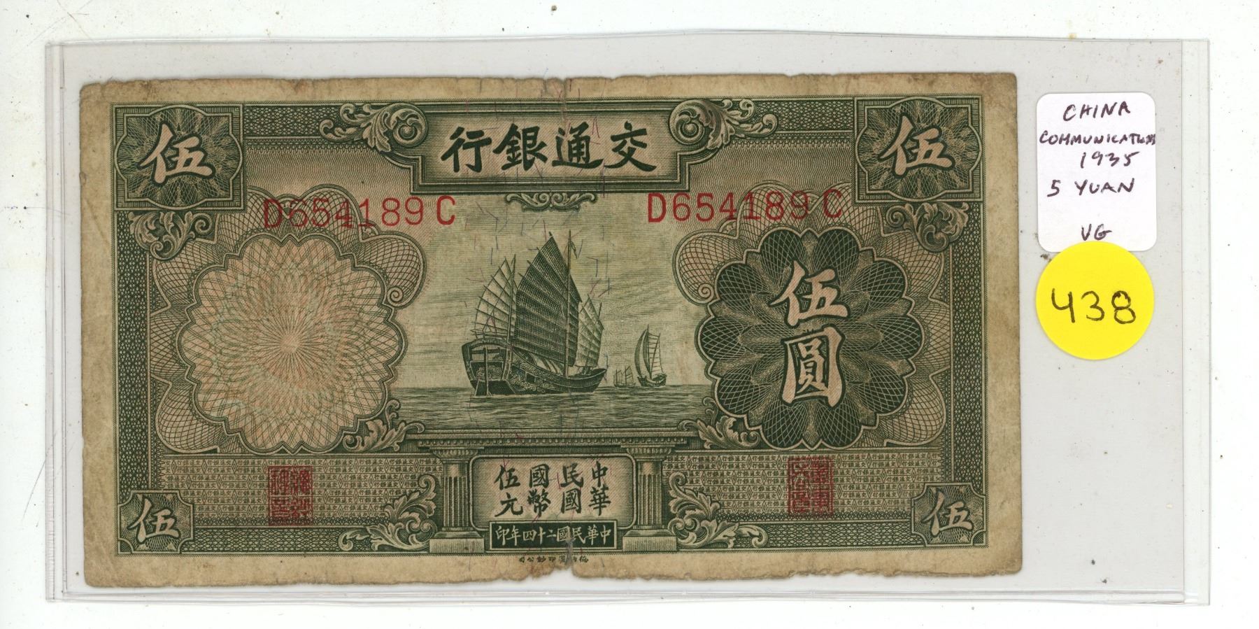 China. Bank of Communications. 1935 5 Yuan. Junks/Pagoda. VG.