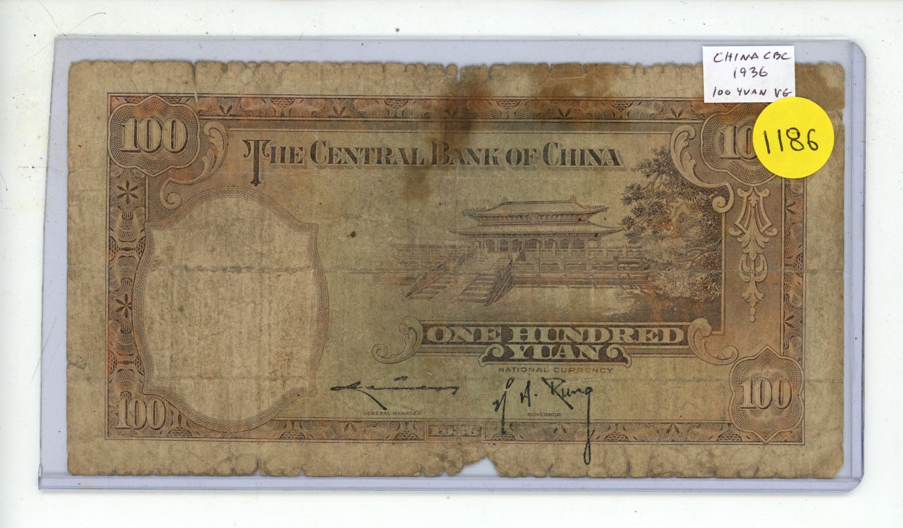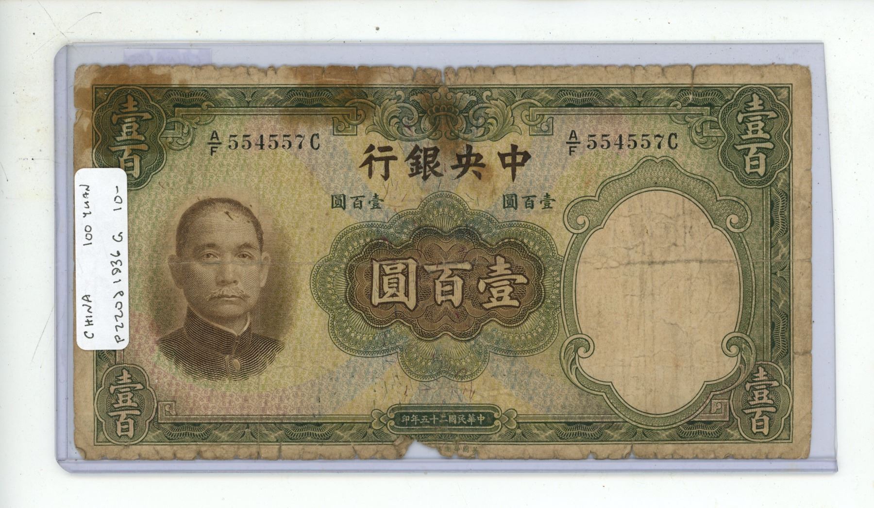 China. Central Bank of China. 1936 100 Yuan. Sun Yat-Sen. VG with pieces missing.