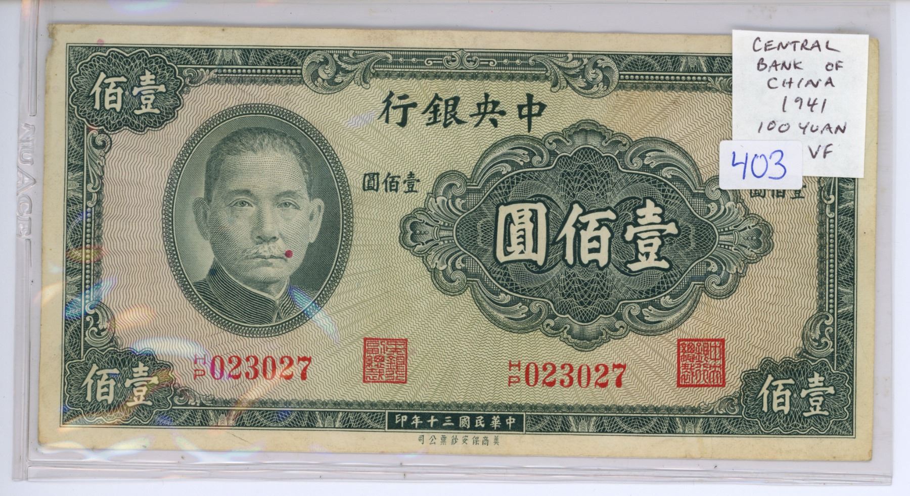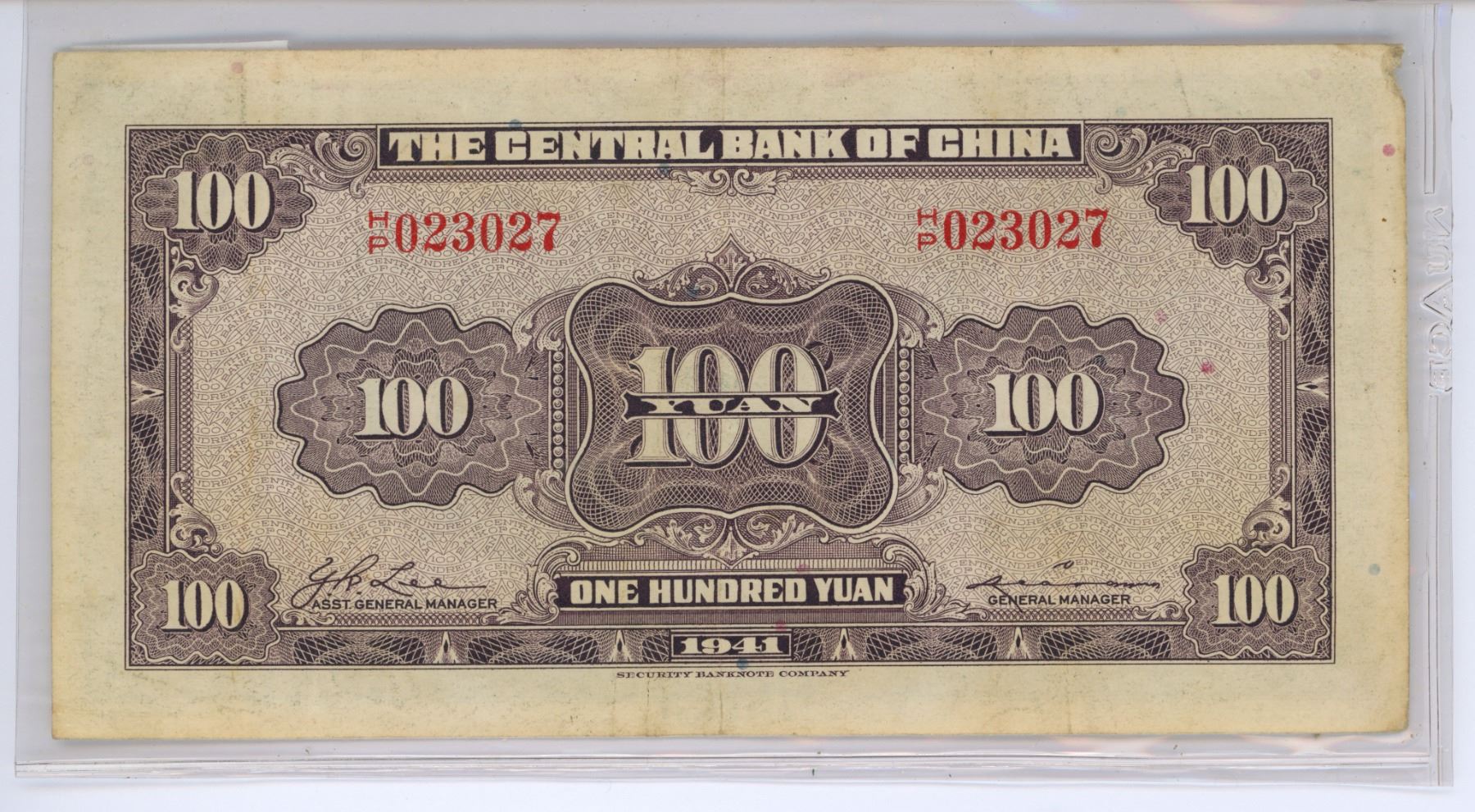 China. Central Bank of China. 1941 100 Yuan. Sun Yat-Sen. VF.