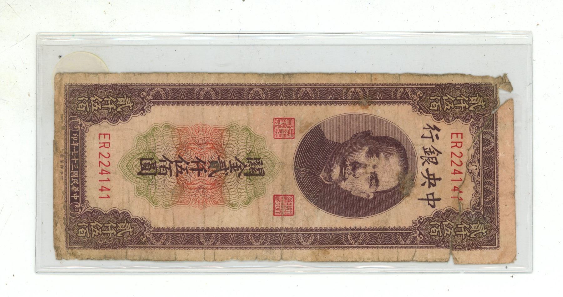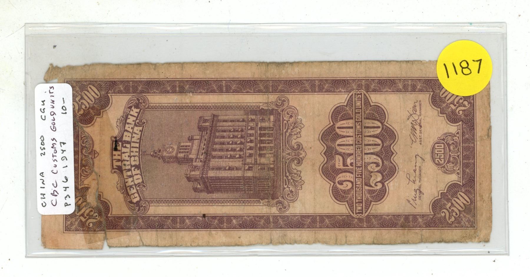 China. Central Bank of China. 1947 2500 Customs Gold Units. VG with tear.