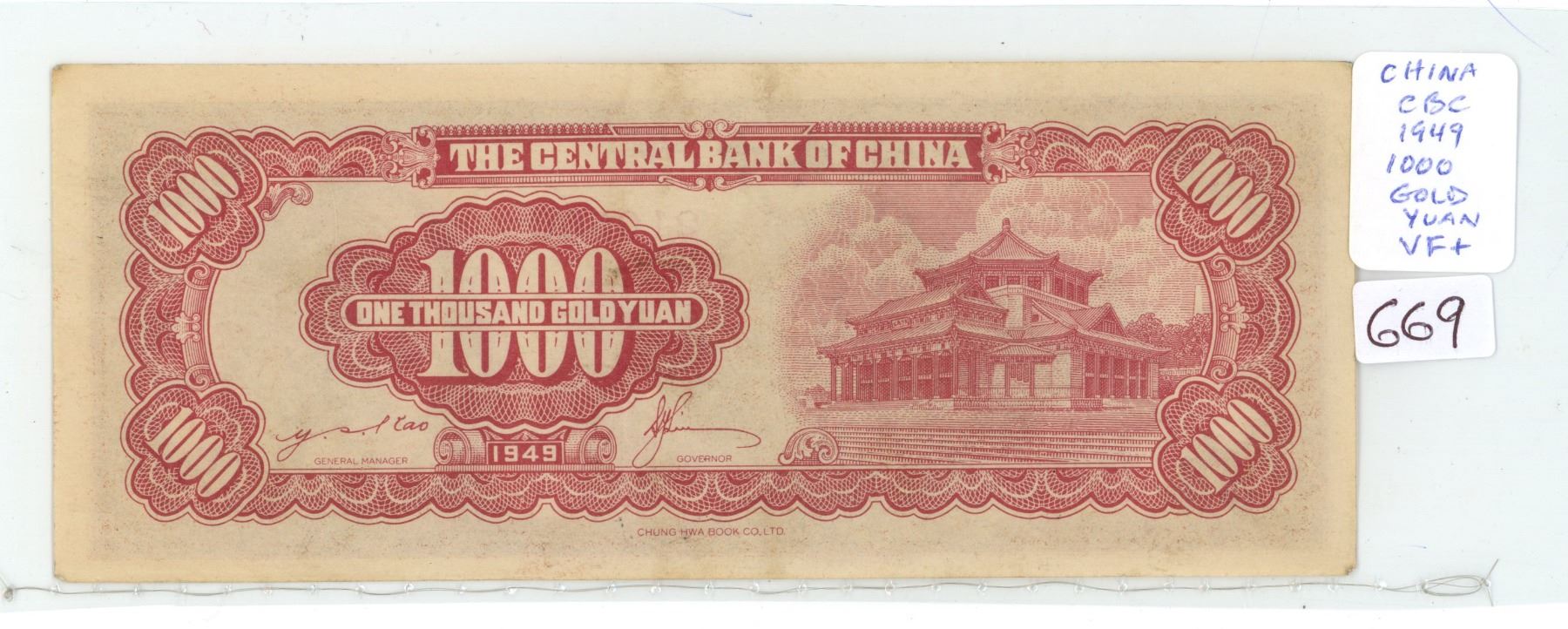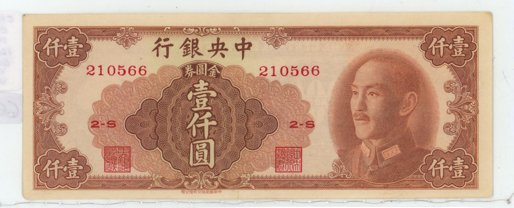 China. Central Bank of China. 1949 1000 Gold Yuan. Chiang Kai-Shek/temple. VF+.