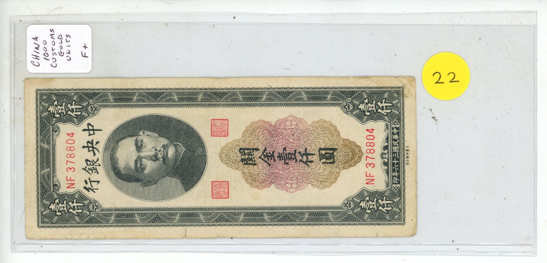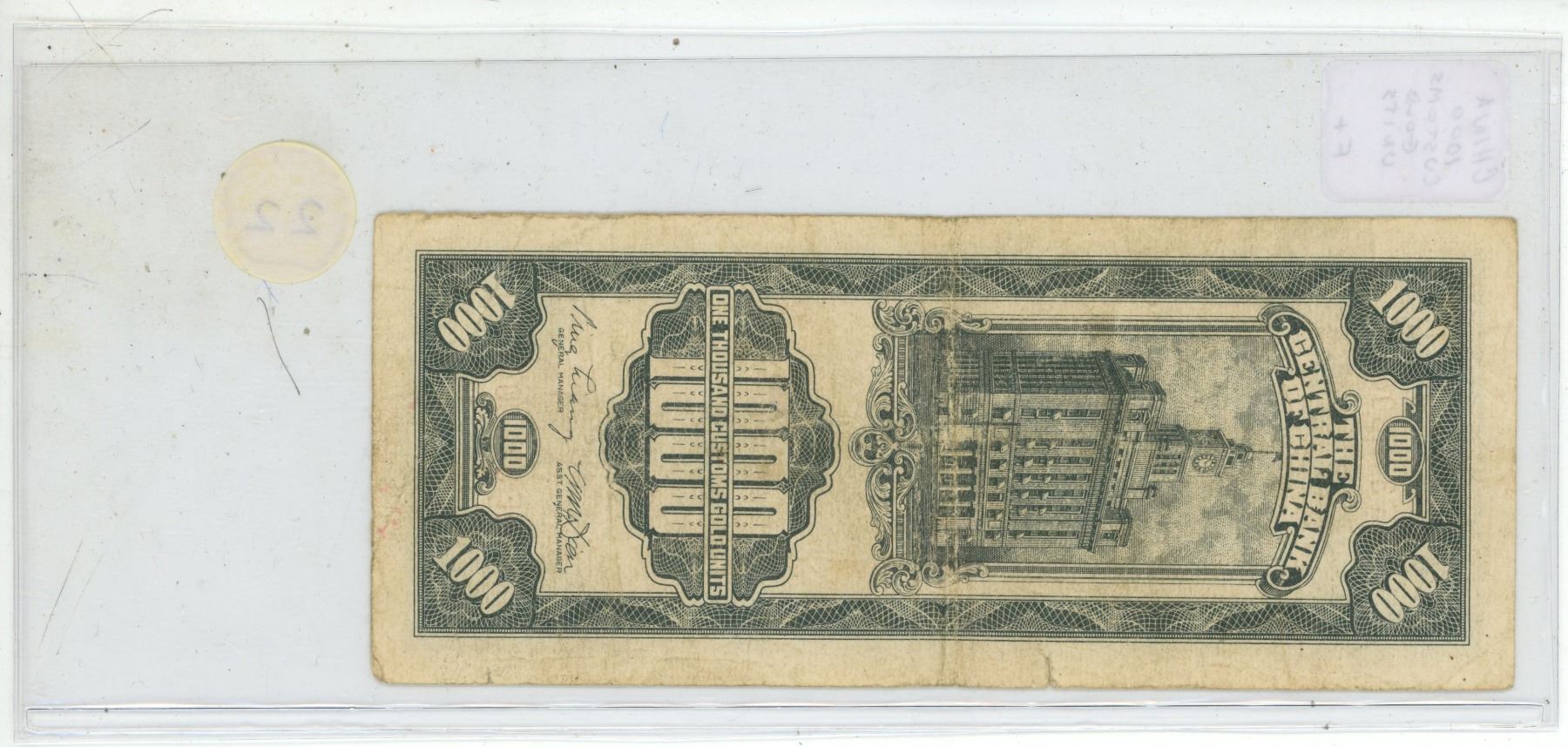 China. Central Bank of China. ND. 1000 Customs Gold Units. Fine+.