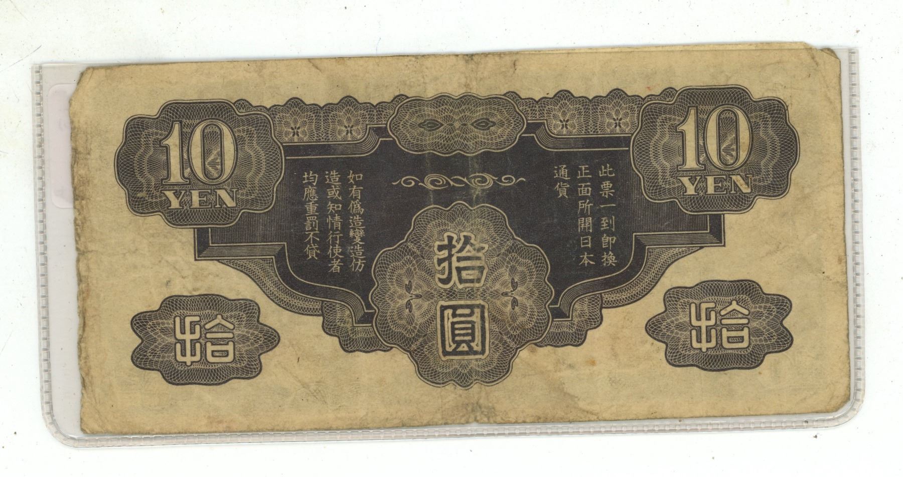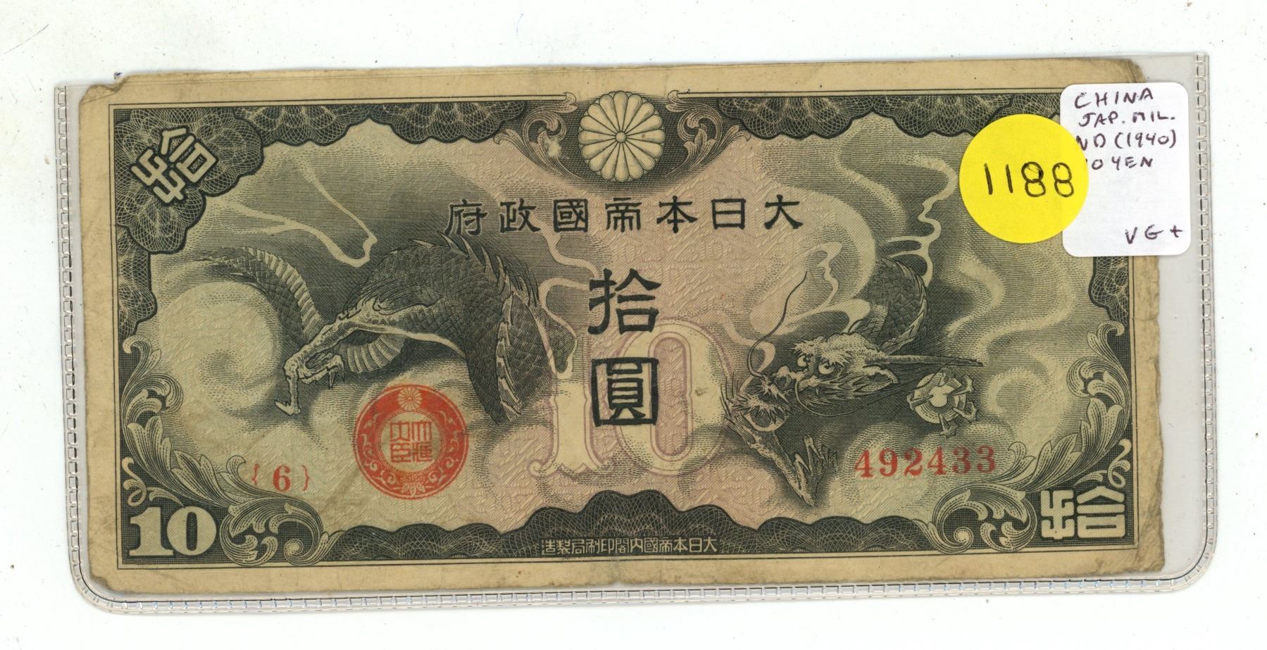 China. Japanese Military issue during the occupation of China. ND (1940) 10 Yen. Dragon. VG+.