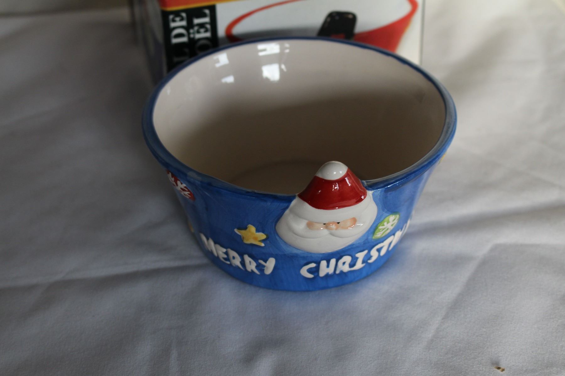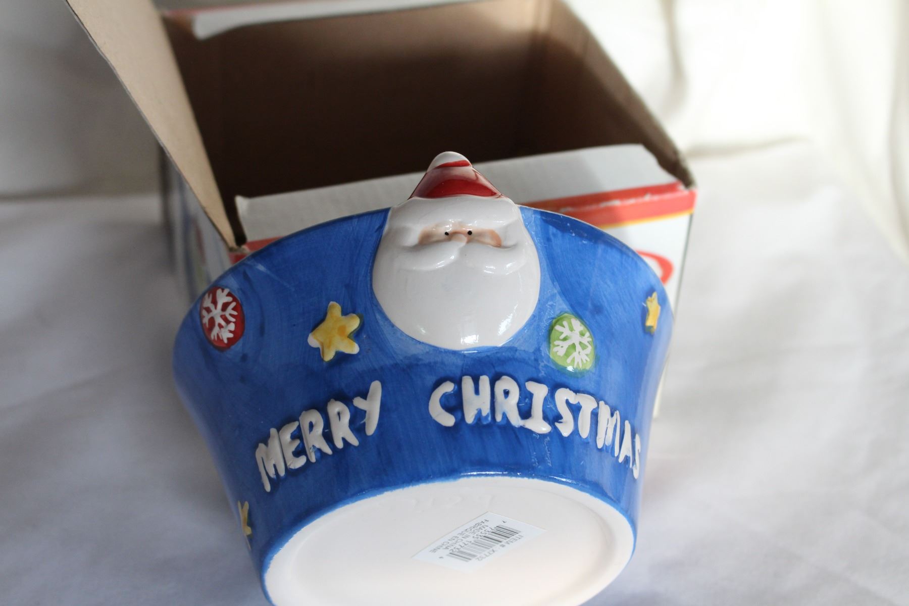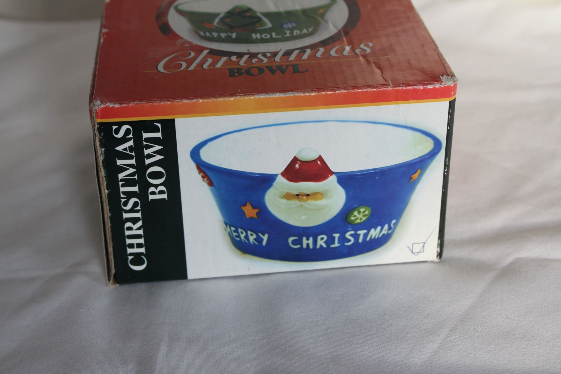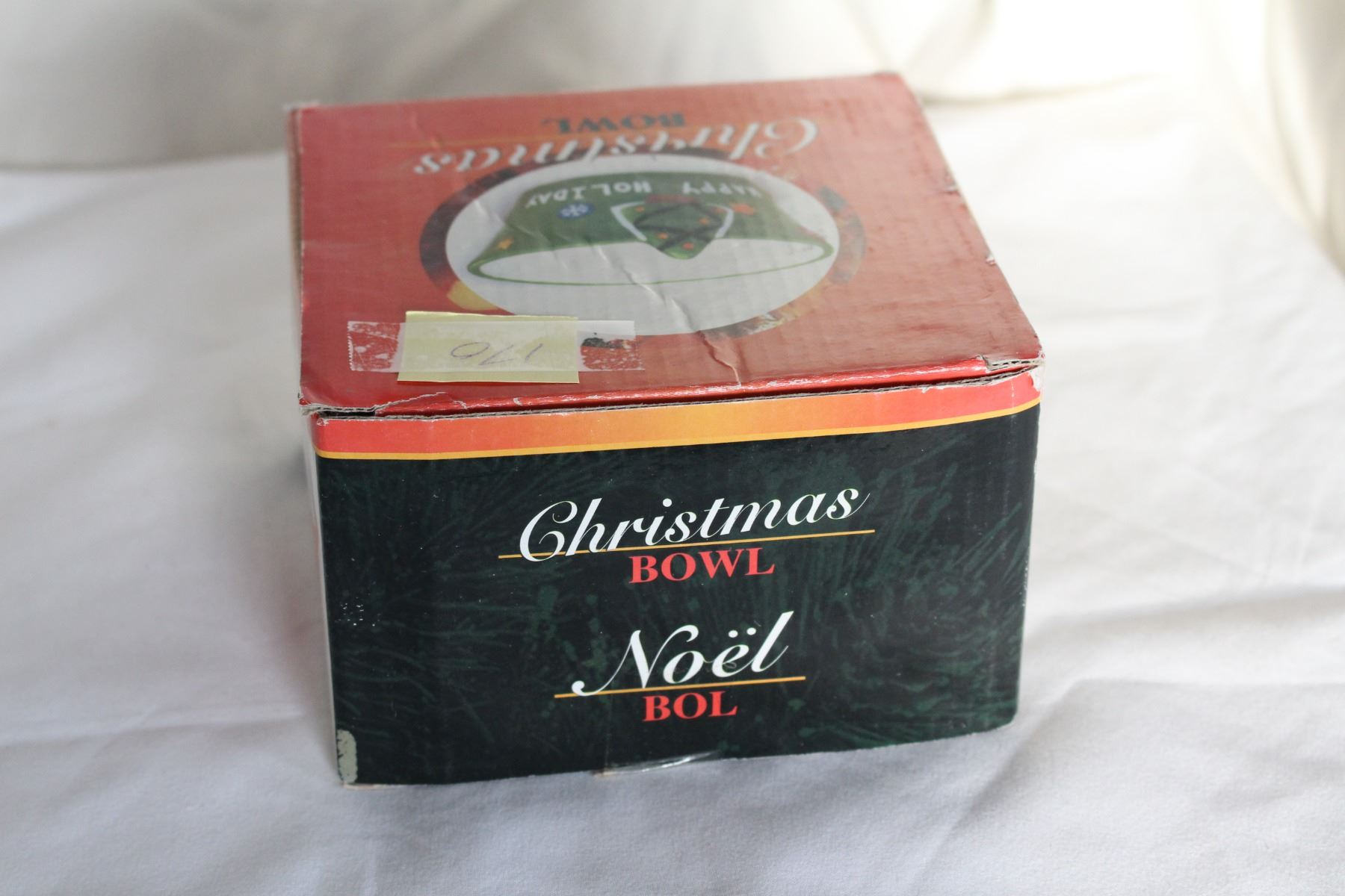 Christmas Bowl in original box. 5.5 inches (13.5 cm) in diameter, 3.25 inches (8 cm) high, bright blue exterior with white interior.