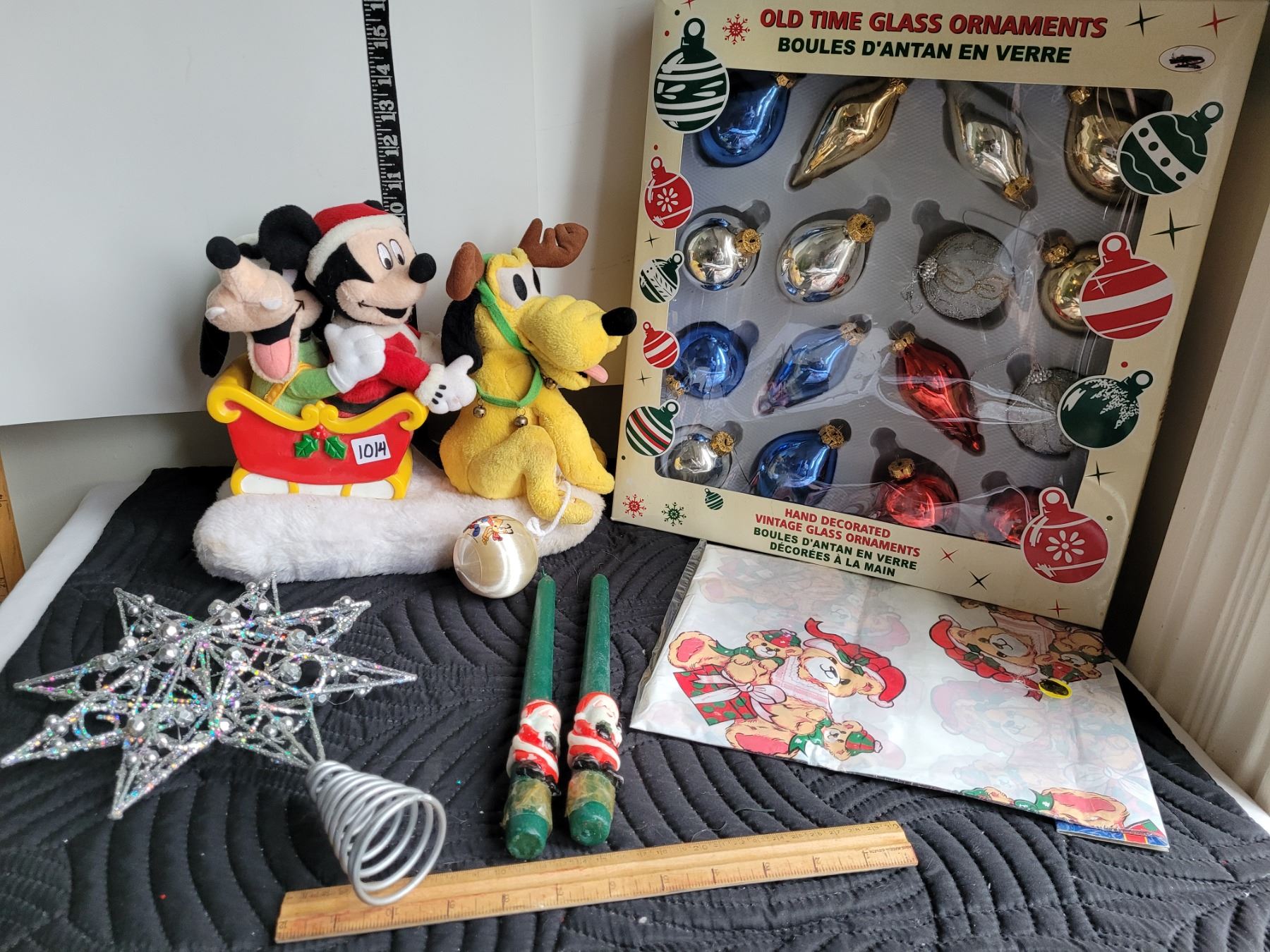 Christmas Vintage decorated glass bulbs, tree topper star, candles, plus a plush, singing Disney holiday decor.