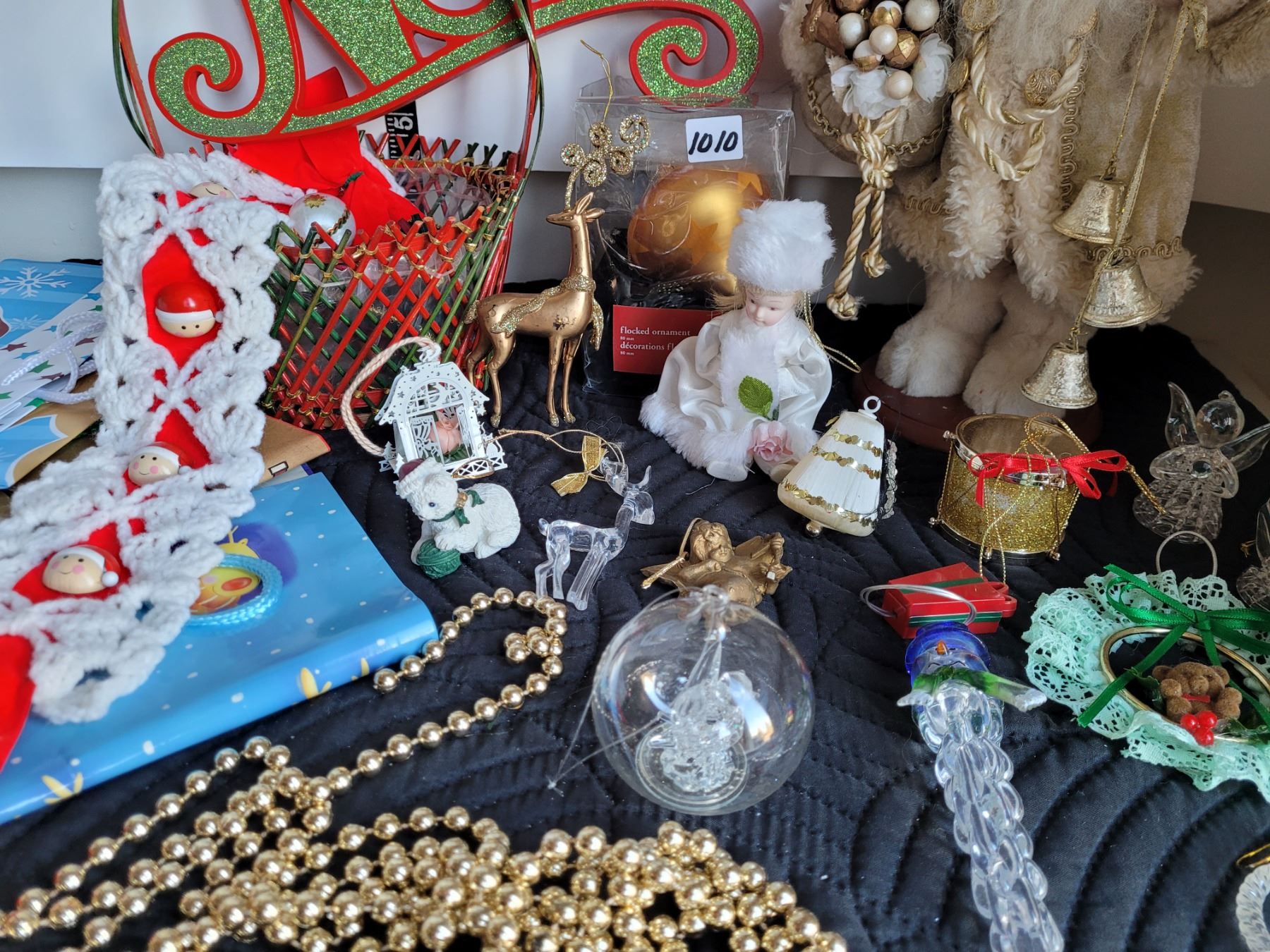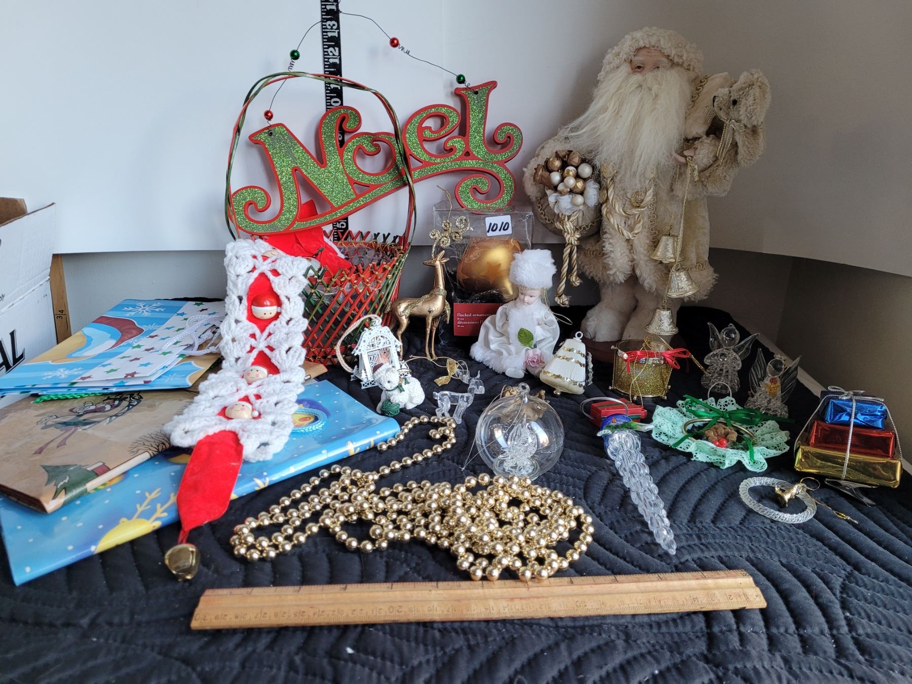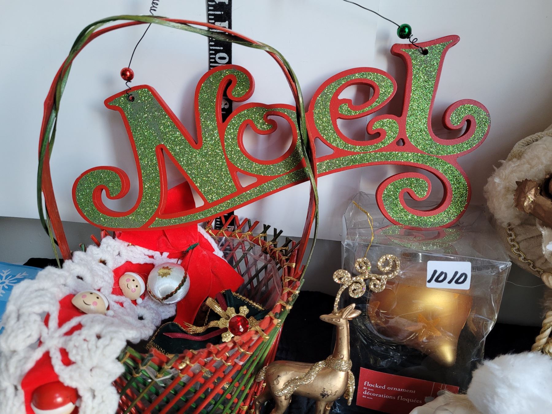Christmas decor. Gift bags, glass ornaments, St Nicholas, basket with misc.