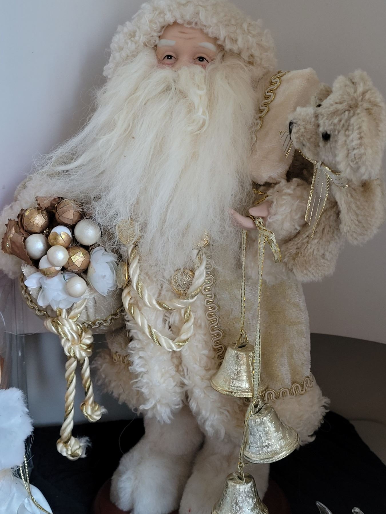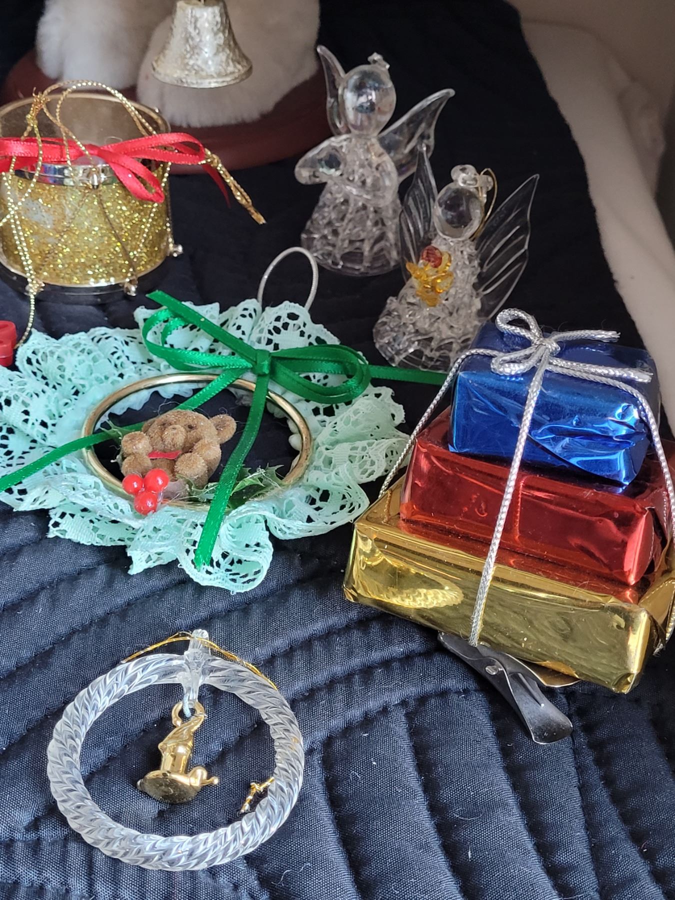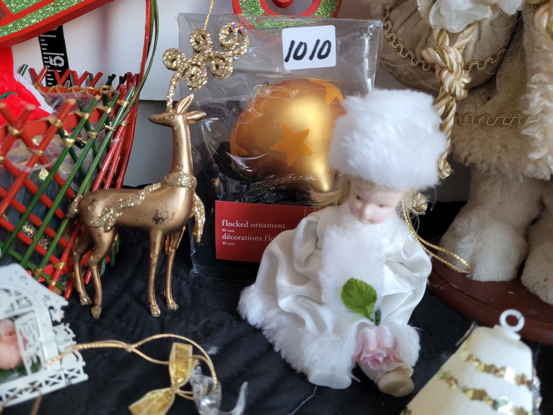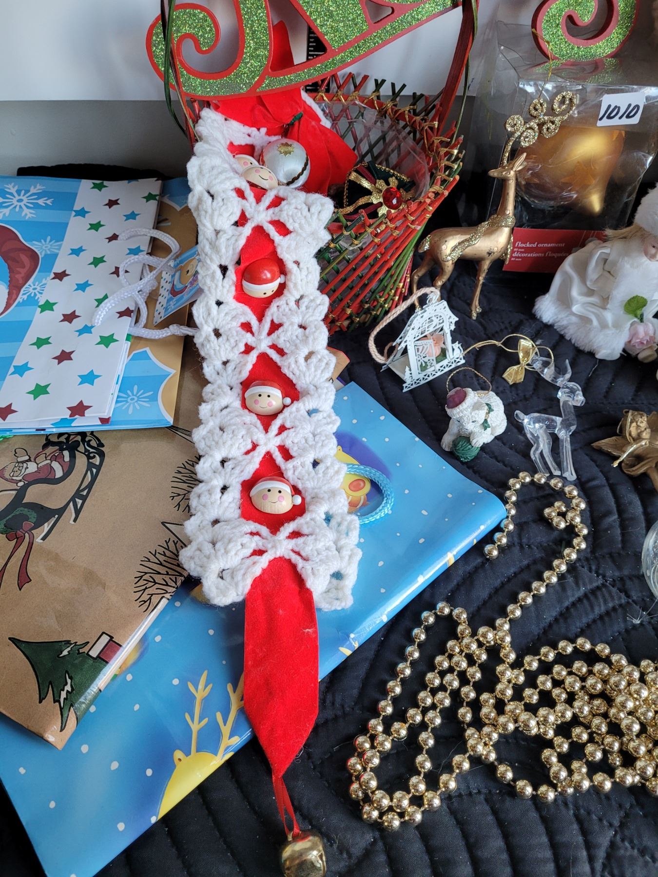 Christmas decor. Gift bags, glass ornaments, St Nicholas, basket with misc.