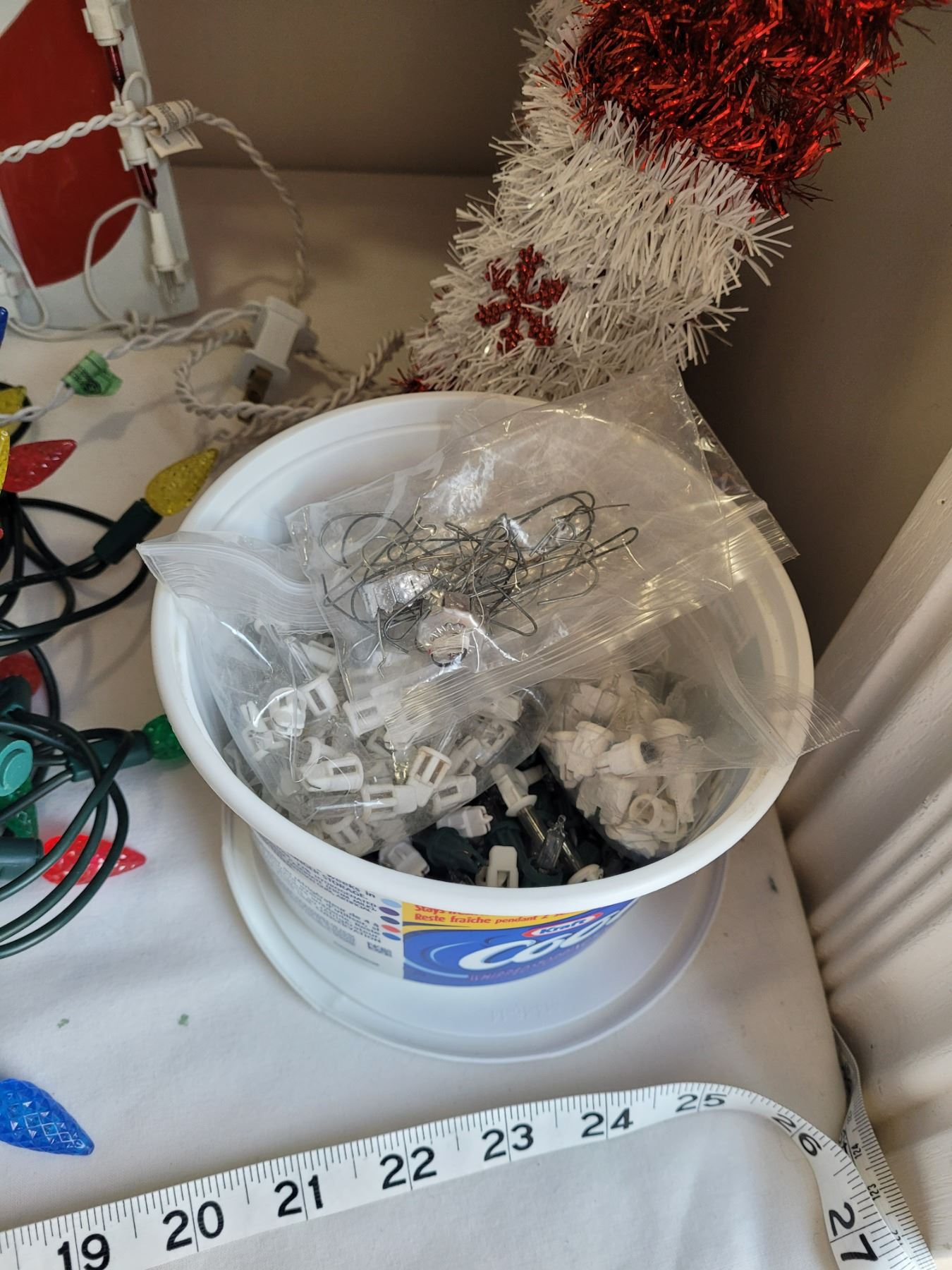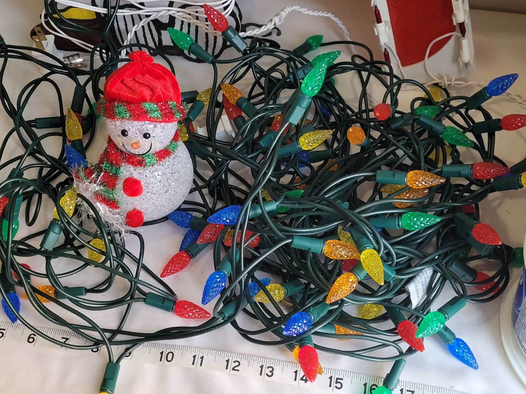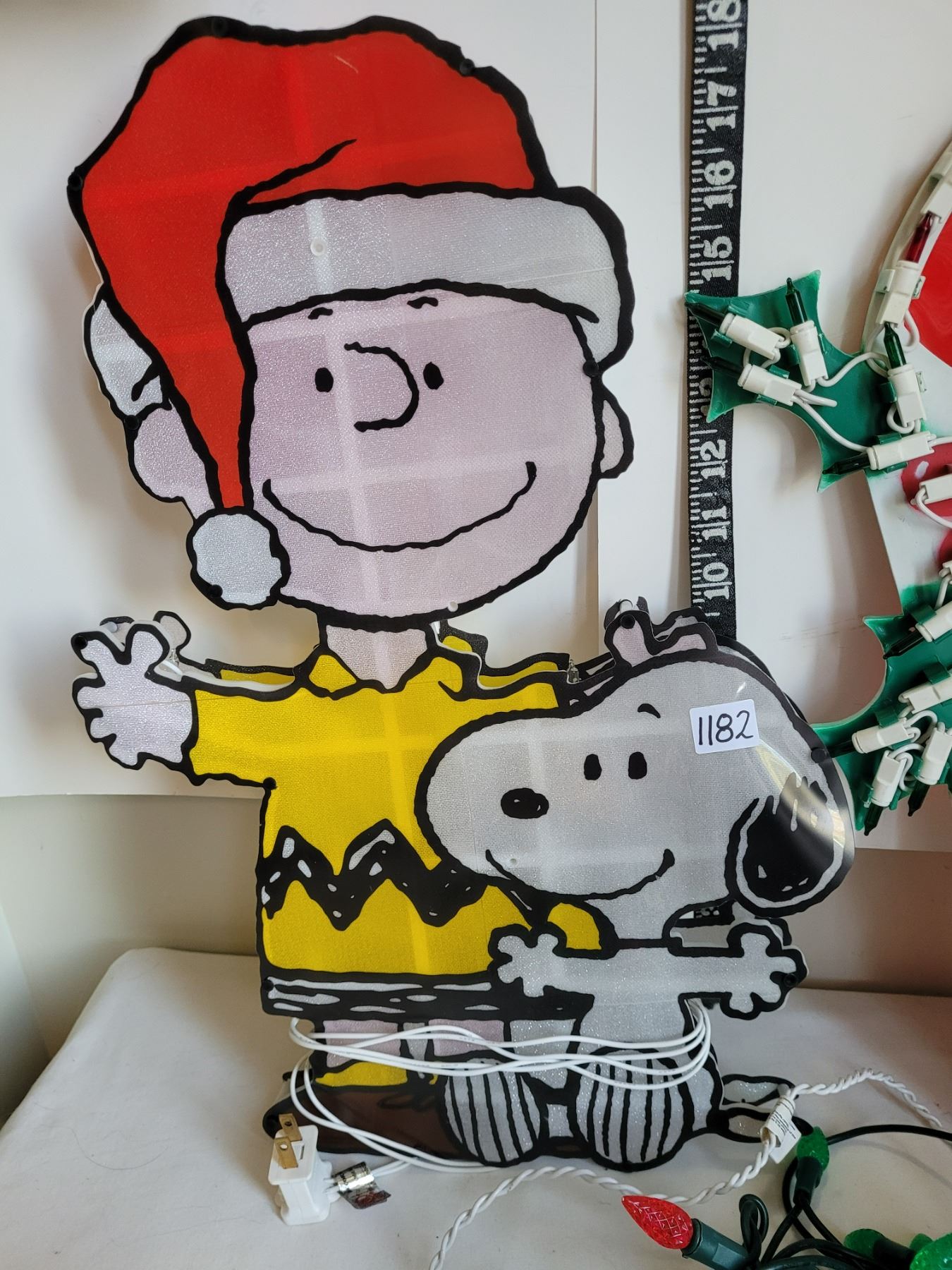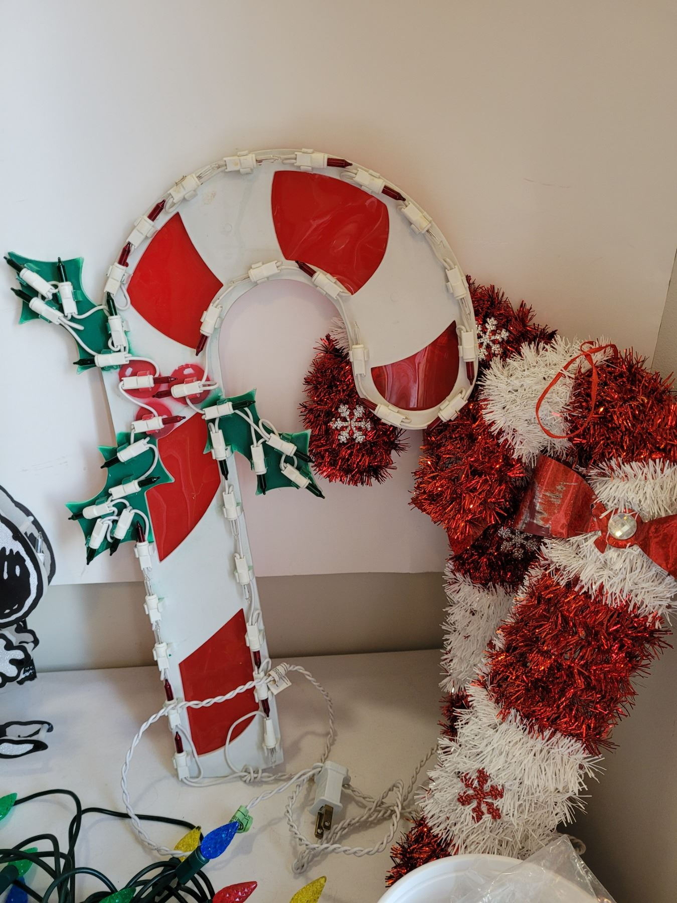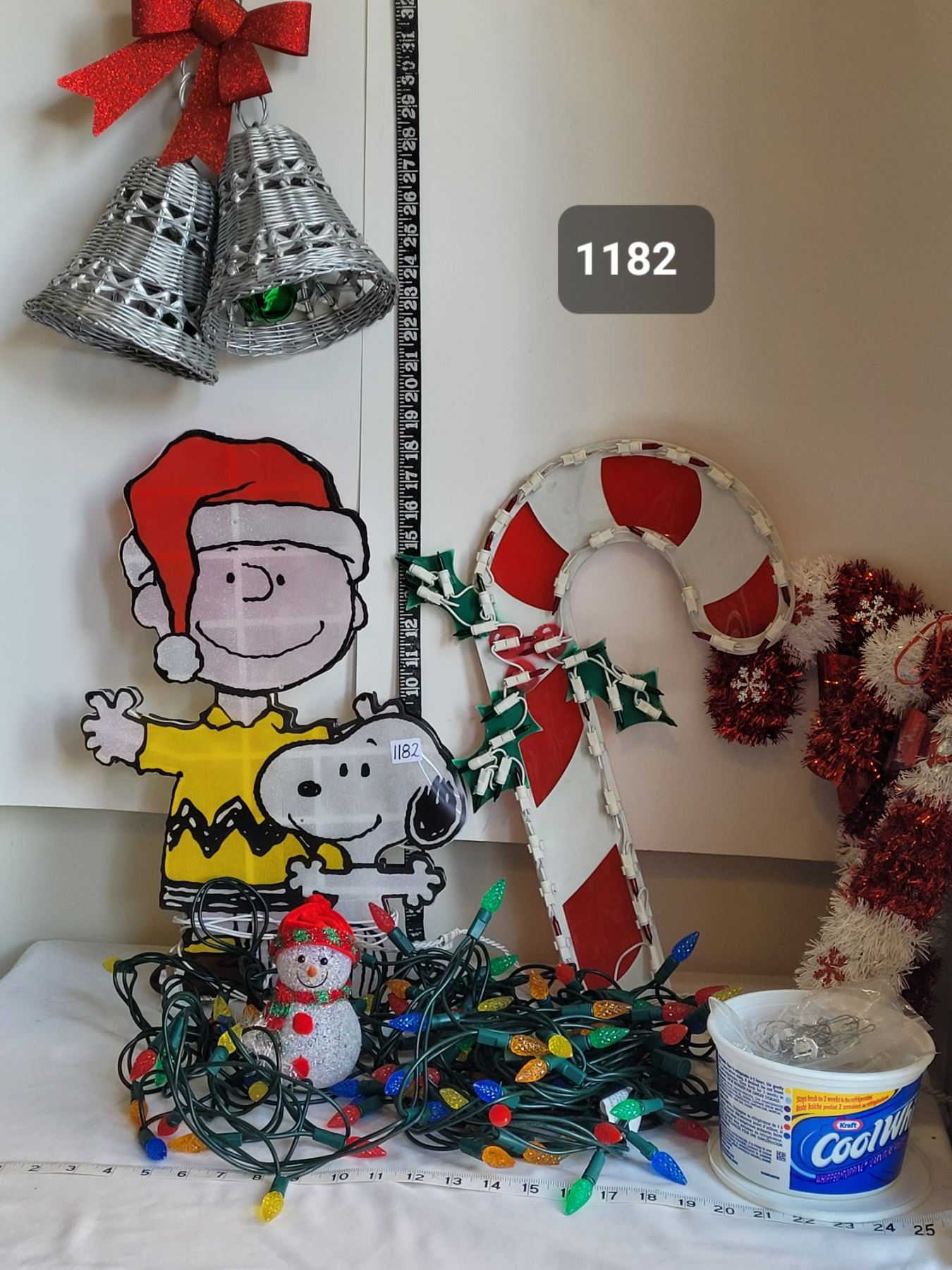 Christmas decor. Led lights, window Charlie Brown & candy cane lights & hanging silver bells.