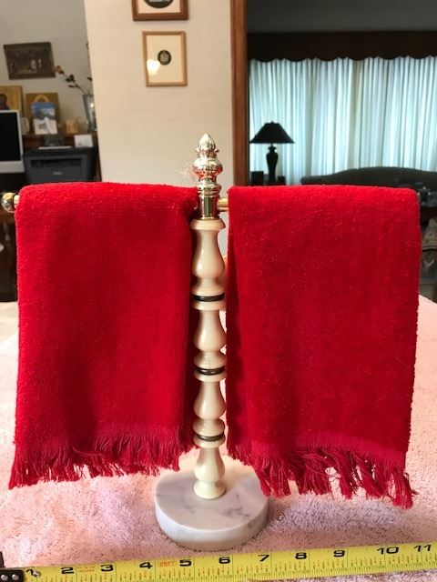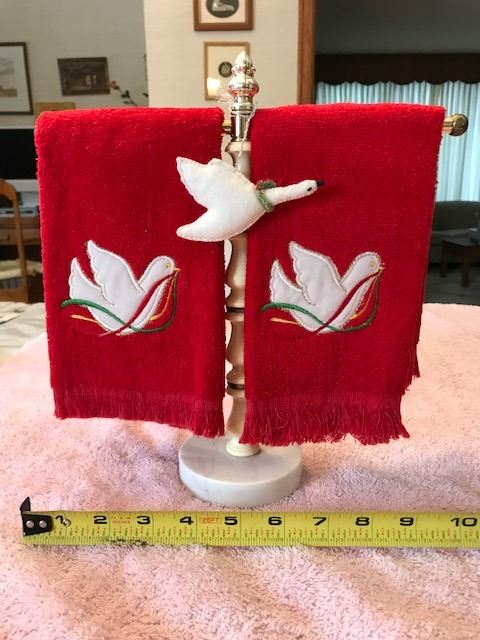 Christmas dove hand towels and dove decoration on a small towel bar. Towel bar 10.75” (27.5 cm) wide x 11.5” (30 cm) tall. All excellent condition.