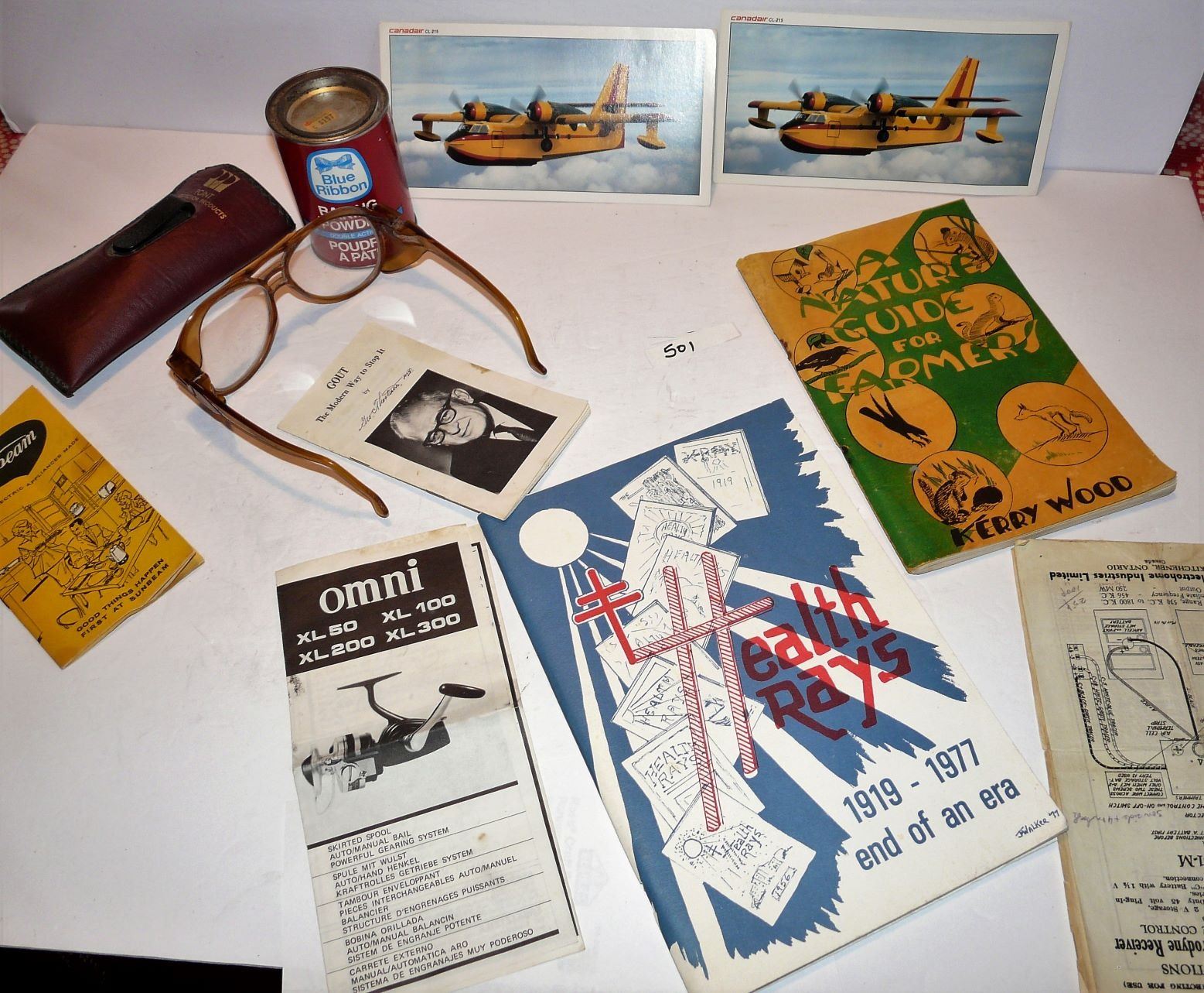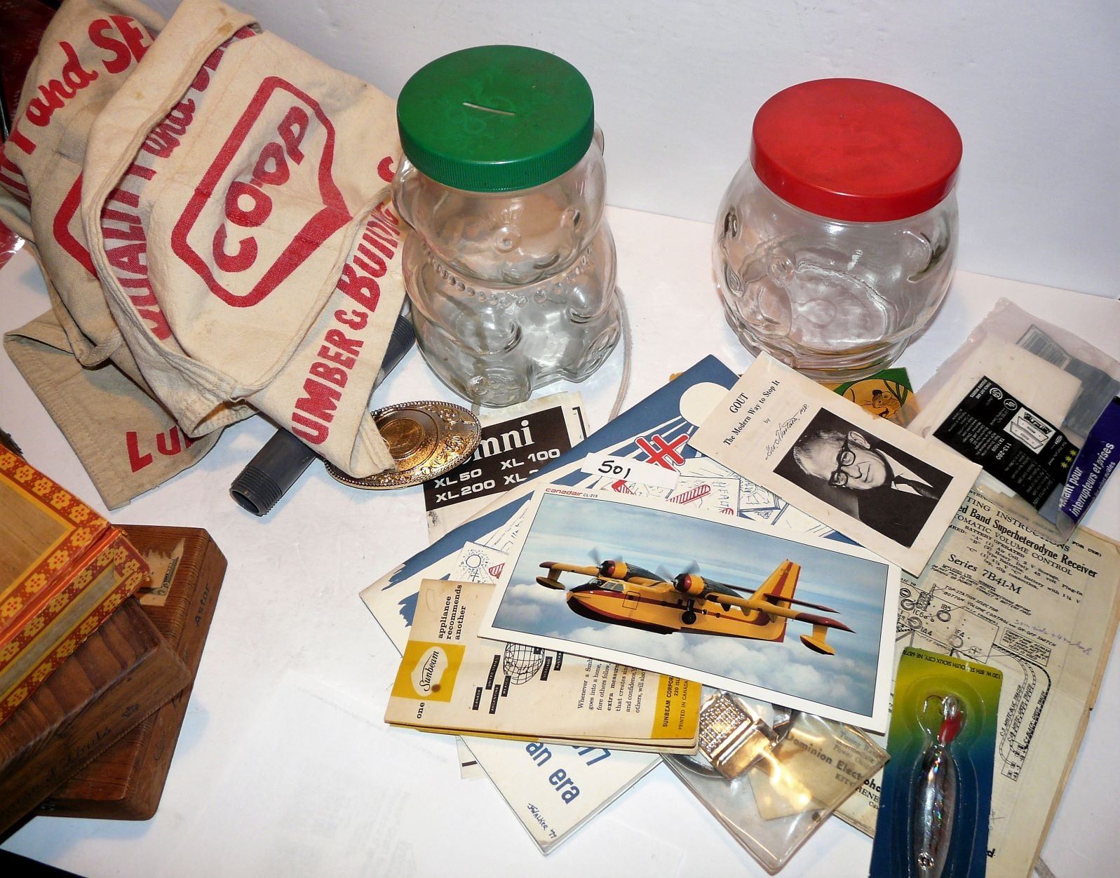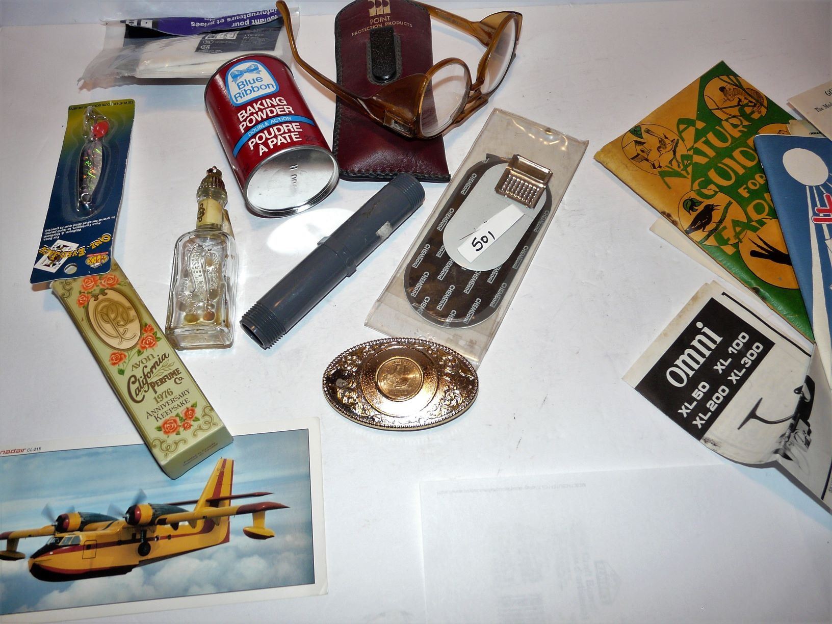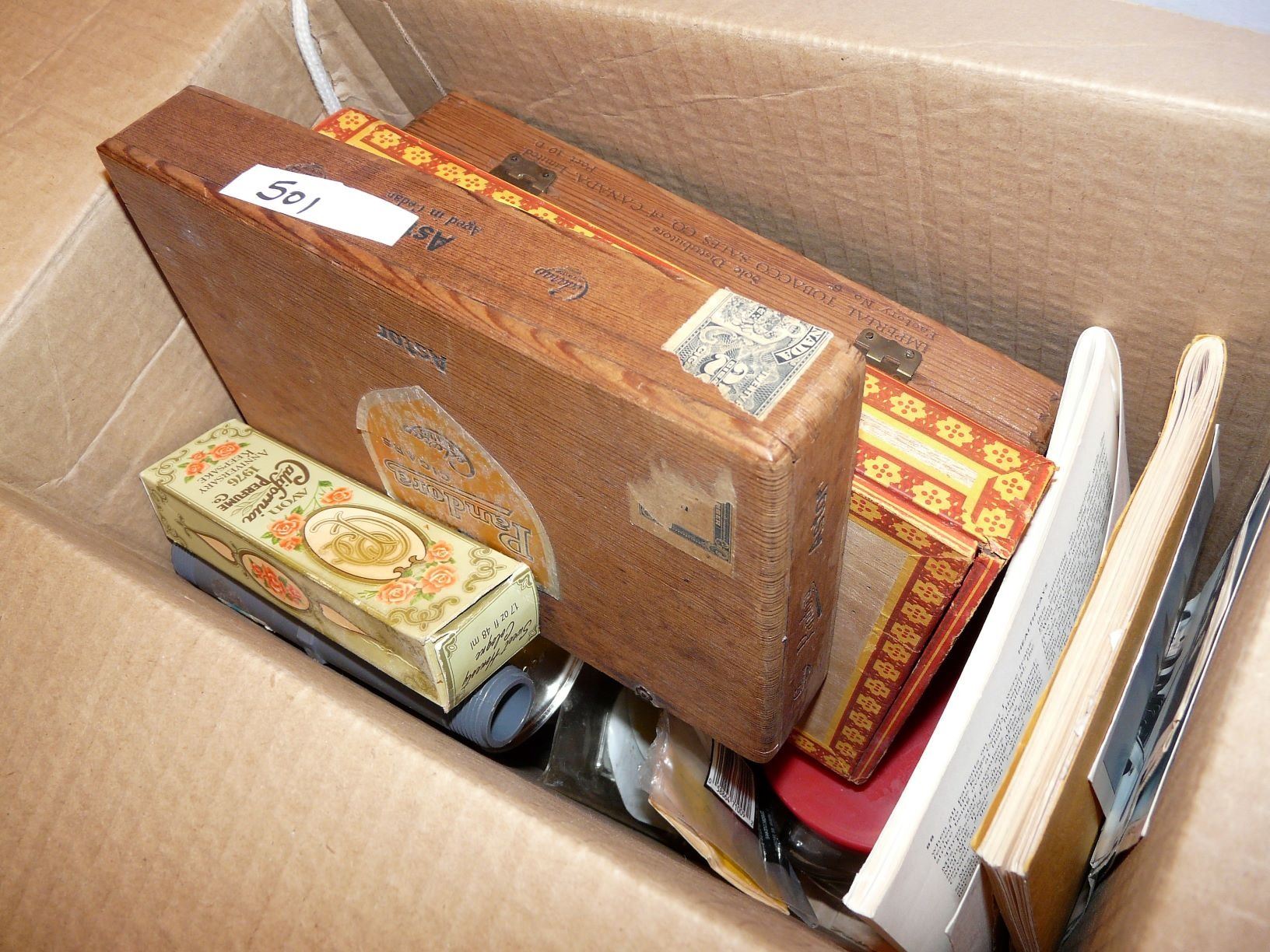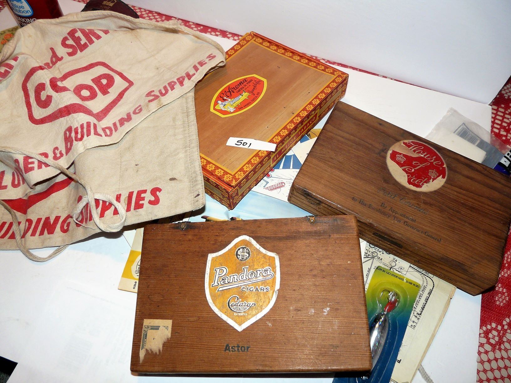 Cigar Boxes, Cheez Whiz Jars, Aprons, Books, Belt Buckle, Fishing Lure, Etc.