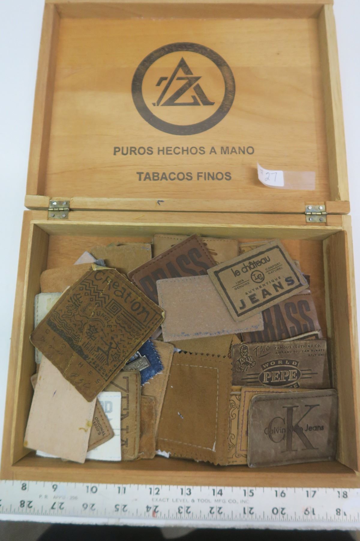 Cigar box of leather patches advertising jean brands