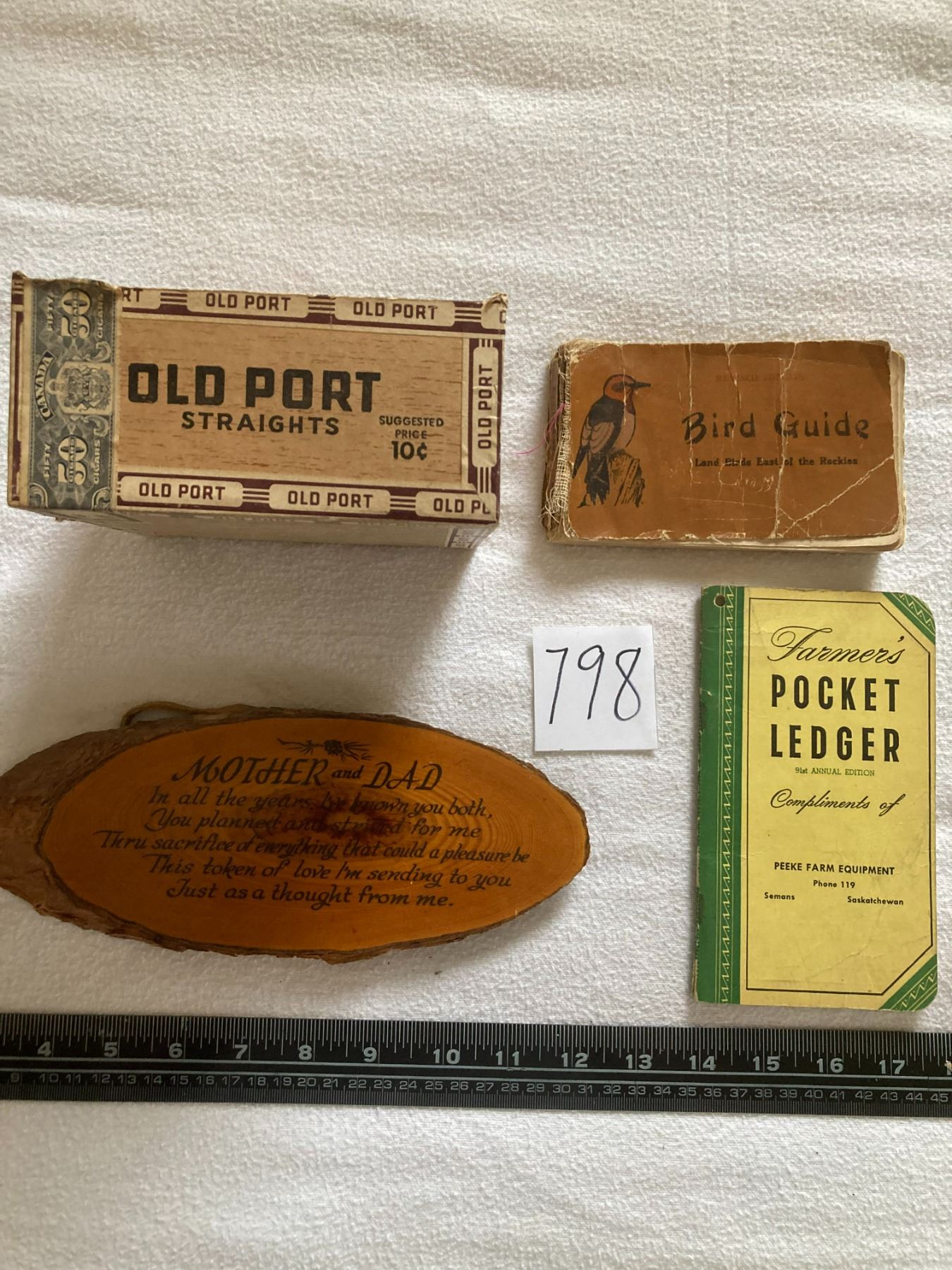 Cigar box, wall plaque, bird book, Farmers' pocket ledger