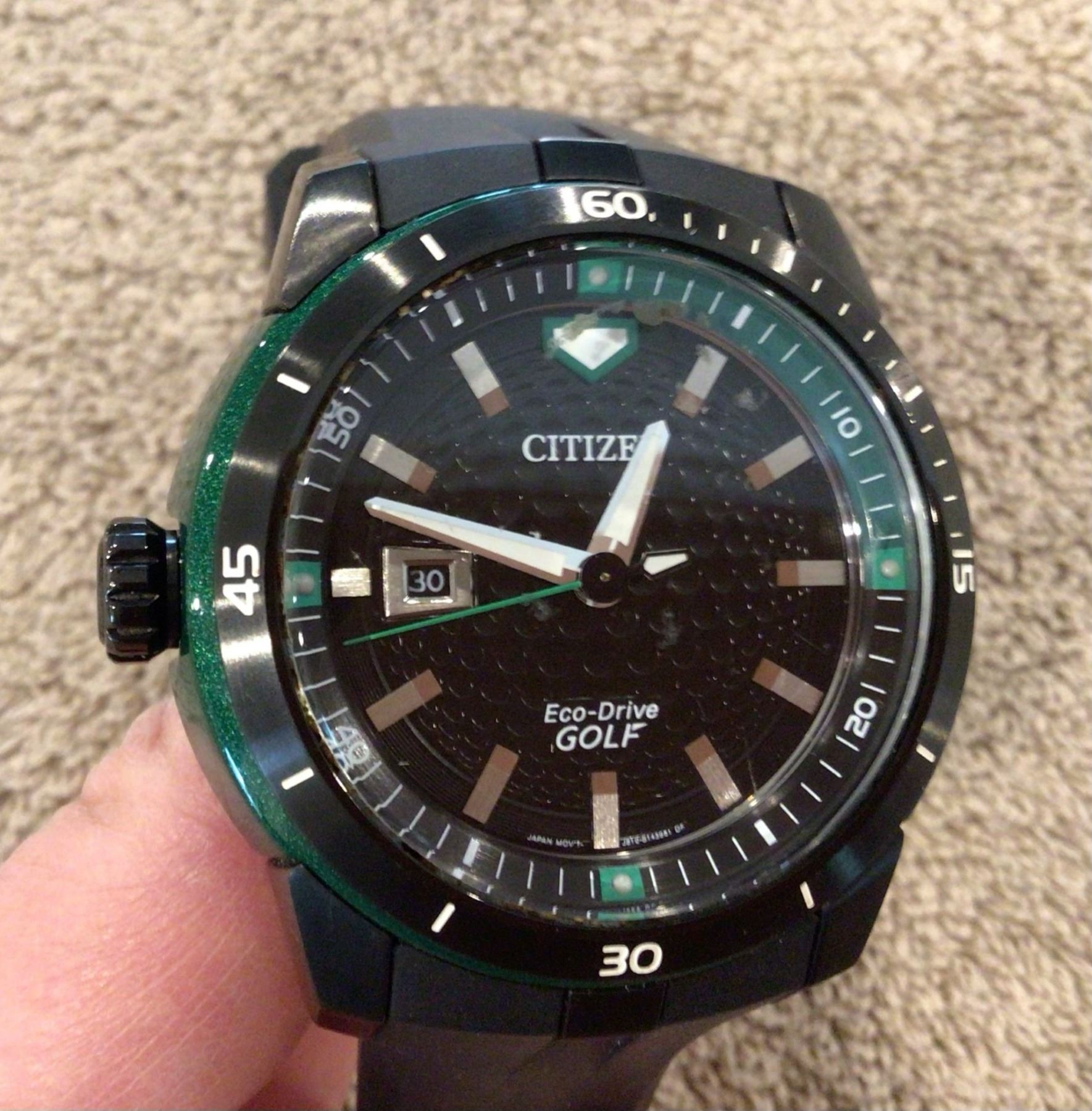 Citizen Eco-Drive golf watch. Black/green stainless steel case, black polyurethane strap. Luminous accents, date window, solar powered. Looks like new.
