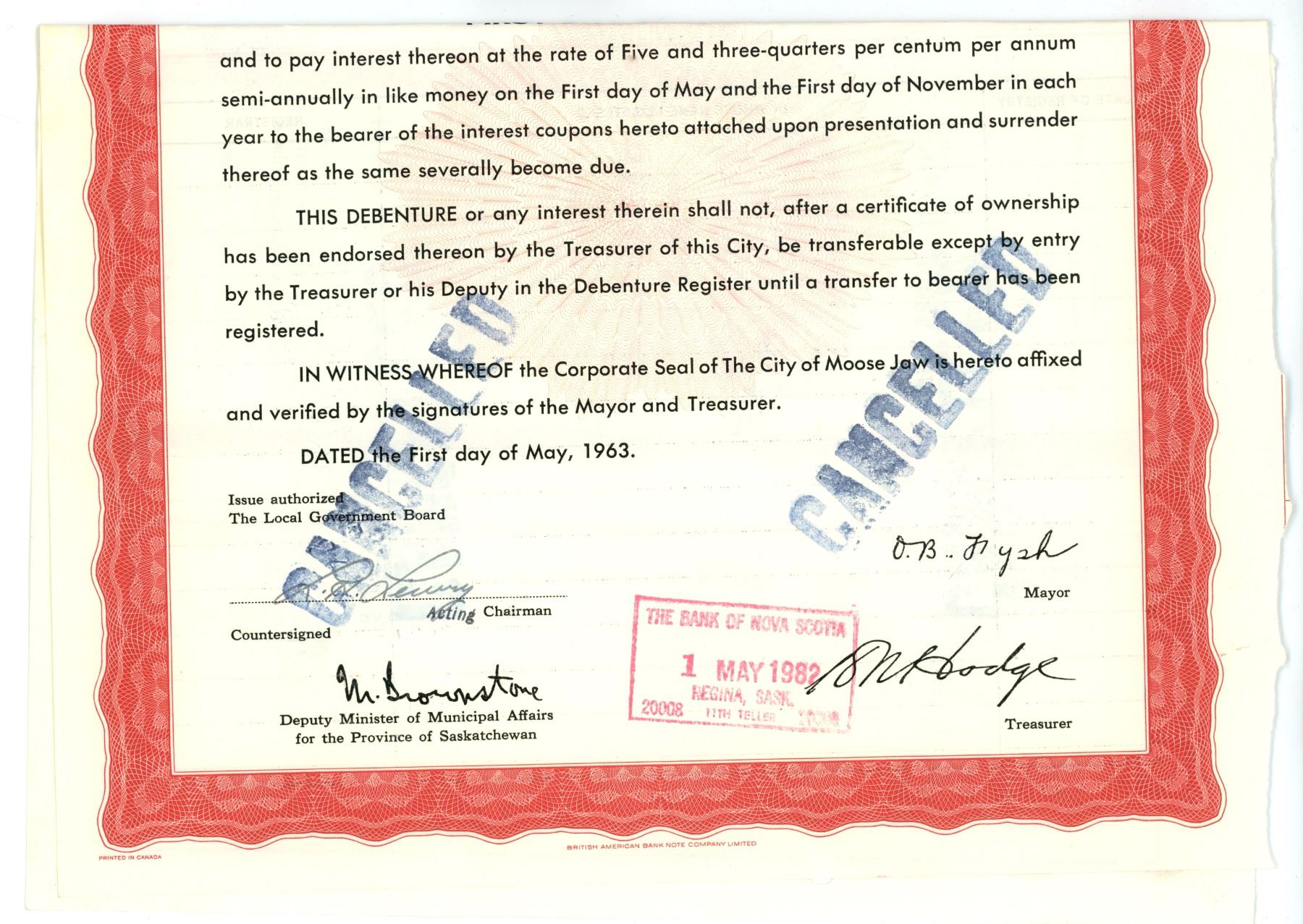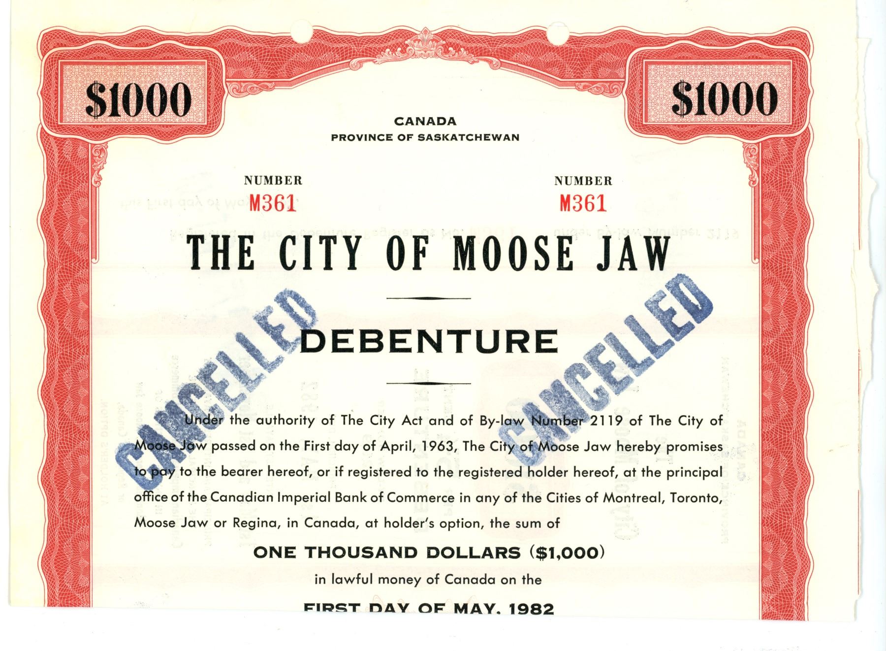 City of Moose Jaw 1963 $1000 Cancelled Debenture.