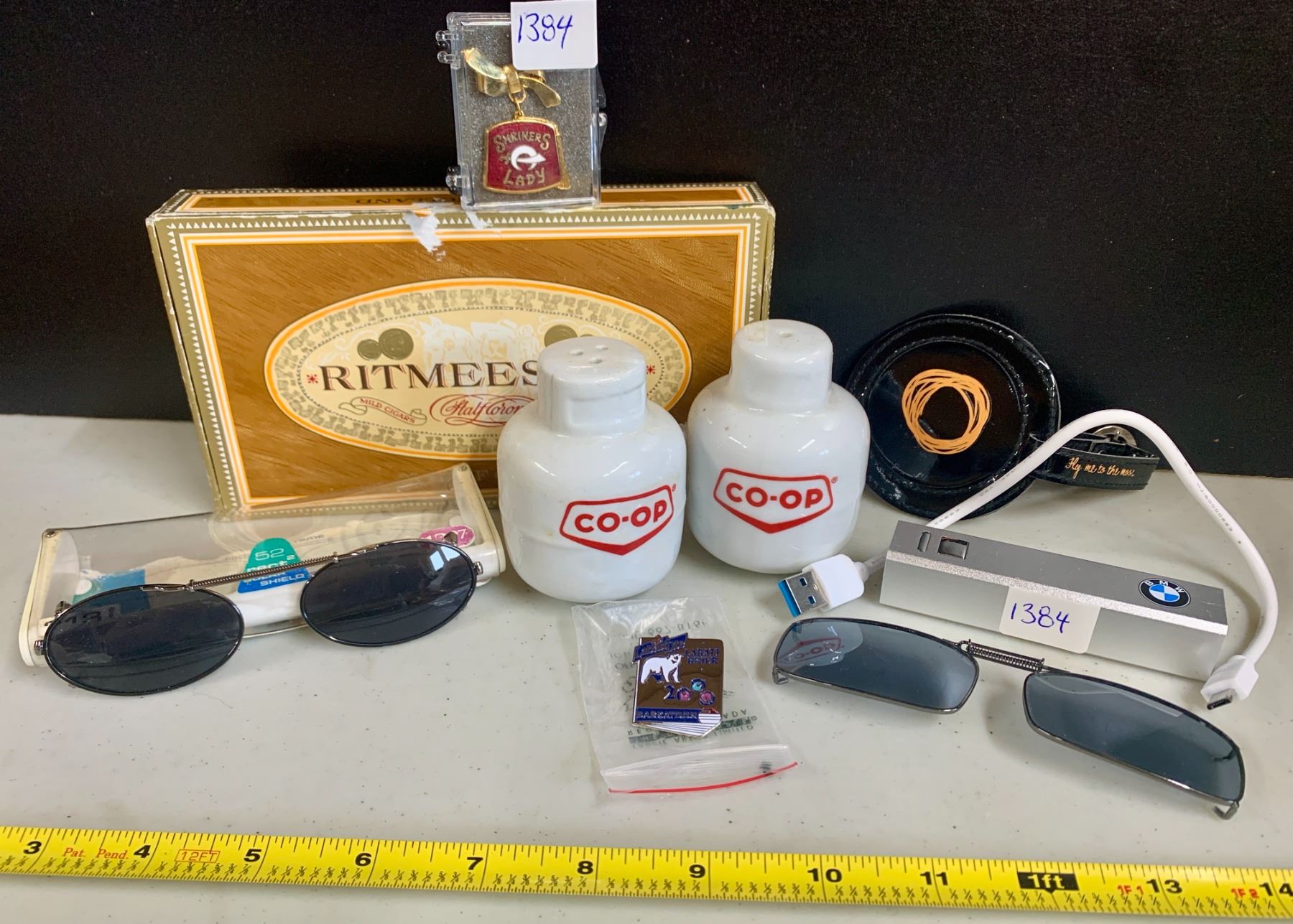 Clip-On Sunglasses/CO-OP Salt & Pepper Shakers/Power Bank/Pins/Ritmeester Cigar Box