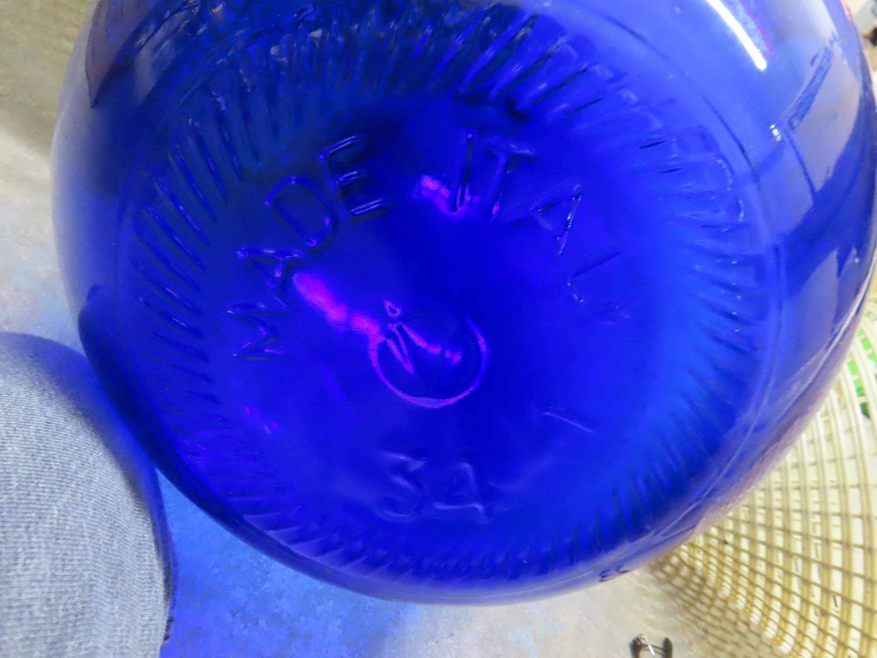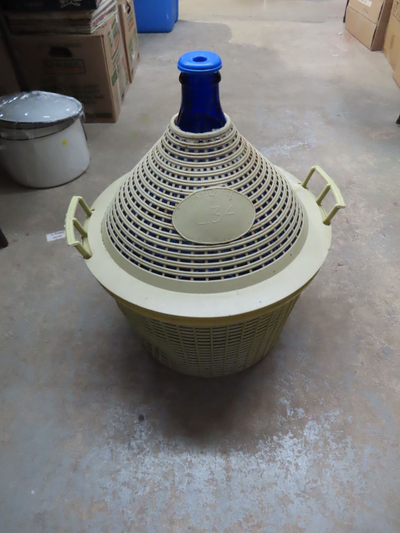 Cobalt Blue Jug w/ Plastic Holder; Stamped Italy