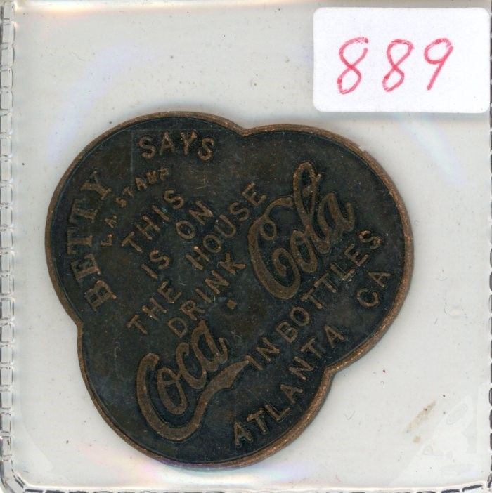 Coca-Cola medal that reads “L.A. Stamp, Betty says This is On the House, Drink Coca-Cola in Bottles, Atlanta, GA.”