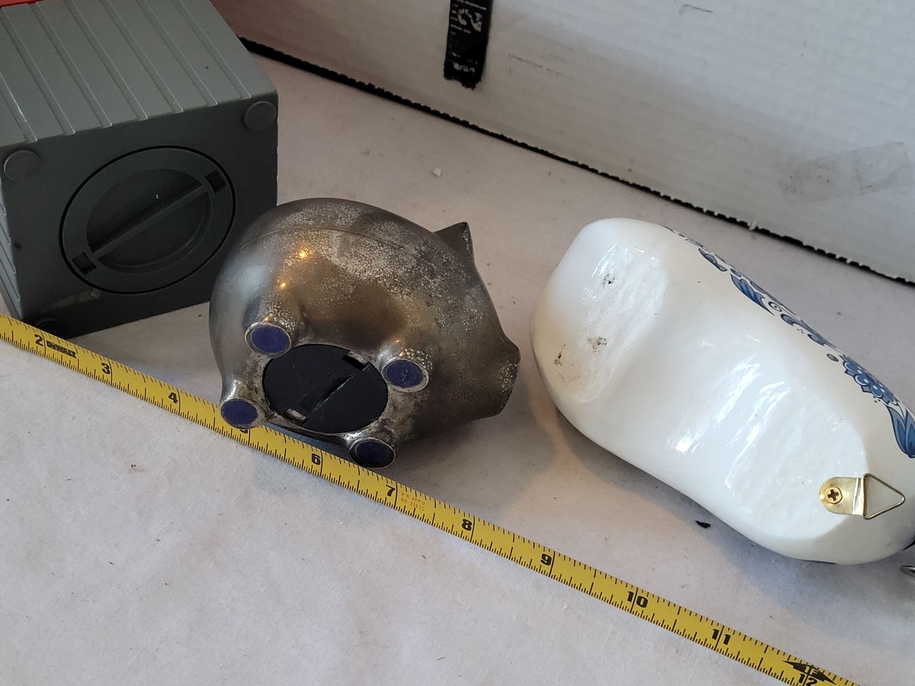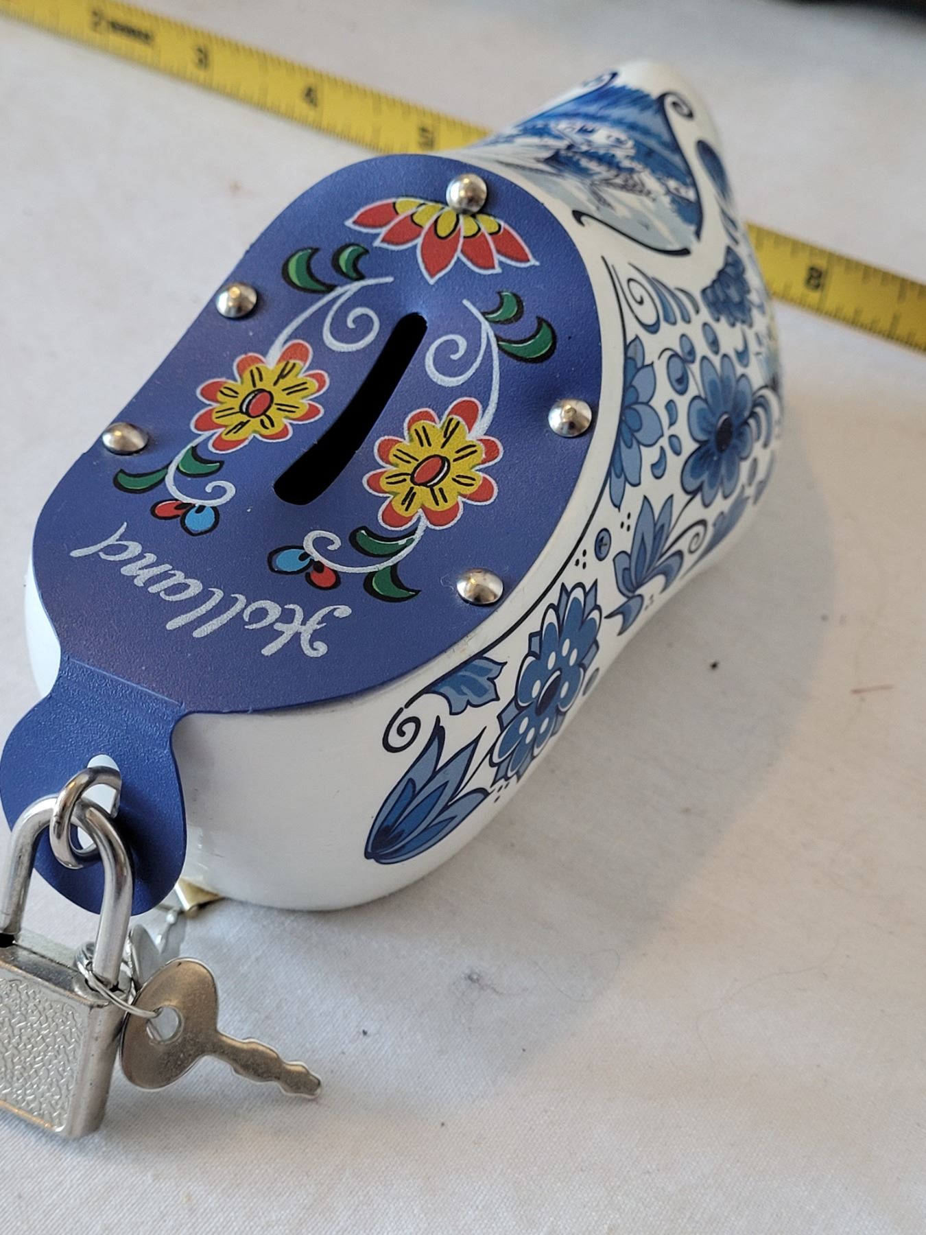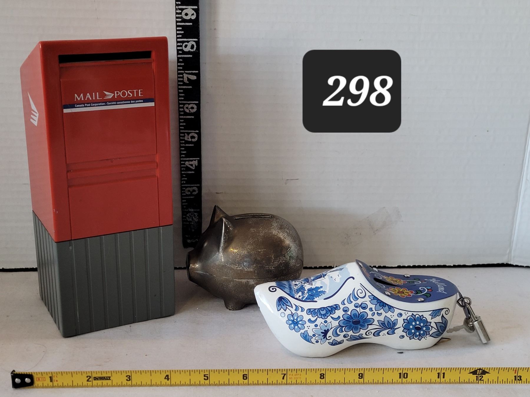 Coin Banks. Silver plated piggy, Canada post box & Holland hand painted shoe.(lock & key)