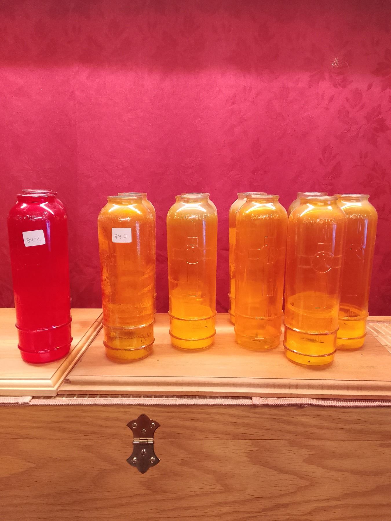 Collection of 12 Sanctuary Lamp Glasses used. - Nine amber glass sanctuary lamp reservoirs and three red glass reservoir. Traditional vigil lamps used in churches for perpetual light or memorials. Vintage religious items.