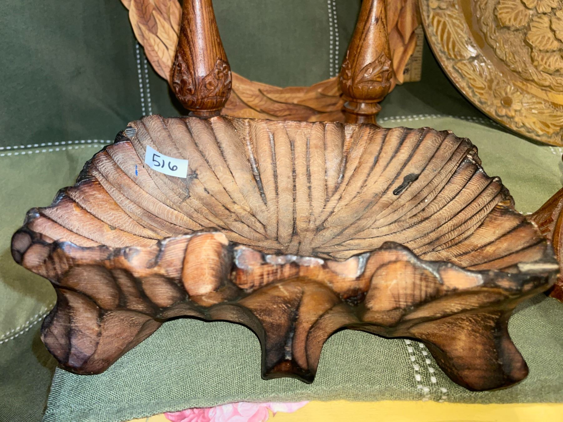 Collection of 9 assorted, vintage, wood carved pieces, including candle stick holders, vase, dishes, leaf wreath and floral plate