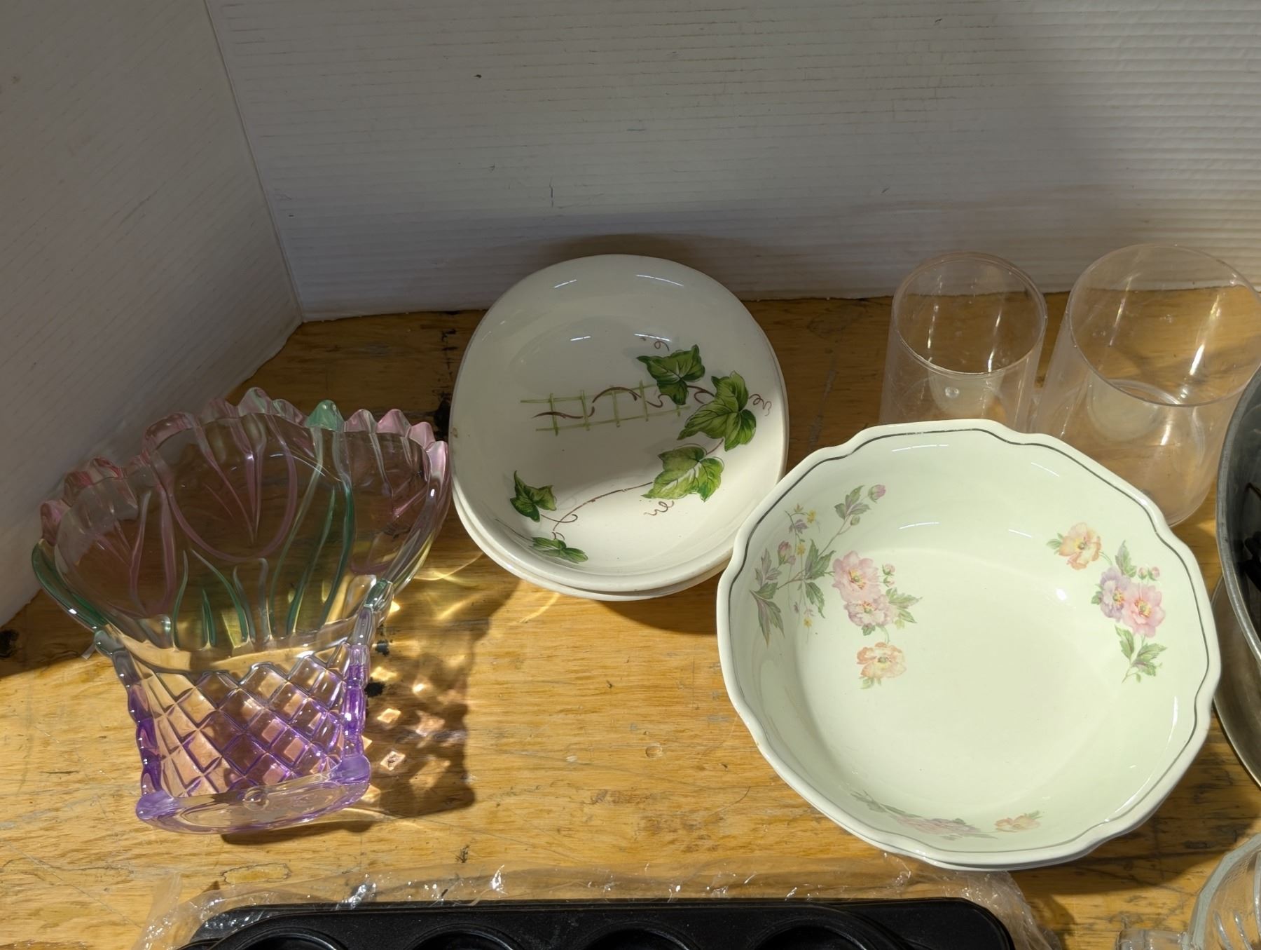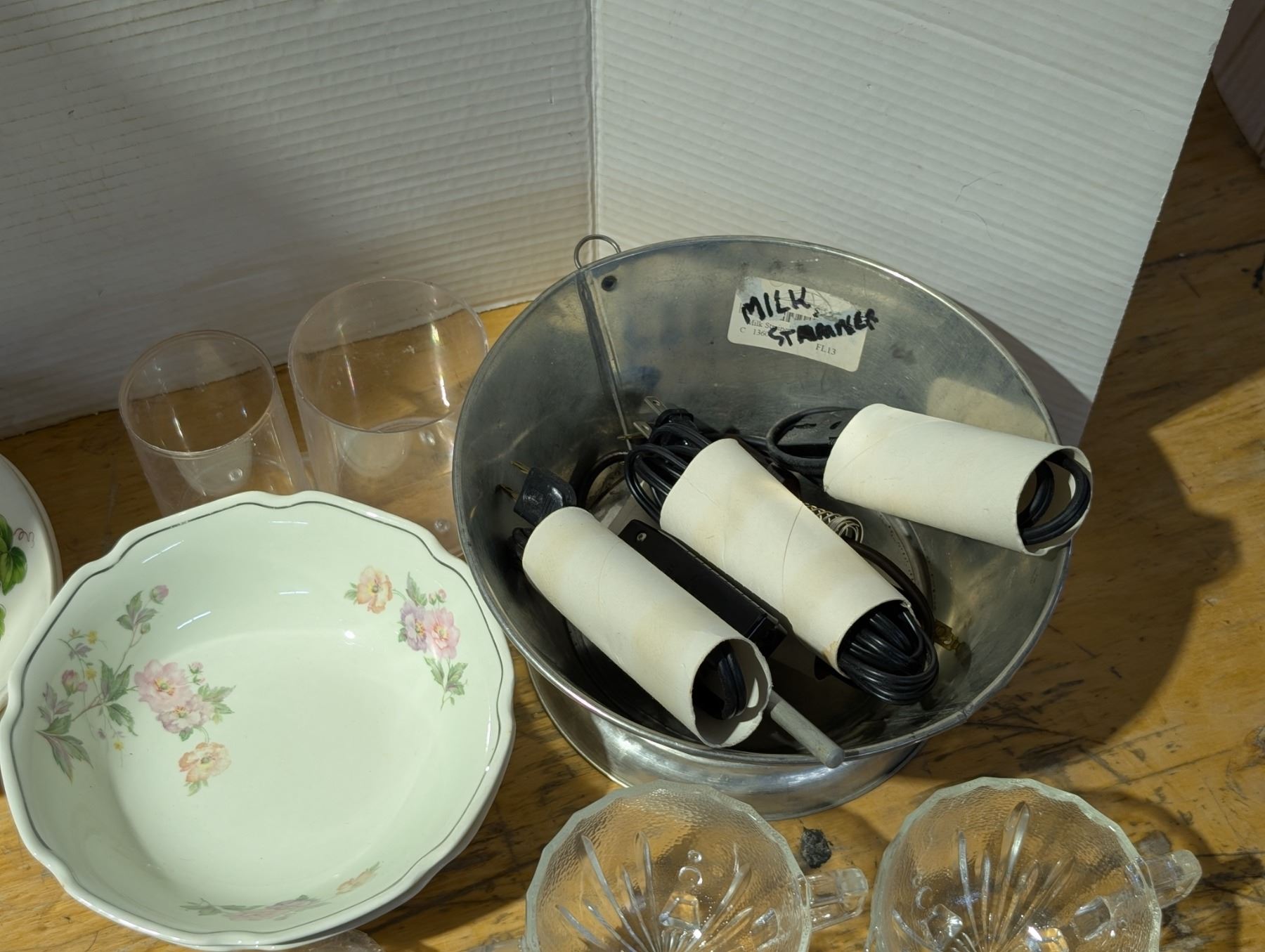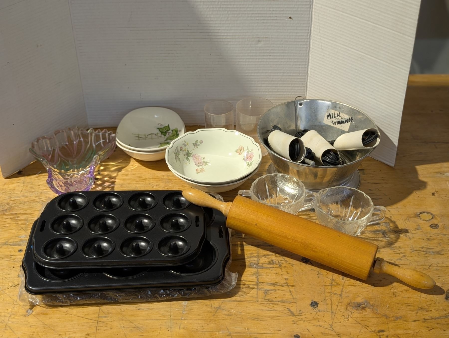 Collection of Kitchen Supplies (Cords For appliances, Bowls, Glass Bowls, Doughnut Trays, and etc.)
