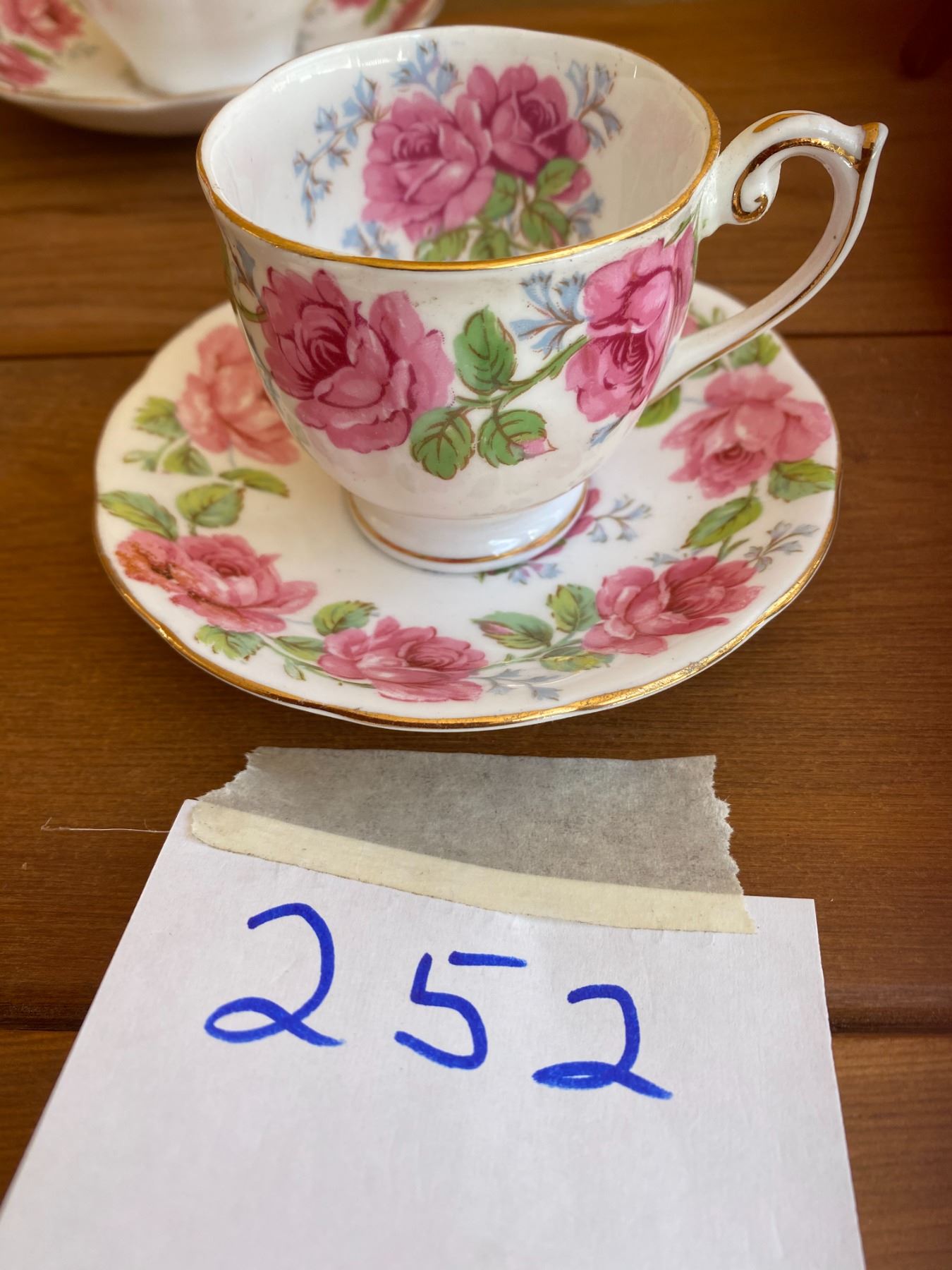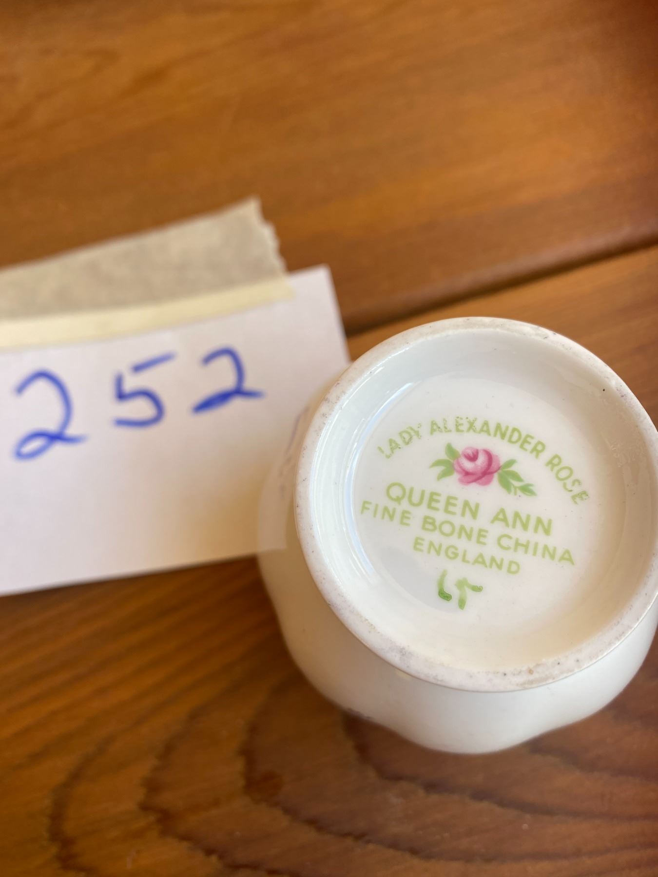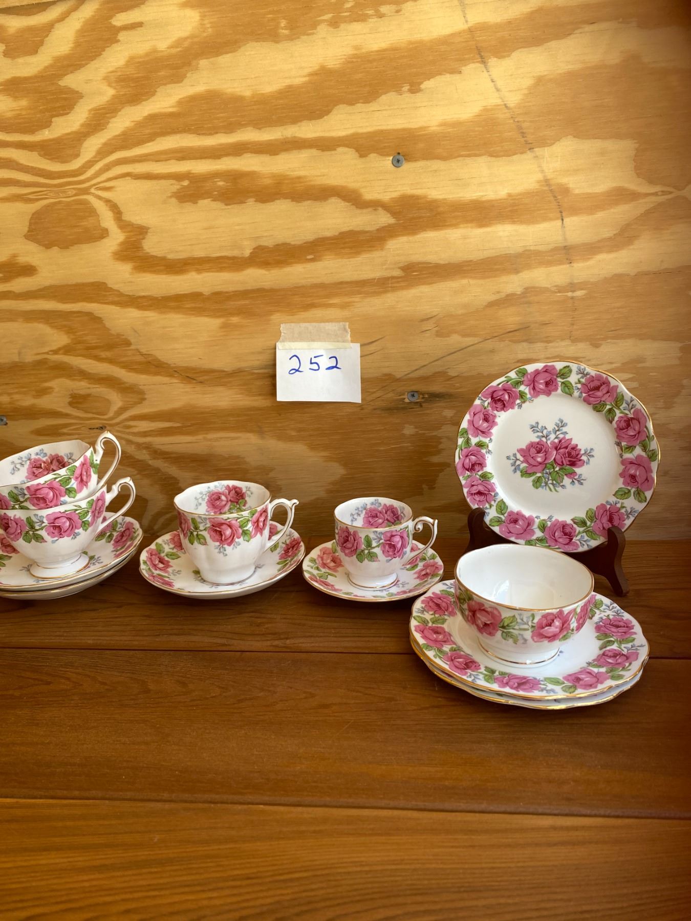 Collection of Queen Ann China " Lady Alexander Rose" 12 pieces: 2 large teacups& saucers/1 med. Teacup & saucer/ 1 mini teacup & saucer? 1 sugar bowl/ 3-6 1/2 " plates no chips/cracks/crazing