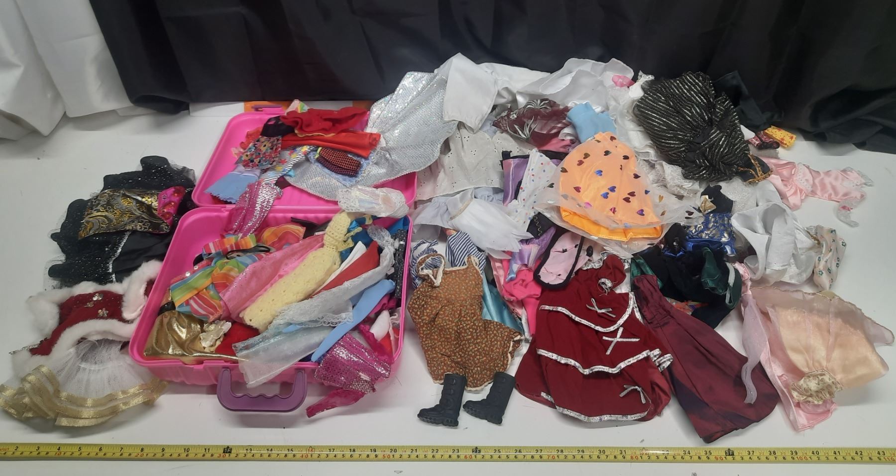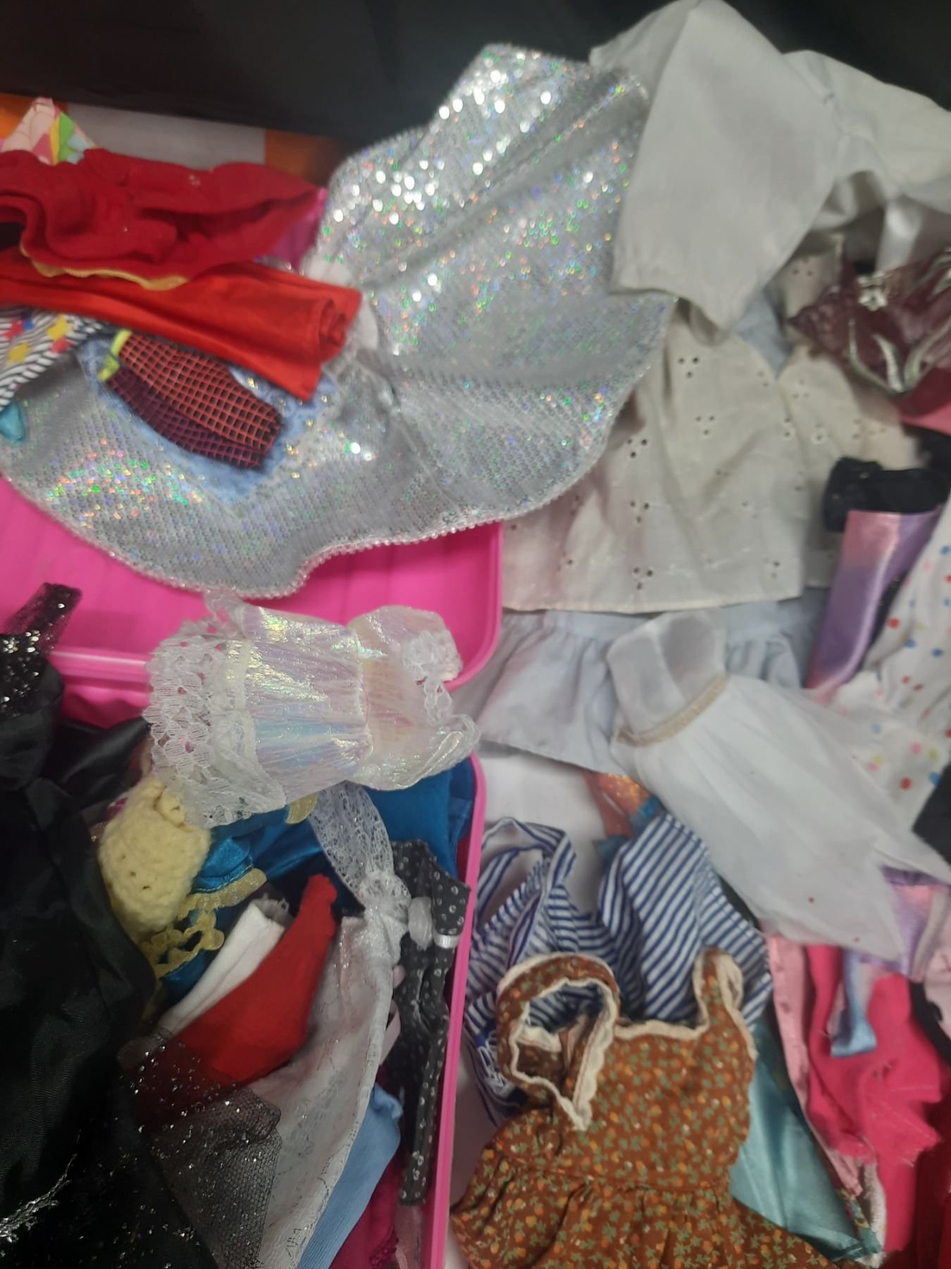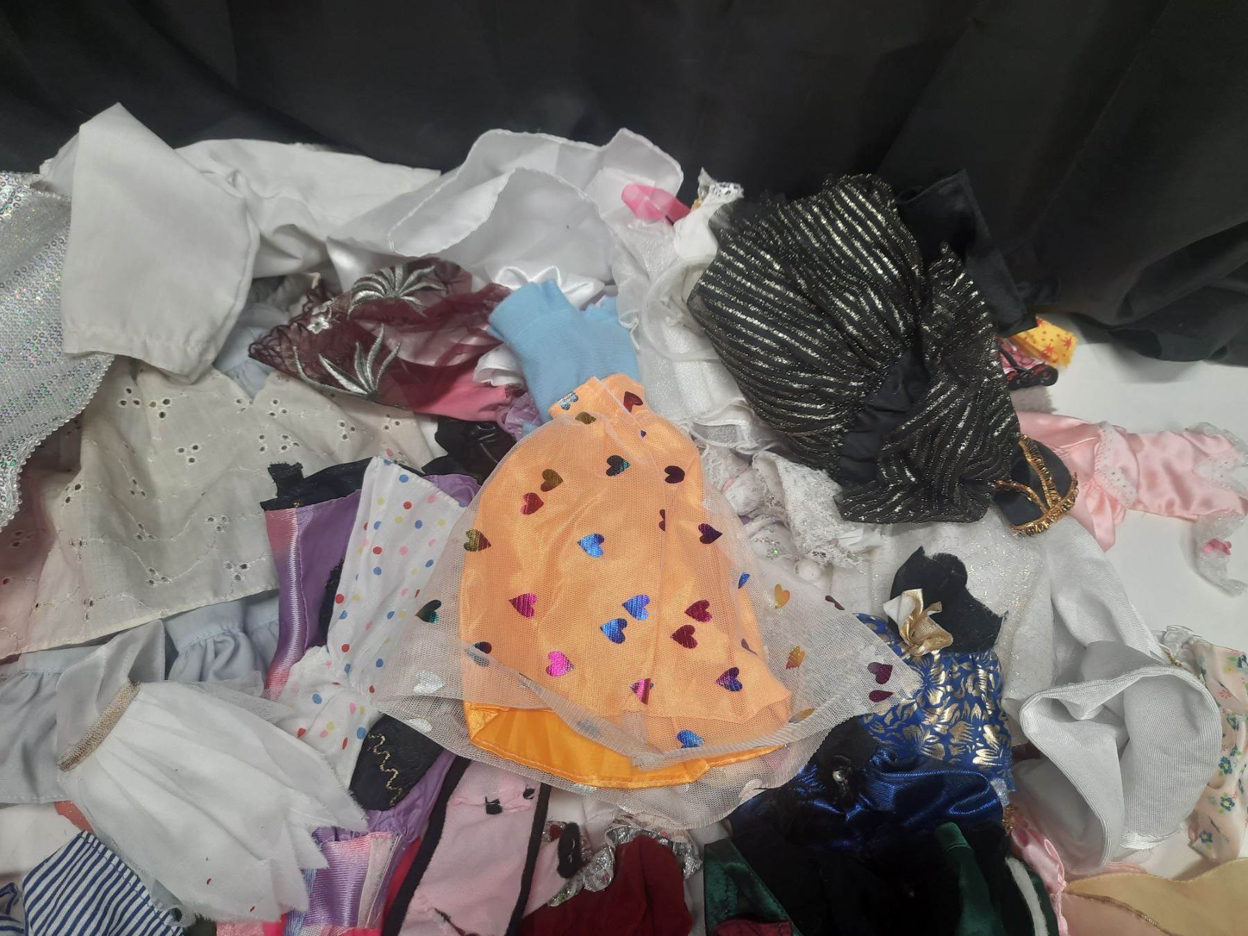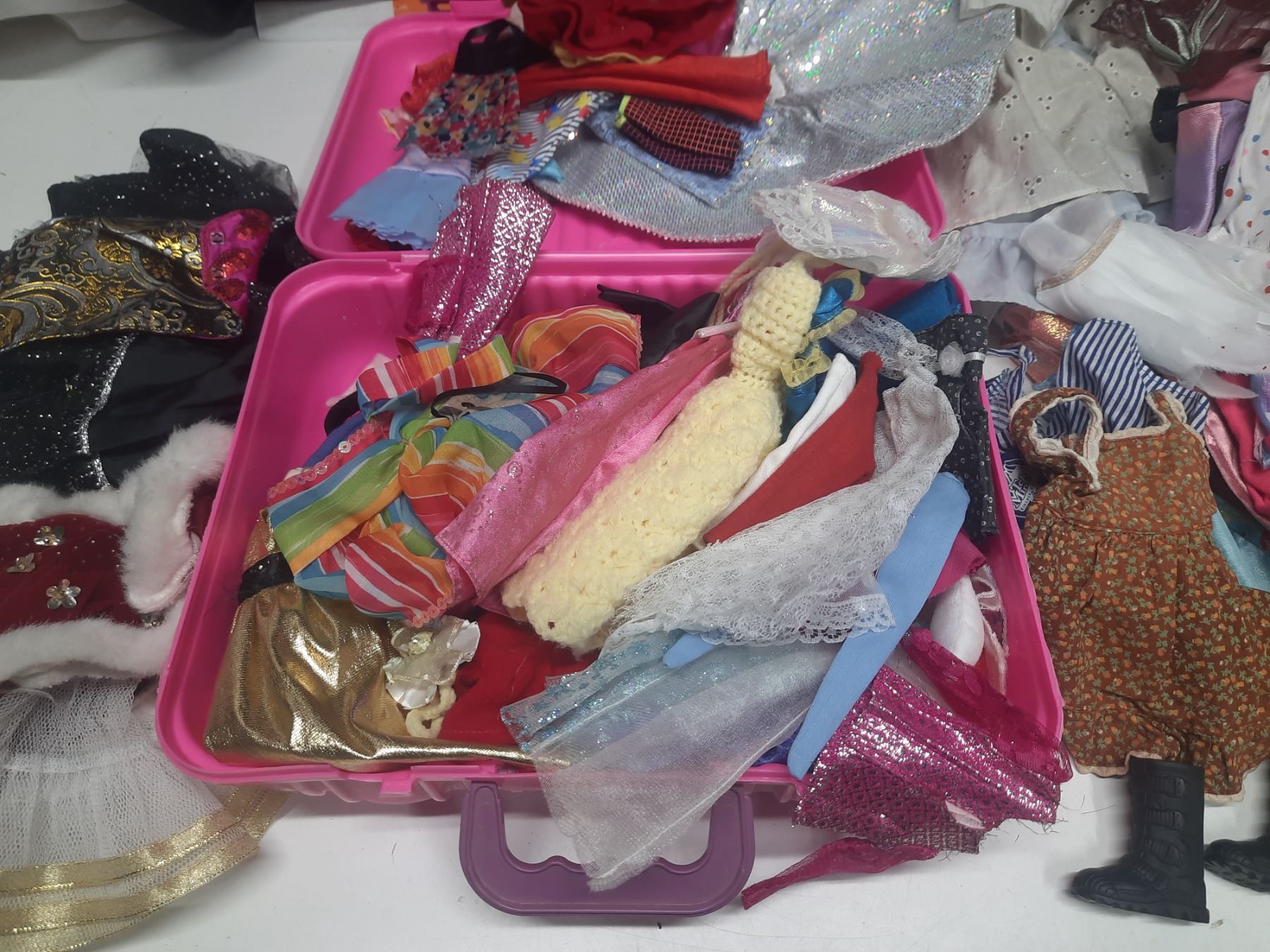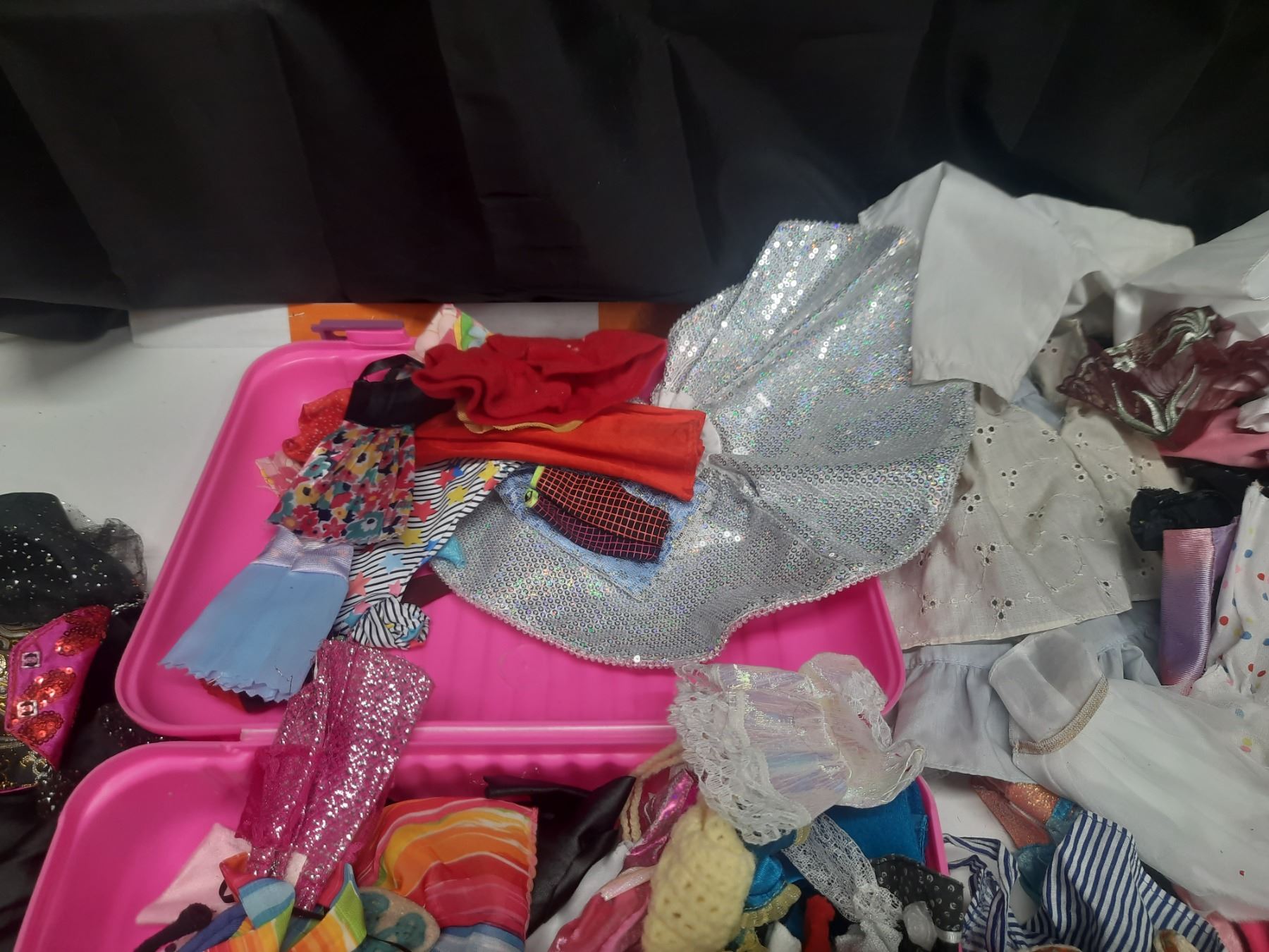 Collection of Vintage Doll Clothes of Different Sizes In Pink Case.