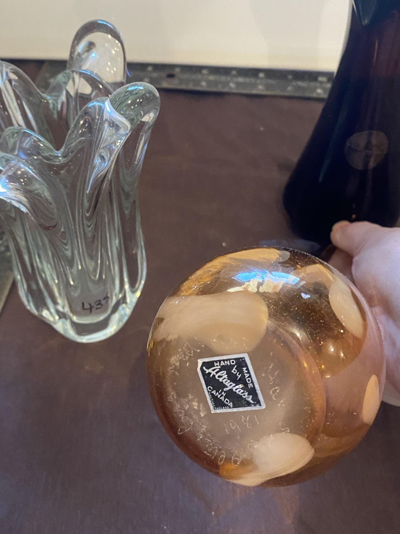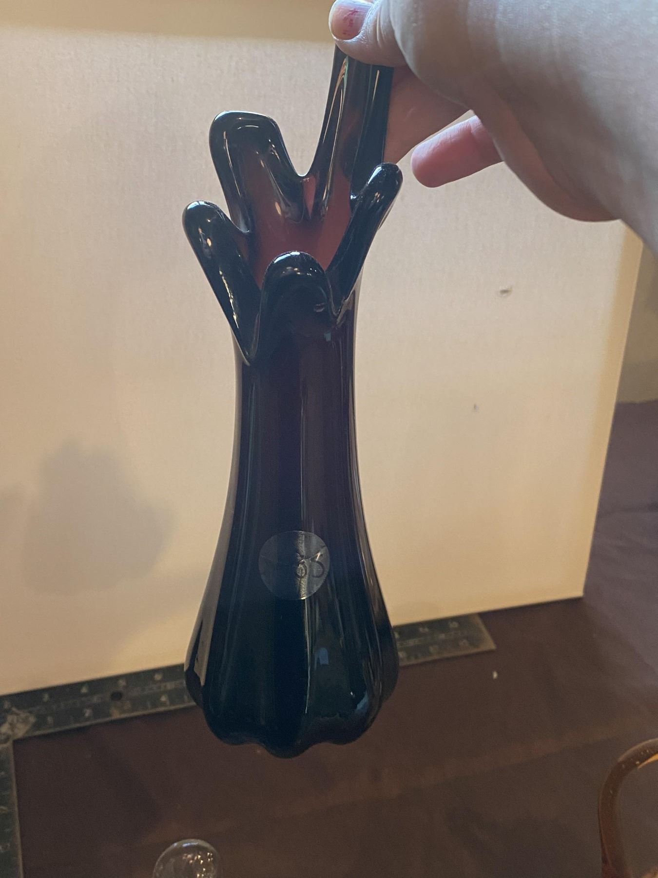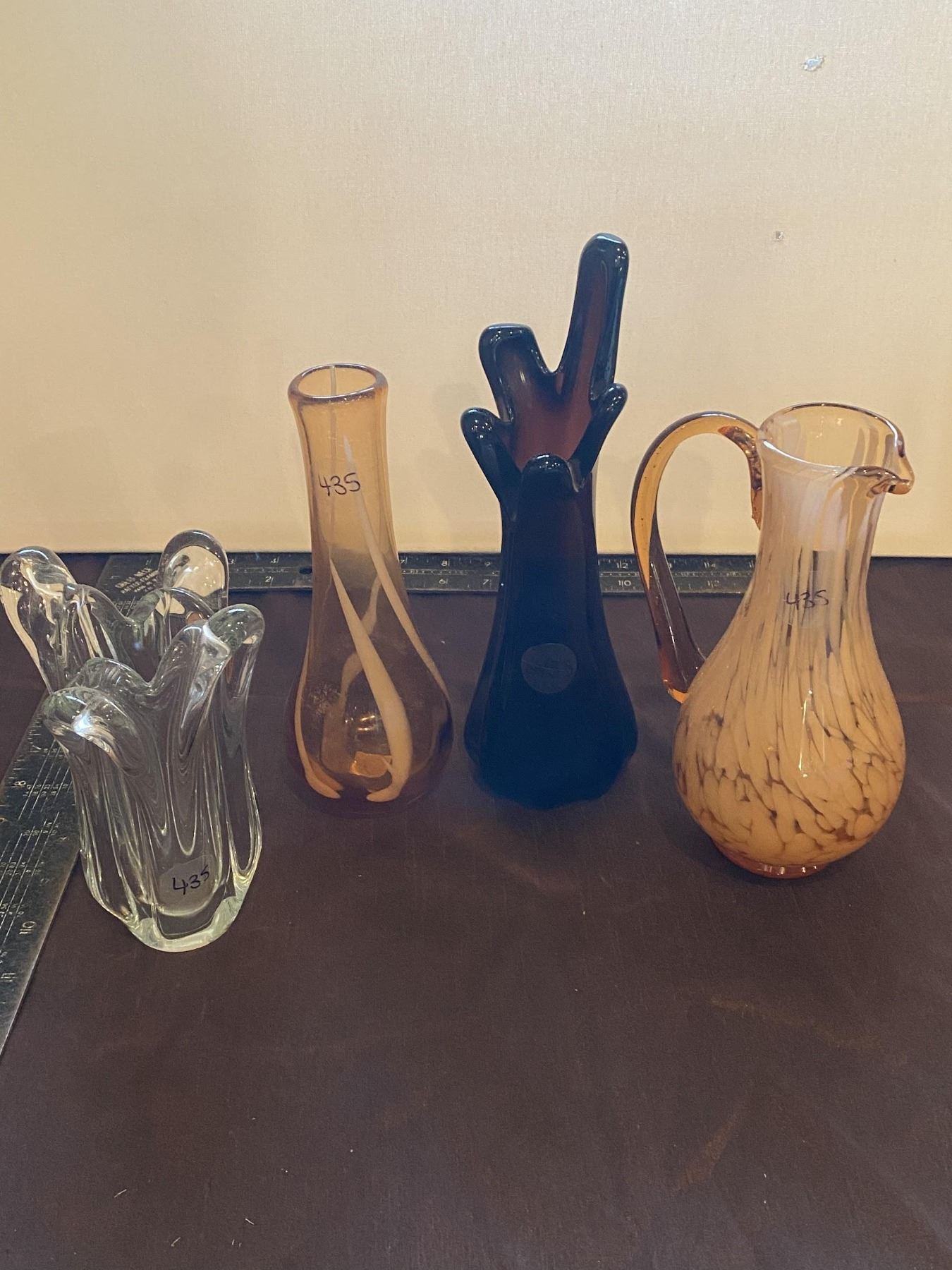 Collection of art glass. Includes three art glass vases. Includes one dark amethyst, swung glass, fingerling vase (has small chip), one clear, swung glass, fingerling vase, one handmade glass, one Alta. Glass, peach glass, signed vase, and matching glass pitcher.