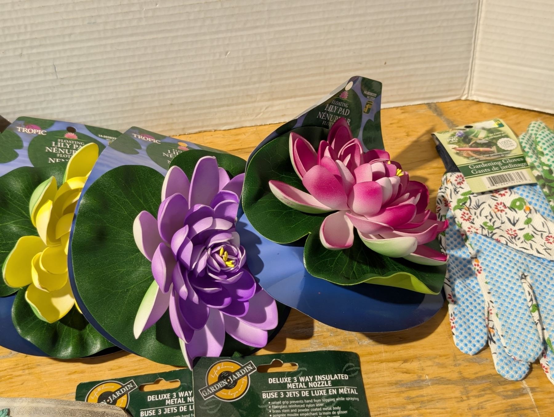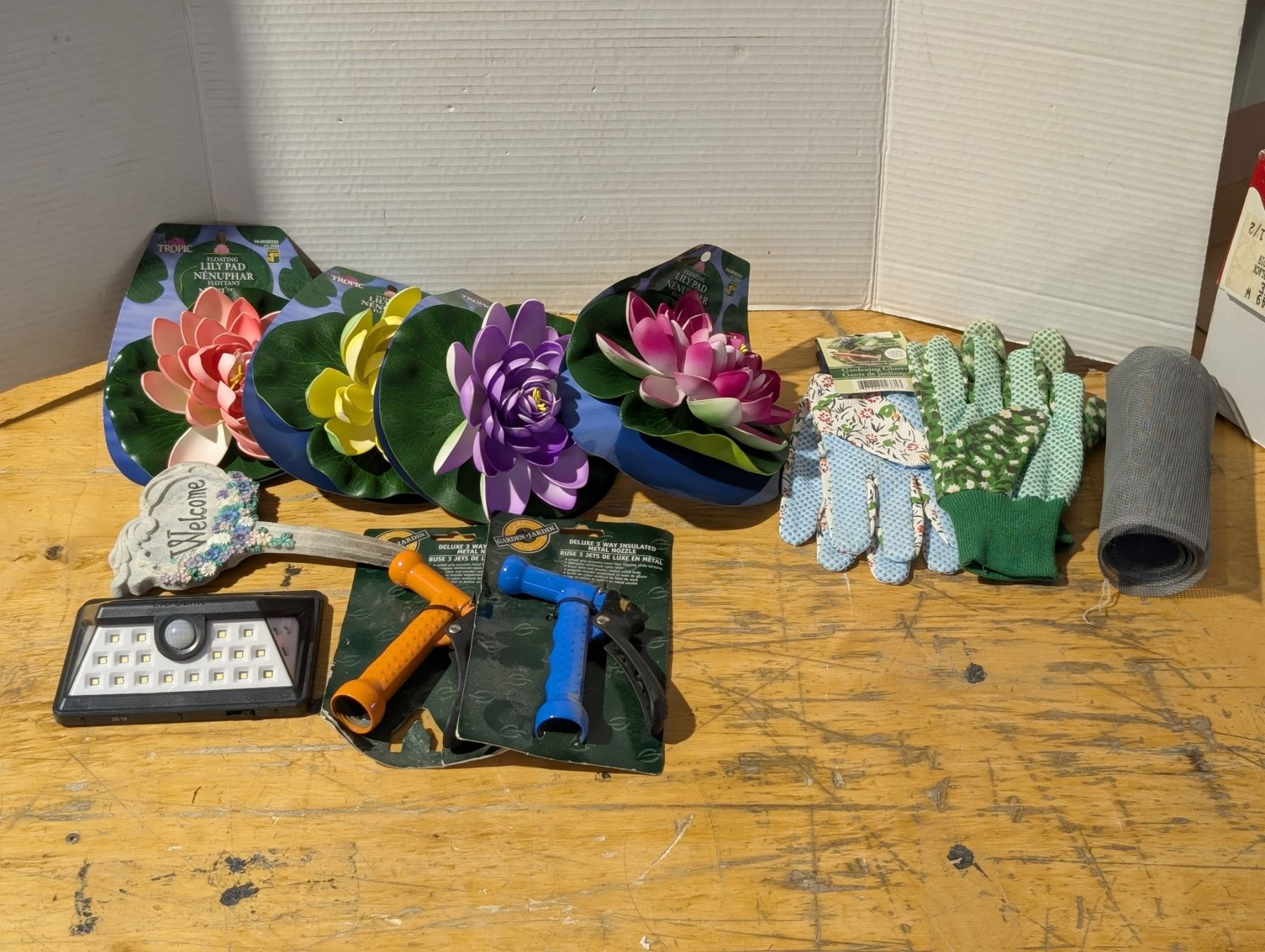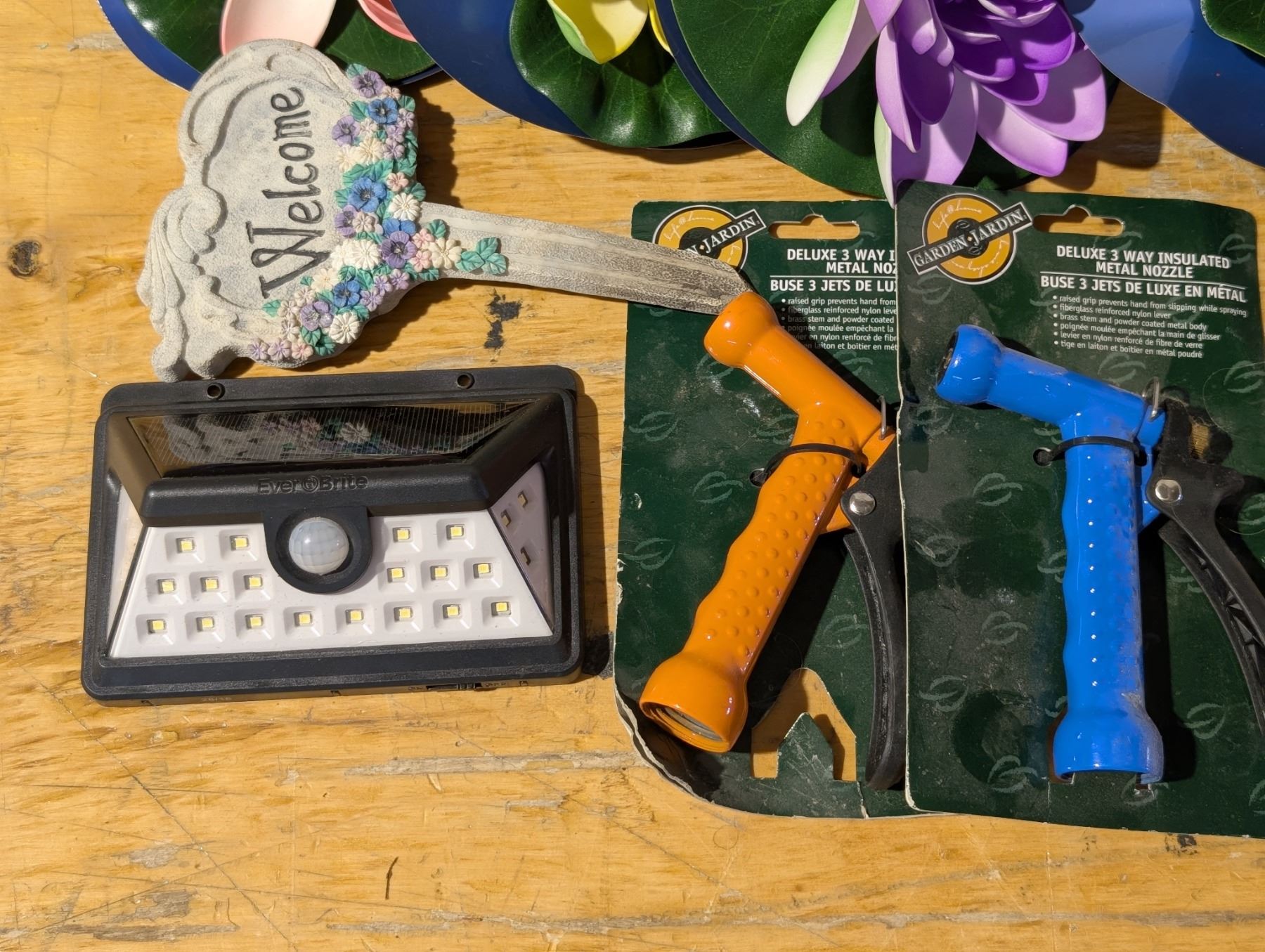 Collection of garden Items (Fake Decor Lily Pads, Metal Garden Hose Nozzles, and etc.)