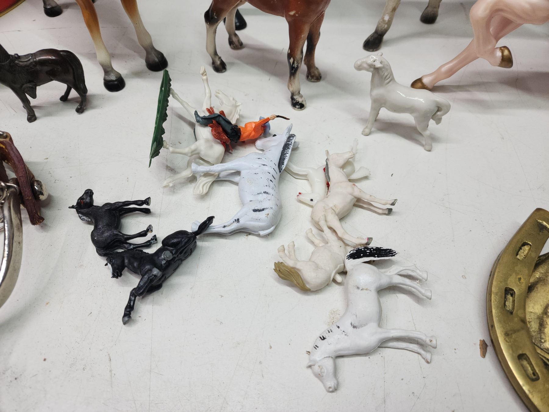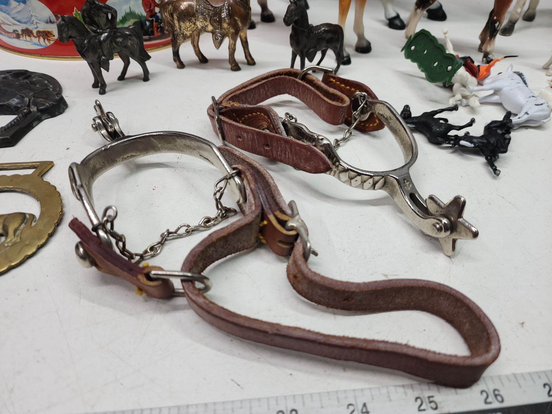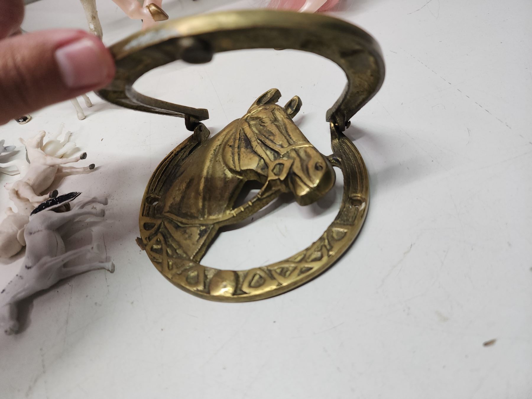 Collection of horse items - brass door knocker, toys, spurs, etc.