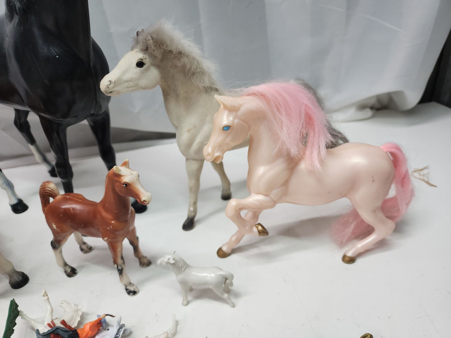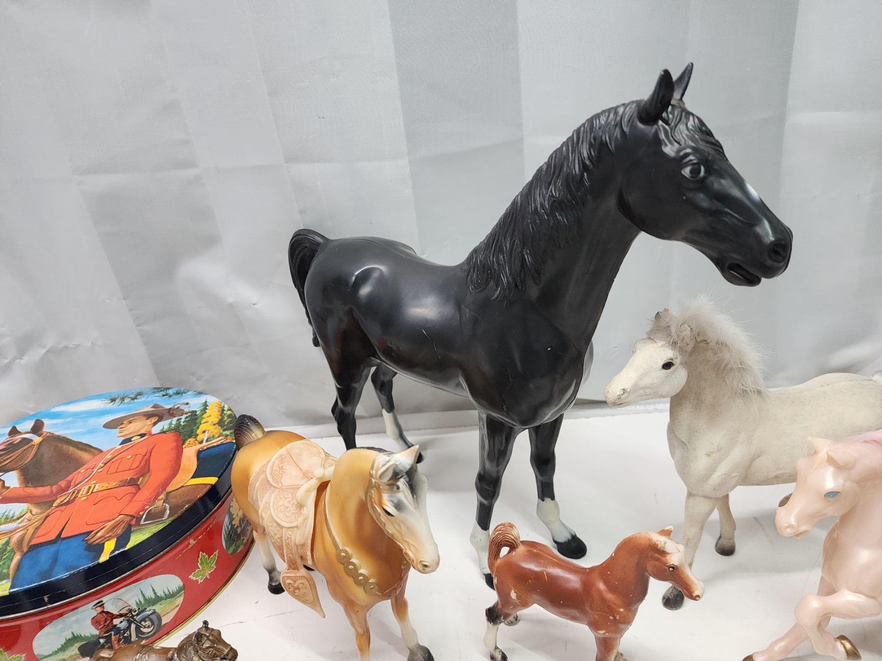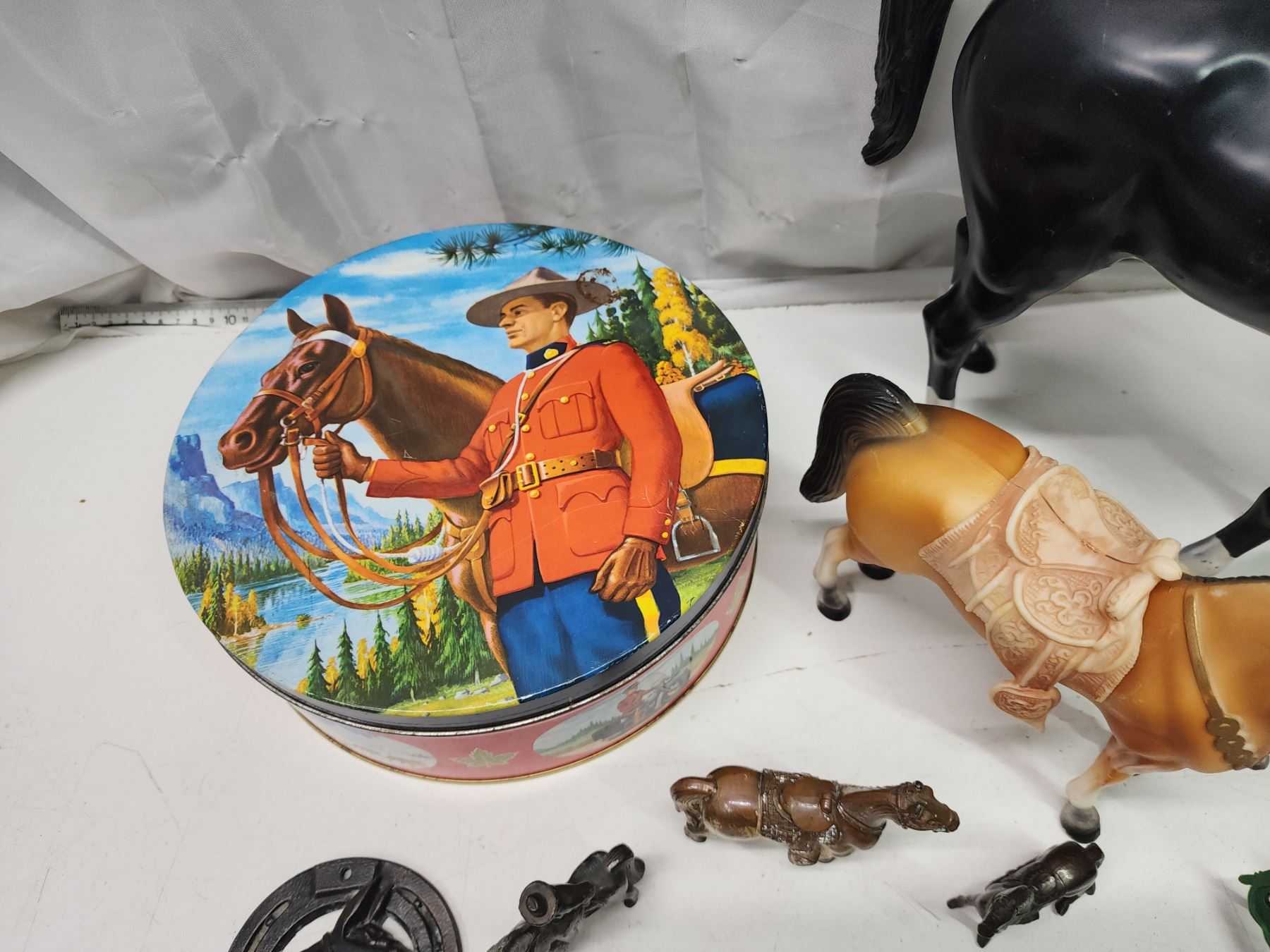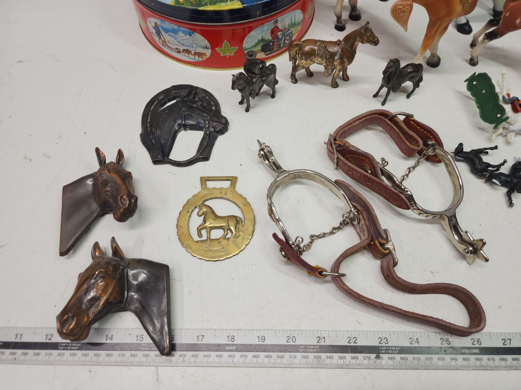 Collection of horse items - brass door knocker, toys, spurs, etc.