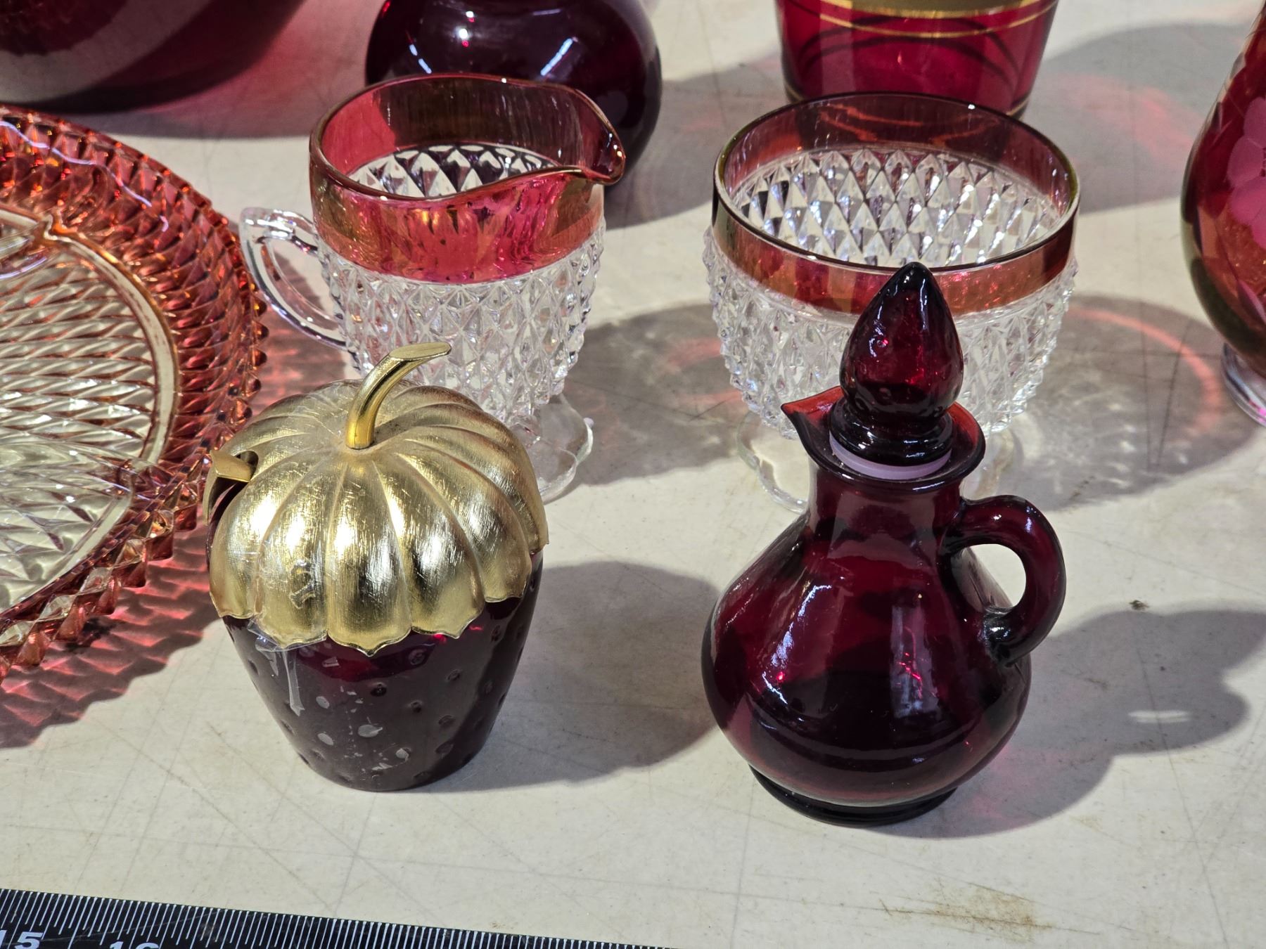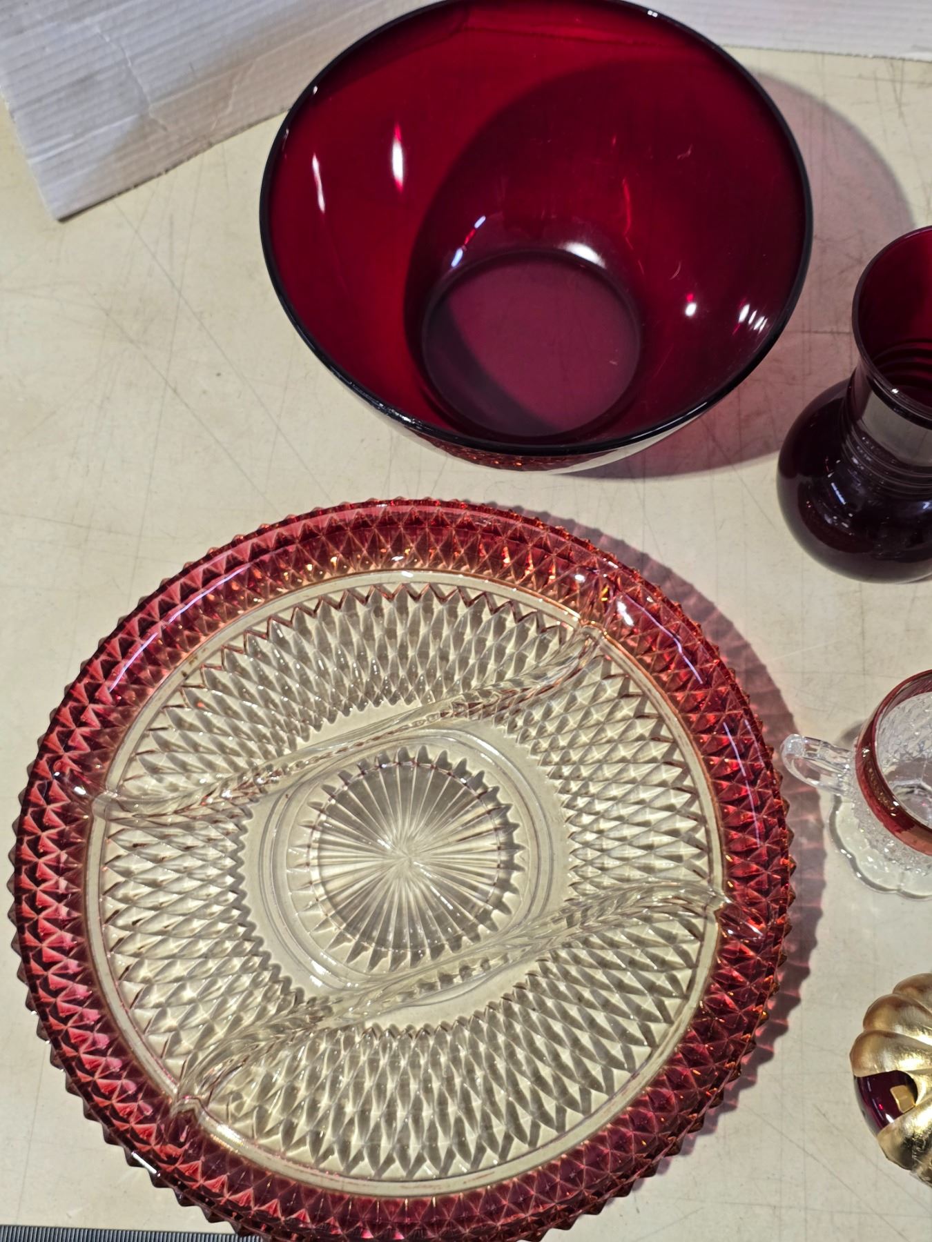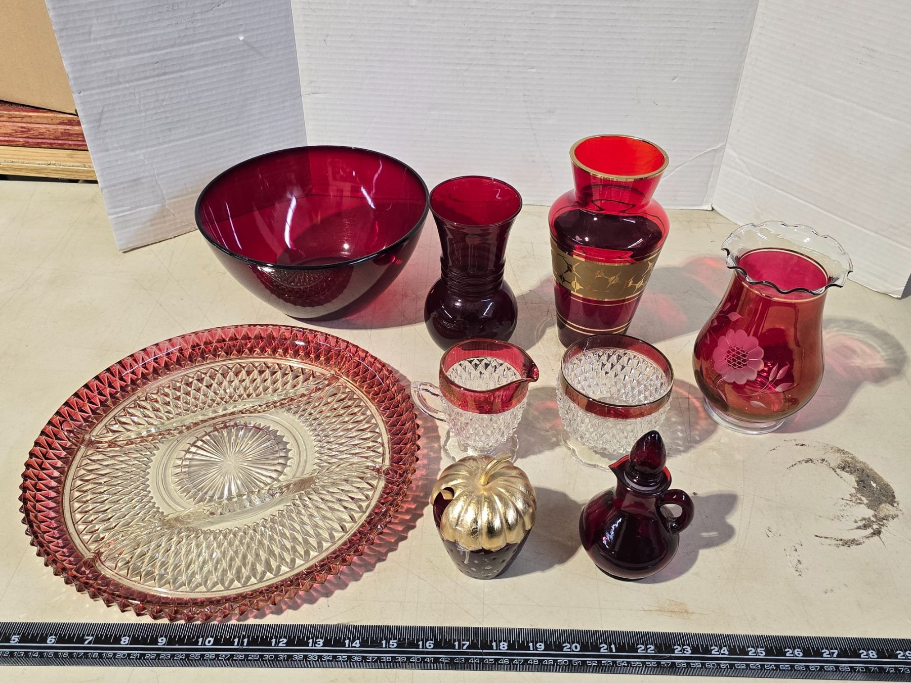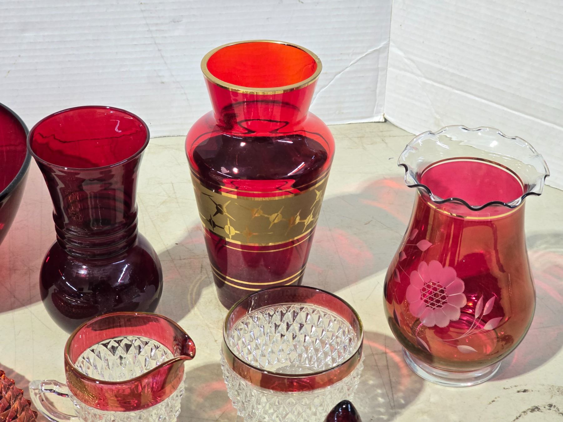 Collection of red glass wares - Vases, bowl, cream n sugar dishes, etc.