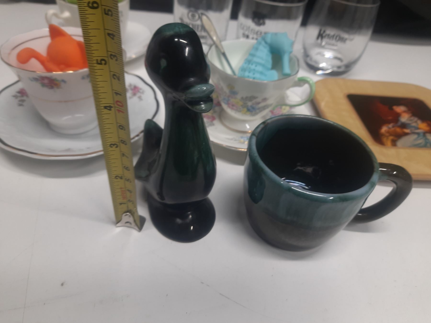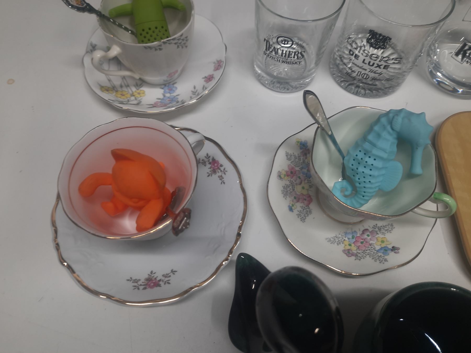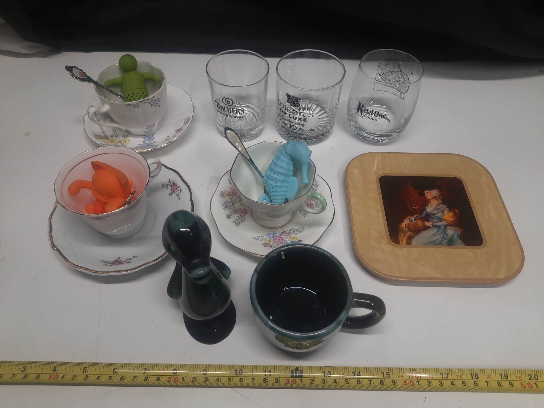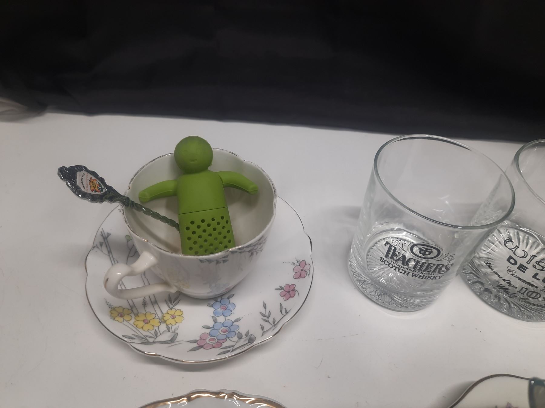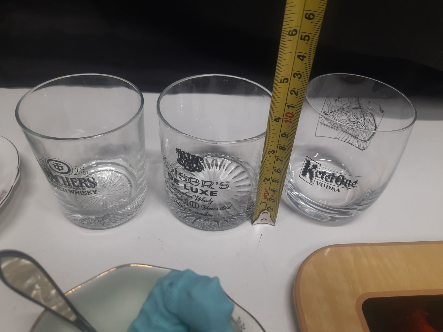Collection of vintage drinking glasses and teacups, including several branded barware glasses.