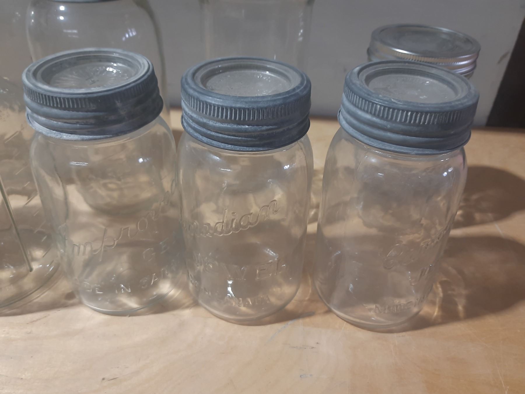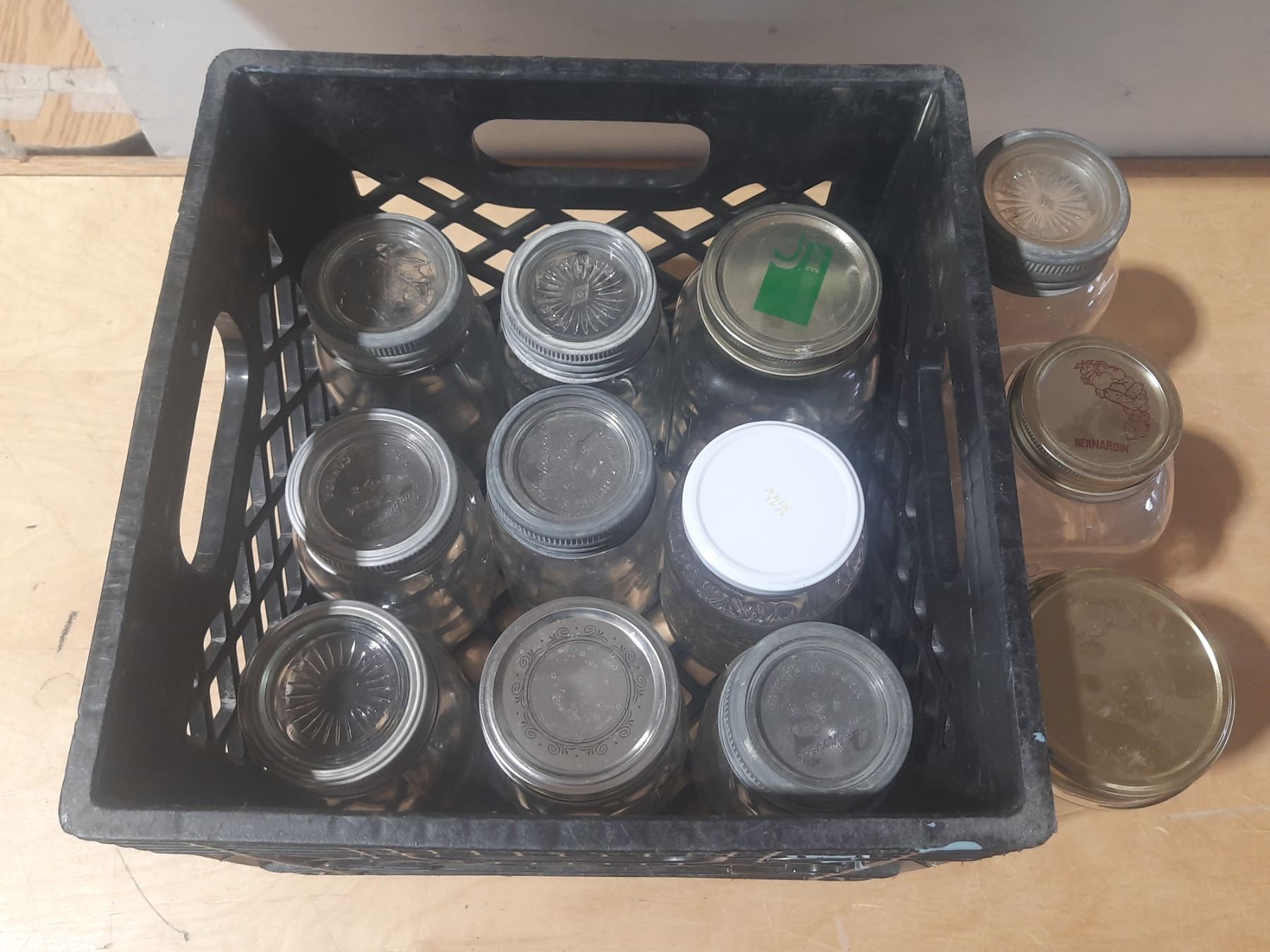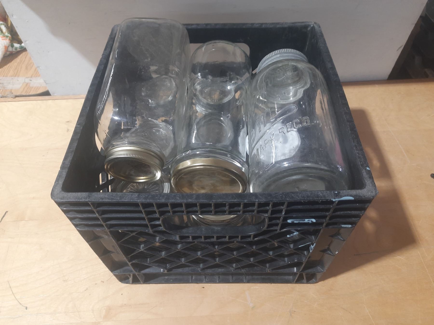 Collection of vintage glass canning jars, commonly known as Mason jars, housed within a black plastic crate.
