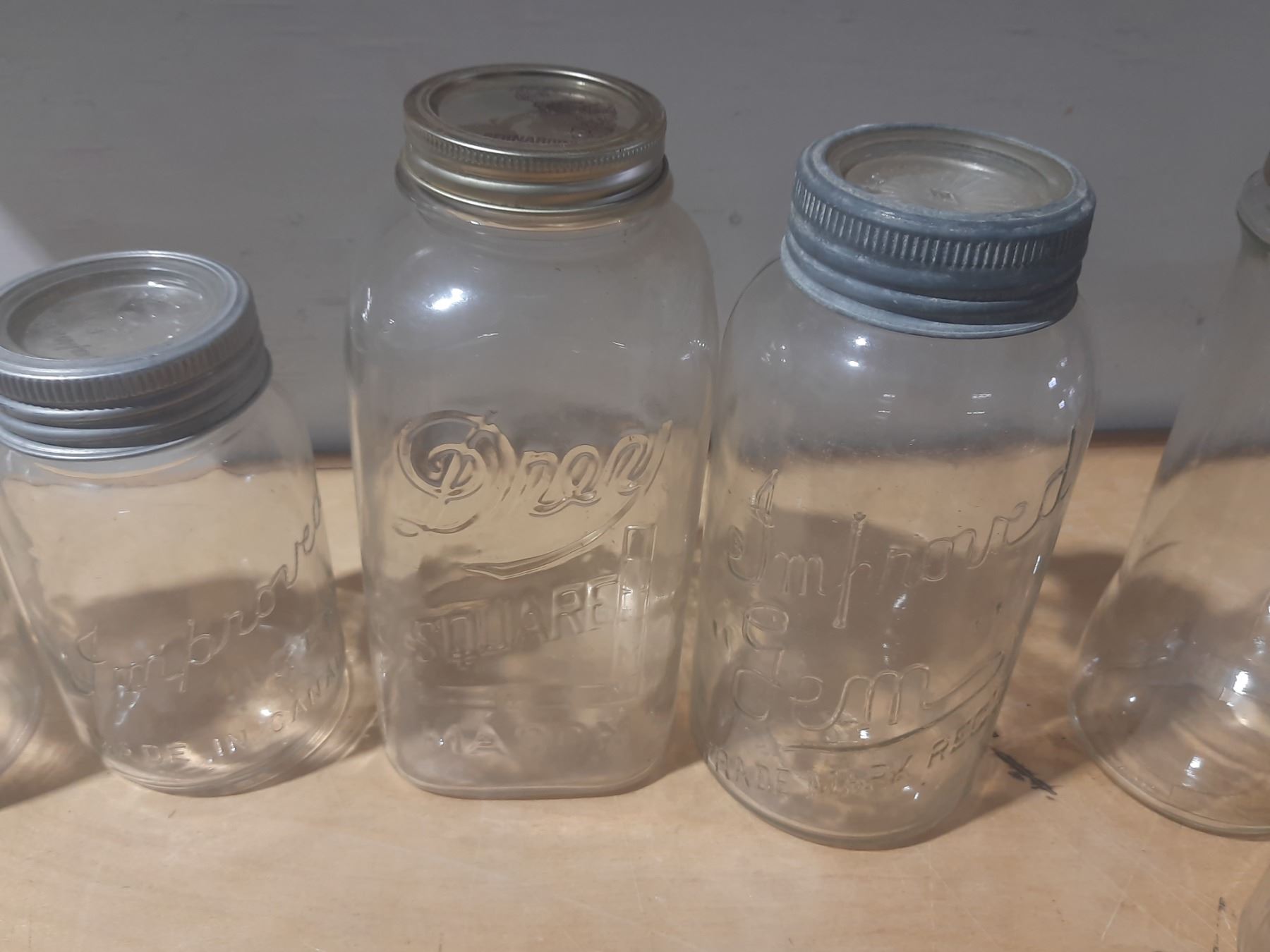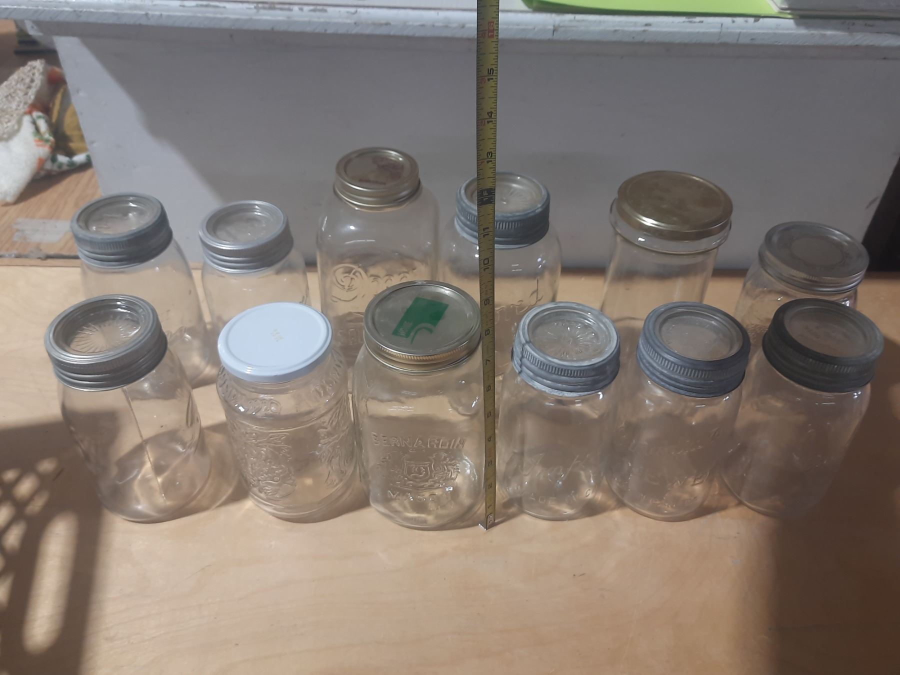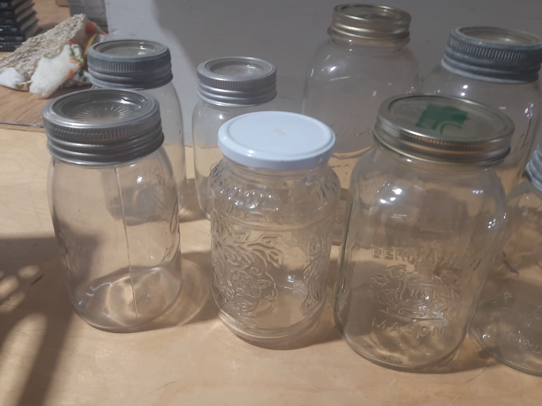 Collection of vintage glass canning jars, commonly known as Mason jars, housed within a black plastic crate.