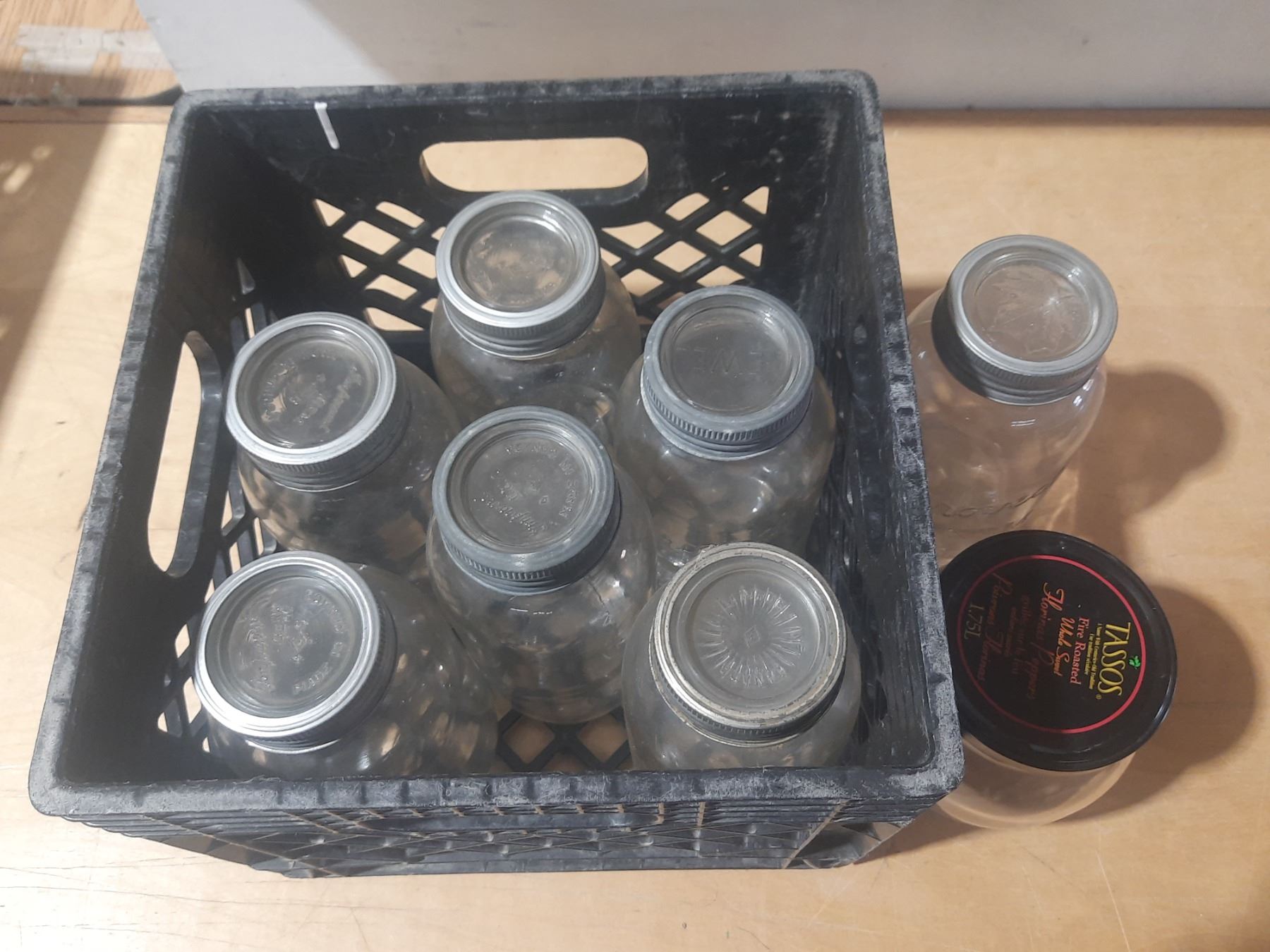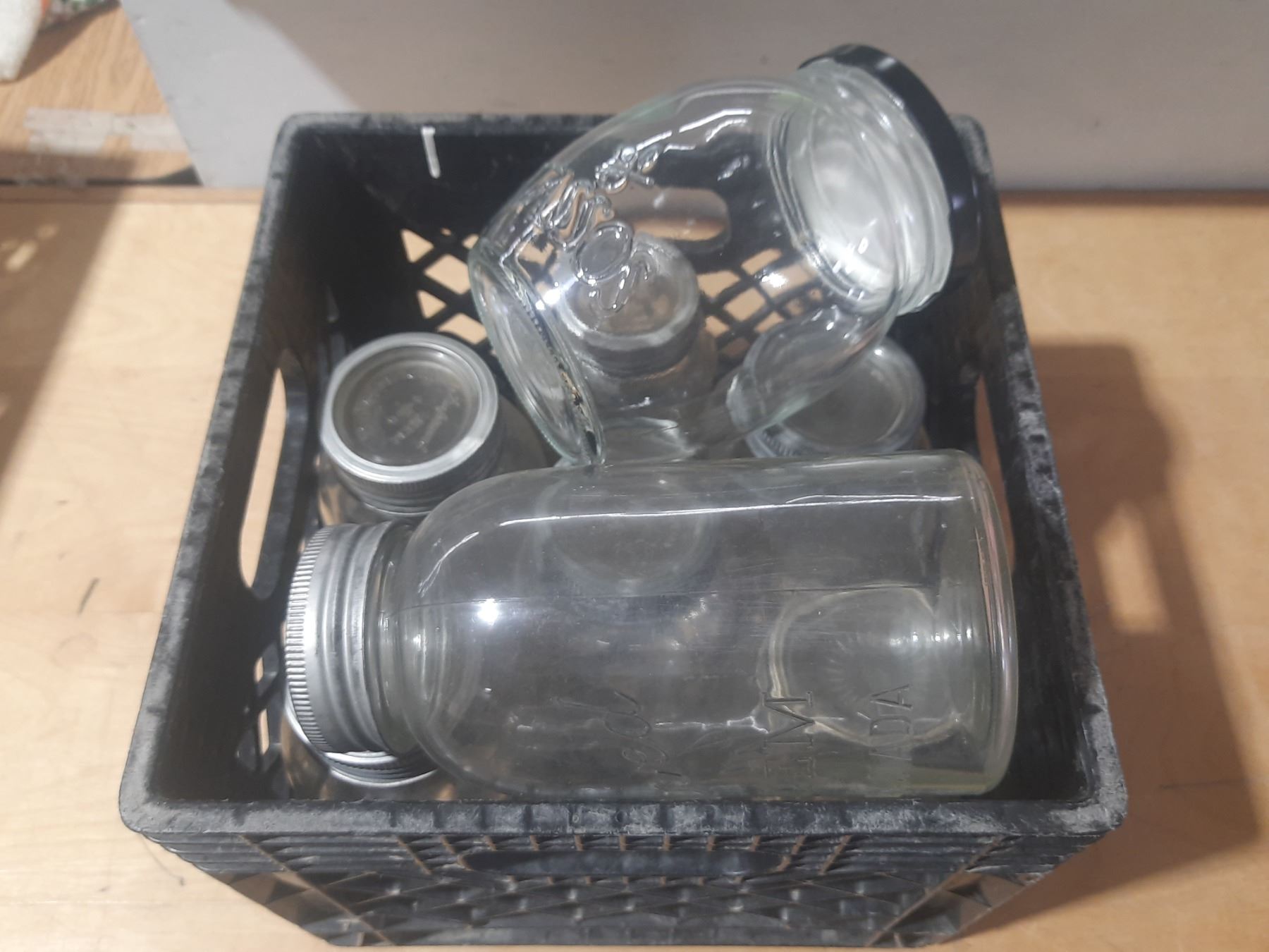 Collection of vintage glass canning jars, commonly known as Mason jars, housed within a black plastic crate.