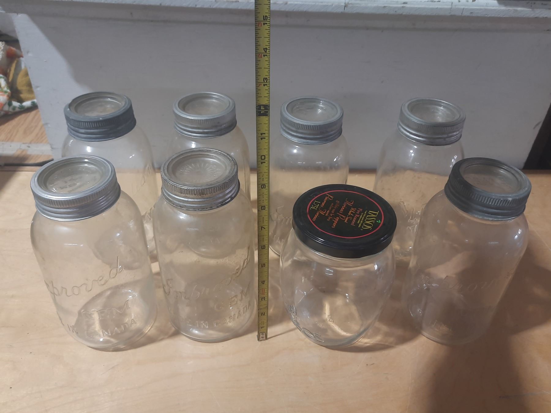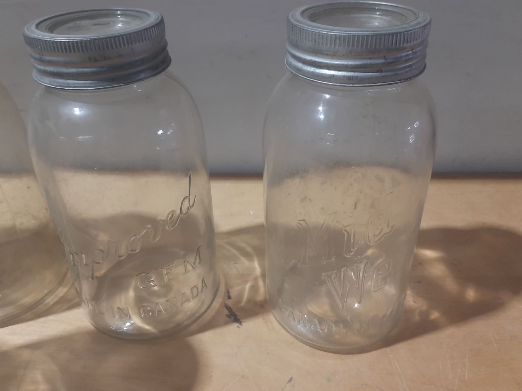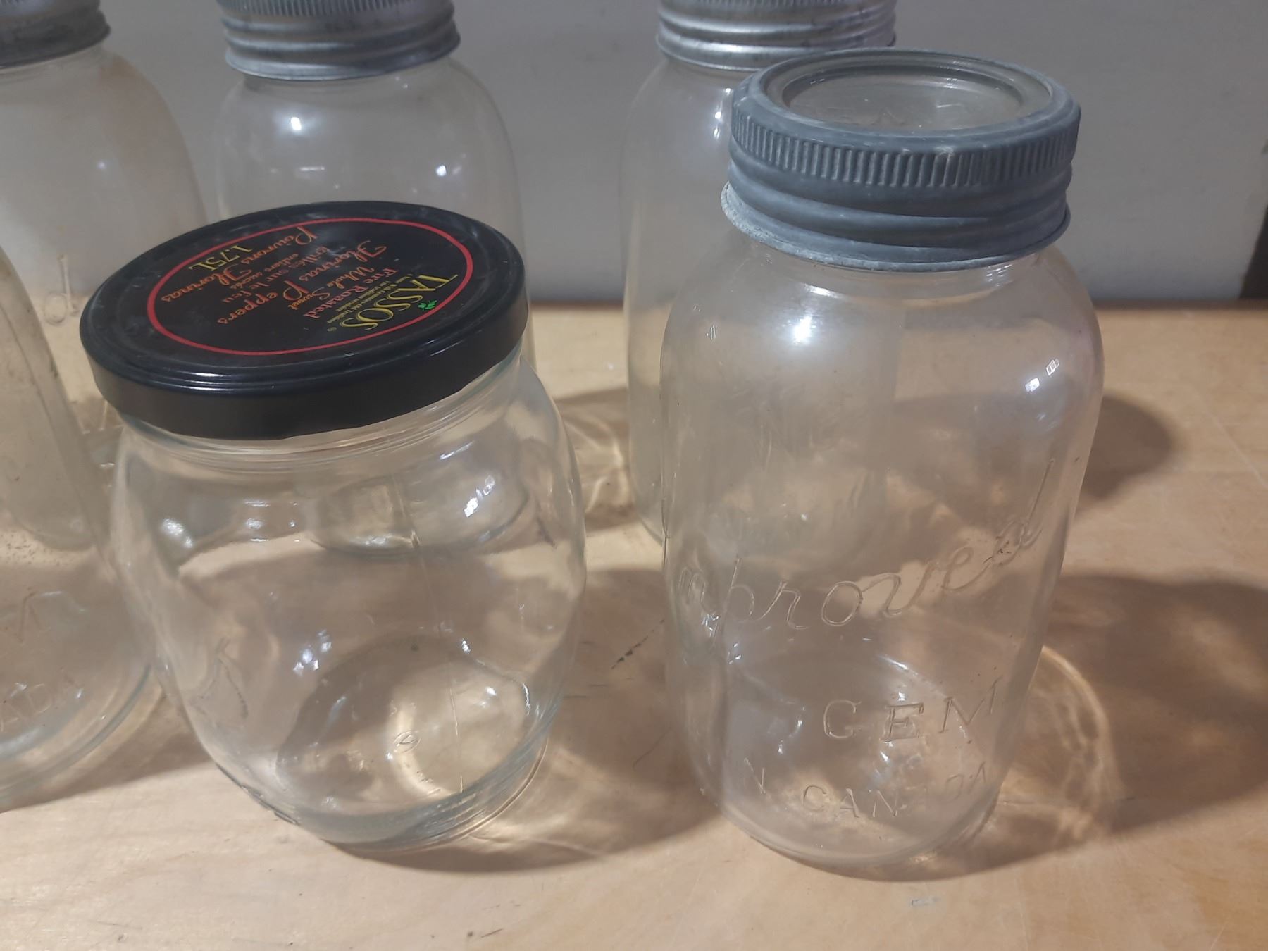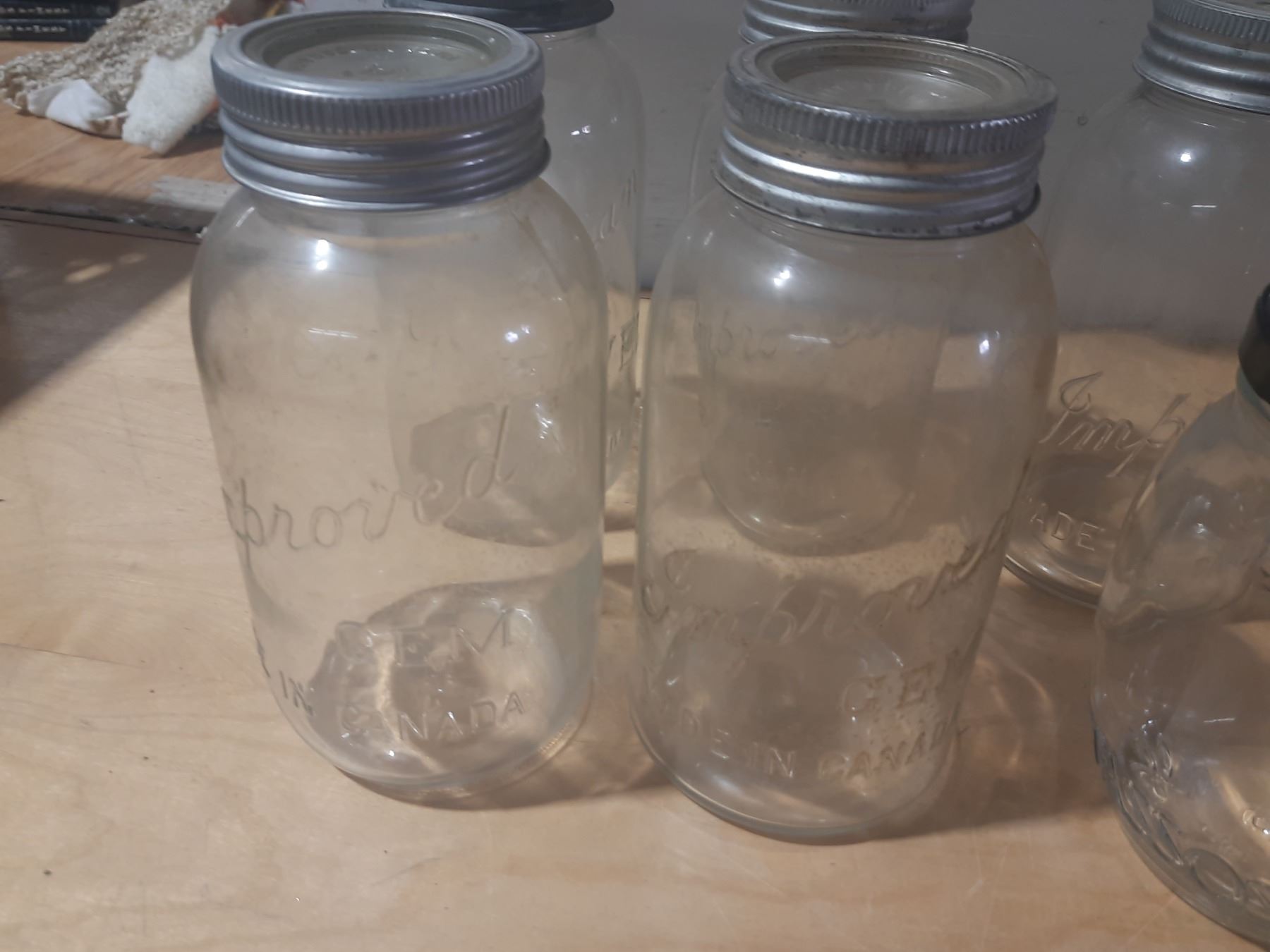 Collection of vintage glass canning jars, commonly known as Mason jars, housed within a black plasti