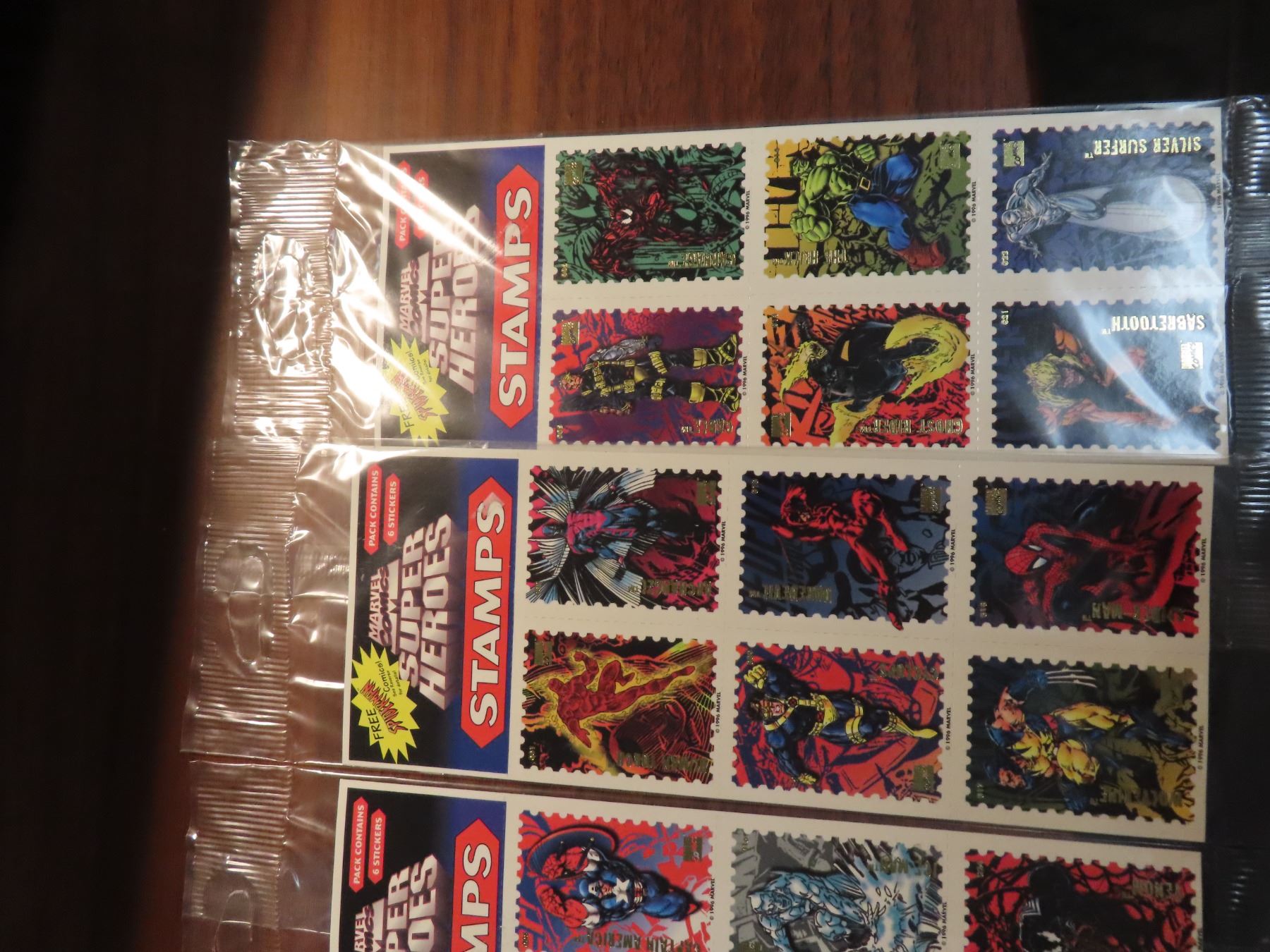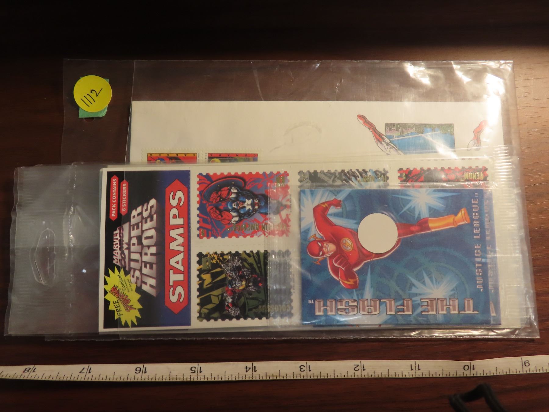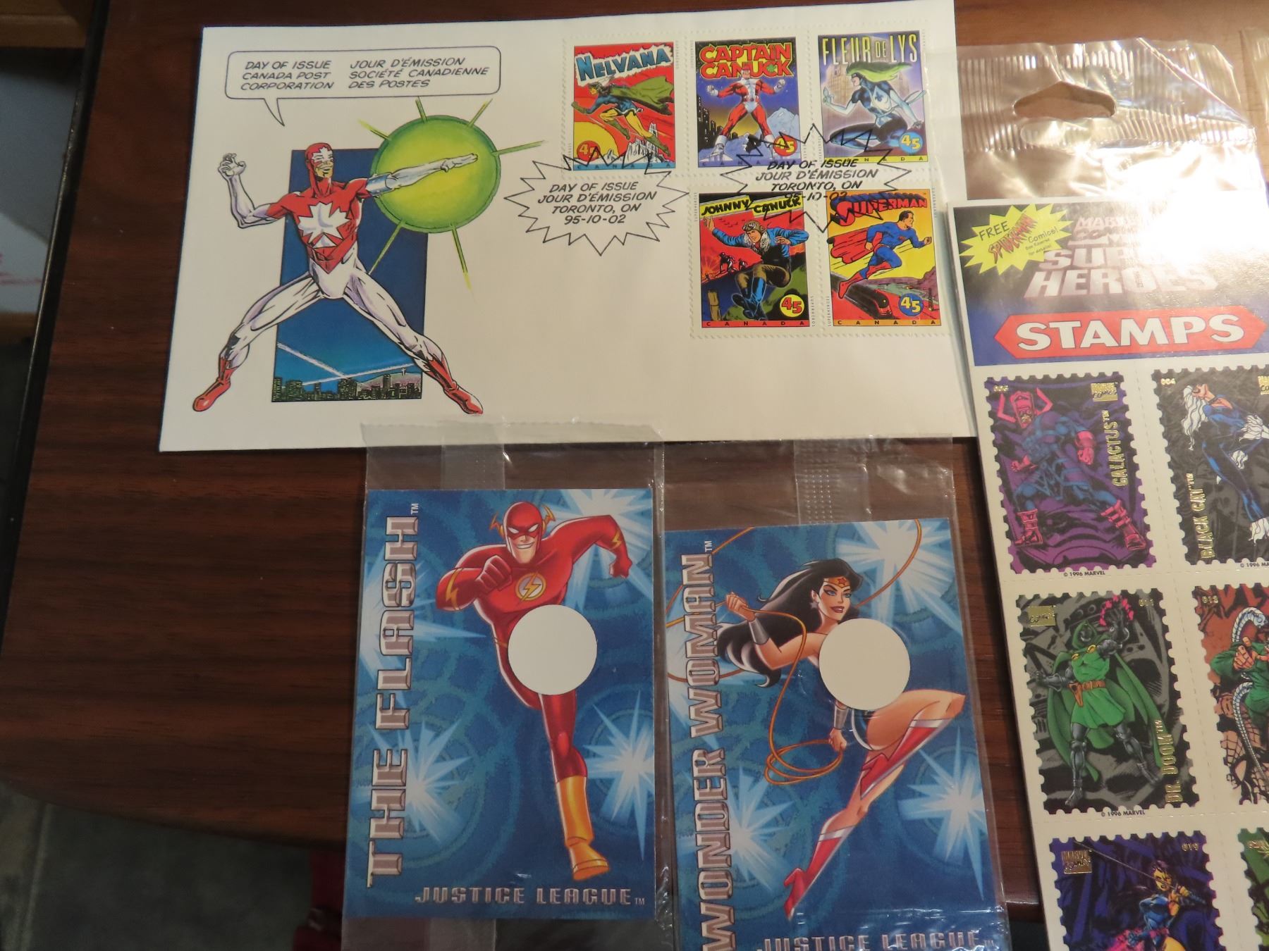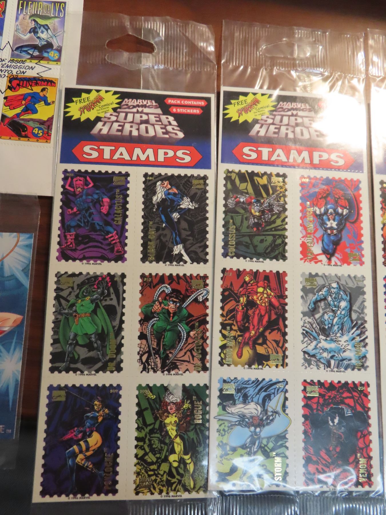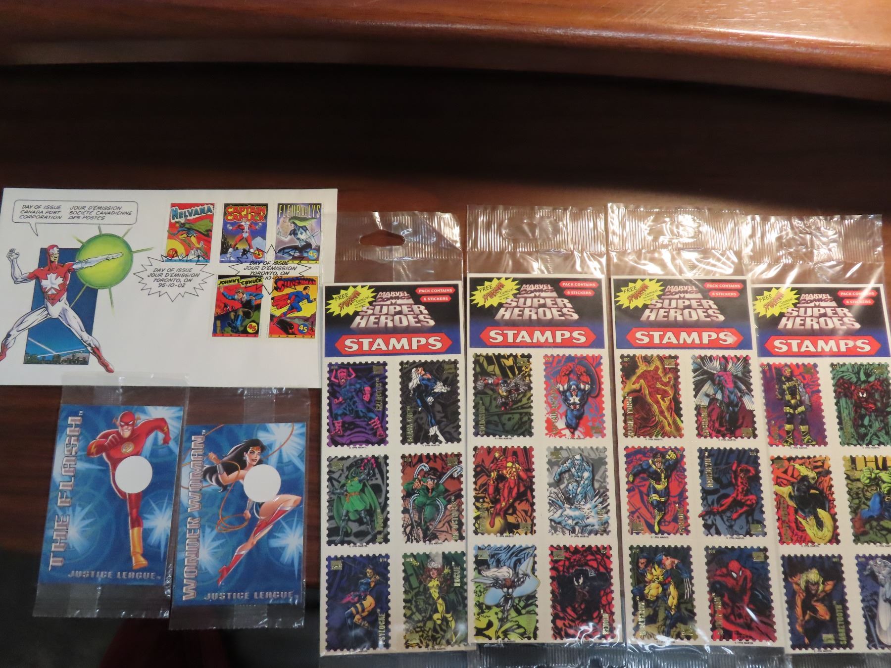 Comic book heroes 1995 on cover & 4 PKgs of marvel superheroes stamps un-opened & justice laegue cards & badges
